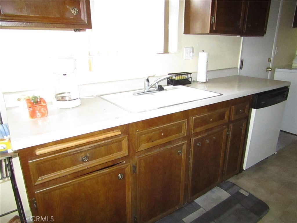 Cozy 2 bedroom house with large living room. One bedroom has patio doors to covered patio and large fenced back yard. Kitchen has dining area, with a galley type food prep area and countertops, built-in dishwasher, and microwave. Kitchen also has laundry, and door into attached garage. Bathroom has shower over tub. Newer carpet in living room and 2 bedrooms. Additional storage structure is attached to garage and covered rear patio. Back yard is large with flat useable space, surrounded by wood privacy fence. The attached garage shares a common wall with the next-door garage, as is common in this 55+ development.