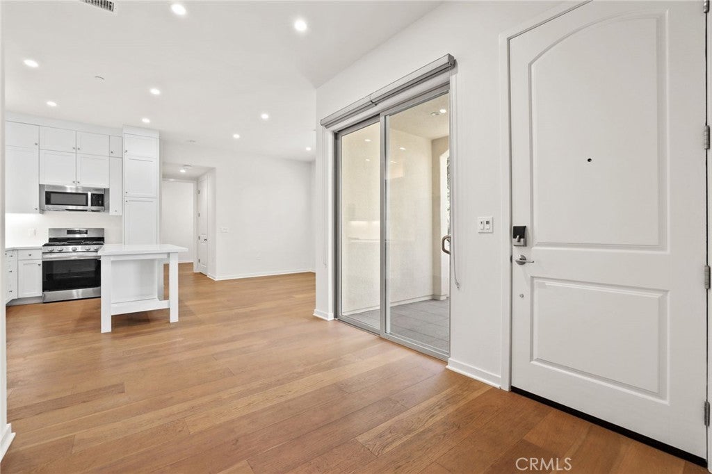 Discover refined living in this stunning former model home single-level luxury condo, featuring 2 bedrooms and 2 bathrooms. Step outside to serene landscaping and enjoy your private patio, perfect for relaxing. Inside, an open-concept layout boasts soaring ceilings, expansive windows, and premium finishes like hardwood floors and custom lighting. The gourmet kitchen impresses with high-end stainless steel appliances, quartz countertops, and an island ideal for entertaining. The master suite offers a tranquil retreat with a walk-in closet and a spa-inspired ensuite, complete with dual sinks and a frameless glass shower. The versatile second bedroom, perfect as a guest room or home office, is paired with a stylish second bathroom. Owned solar and attached two-car garage equipped EV charger. Nestled in a prestigious community, enjoy access to lush parks, private pools, spas, clubhouses, sports courts, playgrounds, picnic areas, and scenic walking/biking trails. This condo effortlessly combines elegance and comfort.