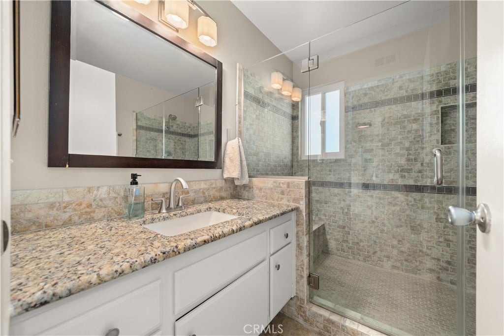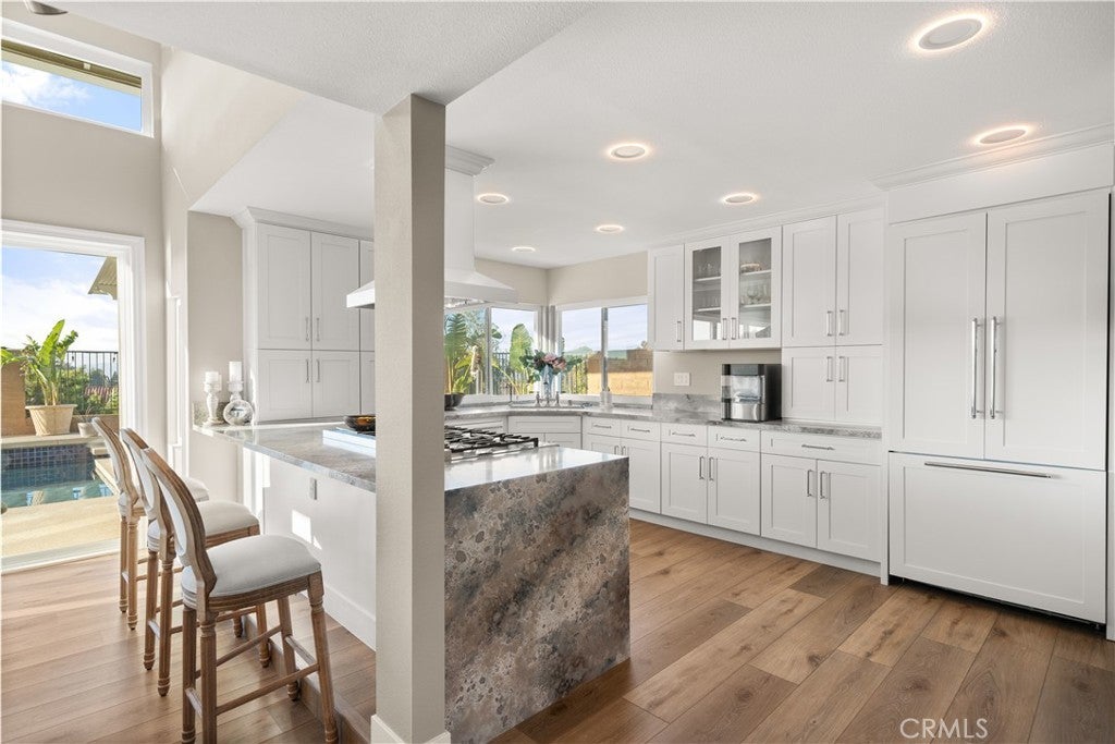 Sweeping sunset and hilltop views define this exceptional corner-lot pool home in one of Anaheim Hills most sought-after neighborhoods. Designed for comfort, privacy, and effortless entertaining, the home offers a peaceful setting paired with resort-style outdoor living. This 4-bedroom, 3.5-bath residence spans approximately 2,196 square feet on a generous 9,700 square foot lot. The main floor is anchored by an expansive living area highlighted by a striking 16-foot sliding glass door that opens fully to the backyard, creating a true indoor-outdoor lifestyle. The remodeled kitchen is thoughtfully designed for both daily living and entertaining, featuring a 6-burner dual-oven range with griddle, waterfall-edge countertops, chrome fixtures, AquaTru reverse osmosis alkaline water system, integrated glass washer, and smart cabinetry with tower storage and pull-out shelving. A separate formal dining space provides additional room for gatherings. A main-level bedroom includes its own fireplace, backyard access, and an ensuite bath, along with a convenient guest half bath. Upstairs, the primary suite enjoys mountain views, vaulted ceilings, a walk-in closet, and a spacious bathroom with dual sinks, soaking tub, vanity area, and separate shower. Two additional bedrooms share an updated hall bath. Luxury vinyl flooring runs throughout the home. The attached 3 car garage offers epoxy flooring, EV charging capability, and laundry with direct interior access. The backyard is a private retreat with a sparkling pool and spa, complemented by a new aluminum patio cover featuring built-in lighting, outlets, and a ceiling fan, ideal for entertaining or relaxing evenings outdoors. Located near top-rated schools, shopping, dining, parks, golf courses, and Santa Ana Mountain hiking trails, with convenient access to the 91 freeway. Pride of ownership shines throughout this Anaheim Hills gem. Don’t miss the opportunity to own a home that combines views, upgrades, and location in one remarkable package.