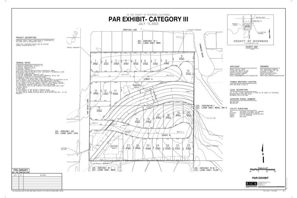 Property is vacant. Approx 9.5 acres on 2 parcels. Parcel #'s 963-020-006 and 963-020-007. PAR was in initially started with the County of Riverside to build a subdivision of approx 27 residential units. PAR notes can be provided.