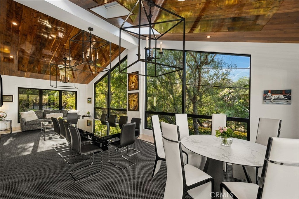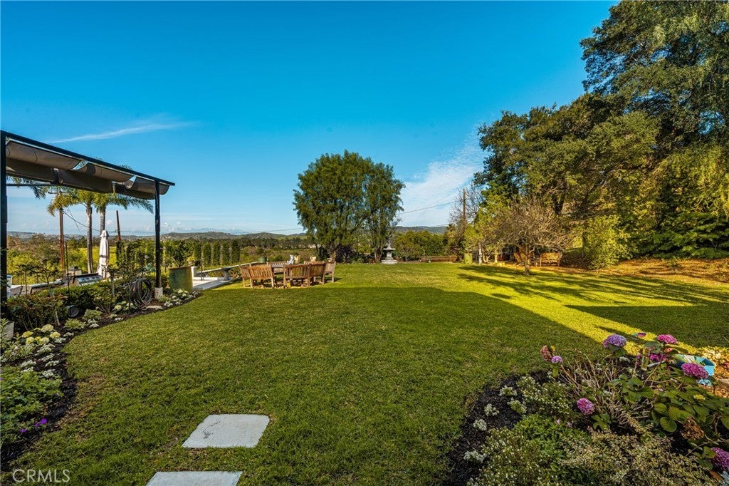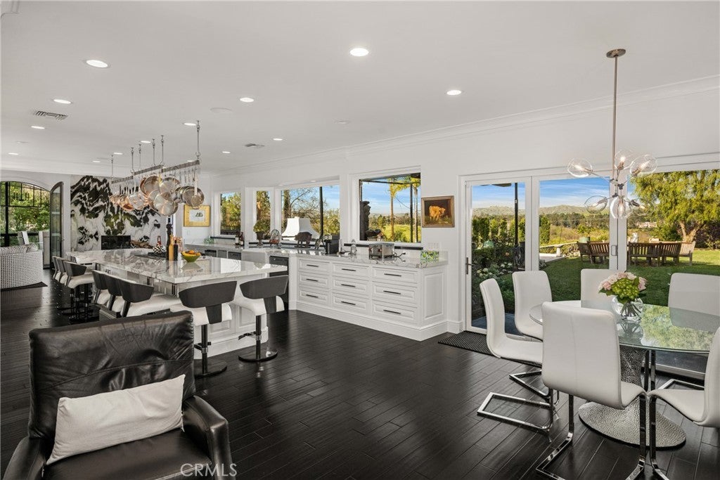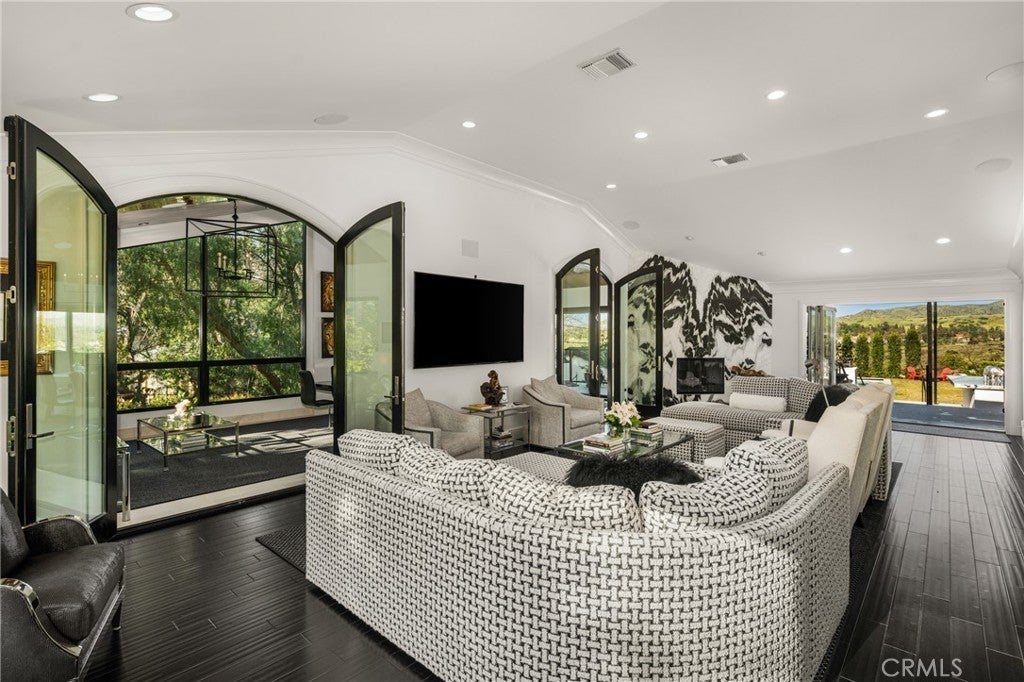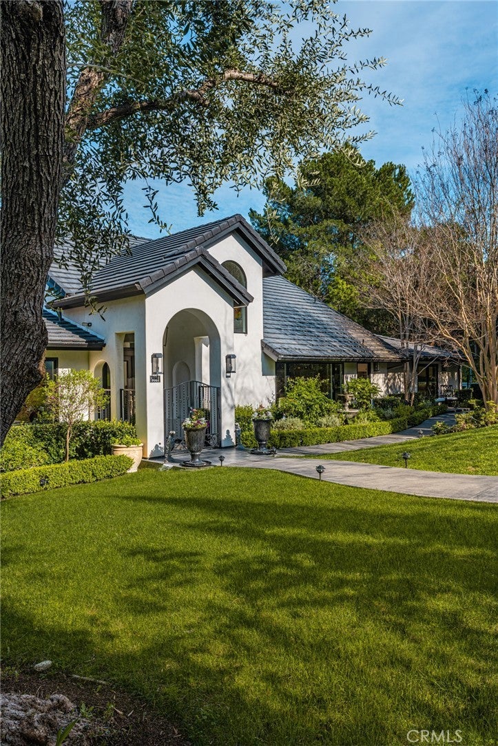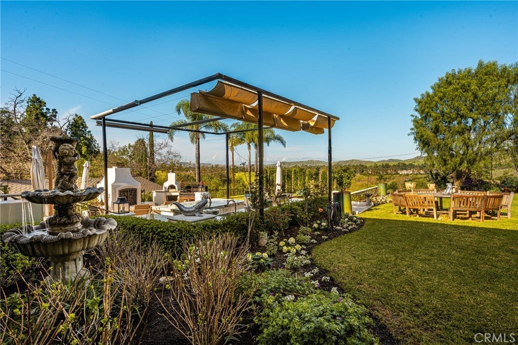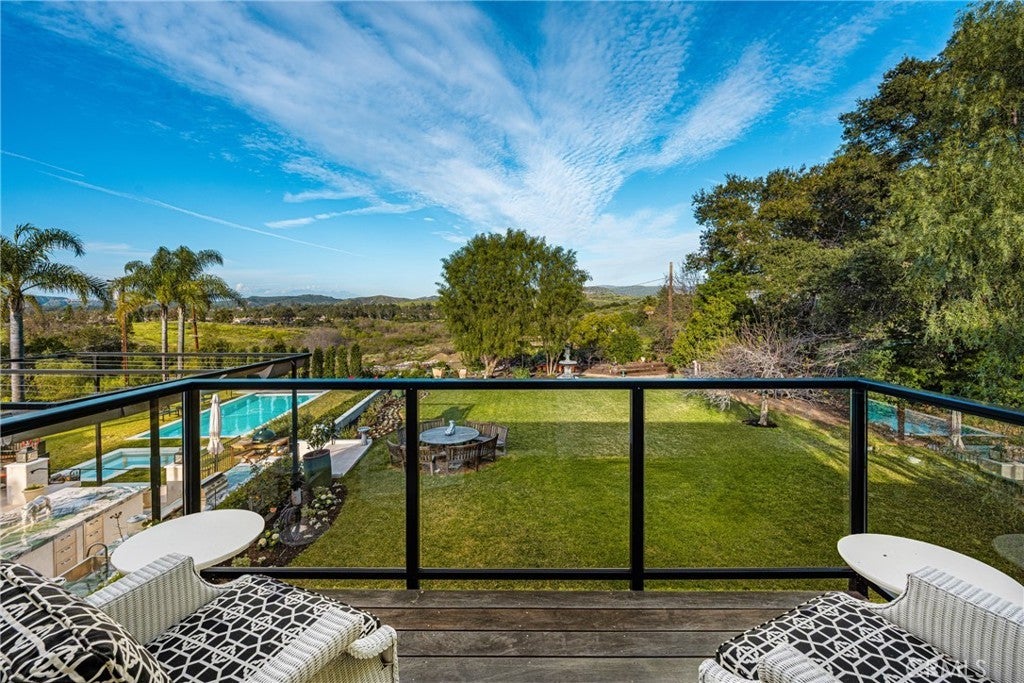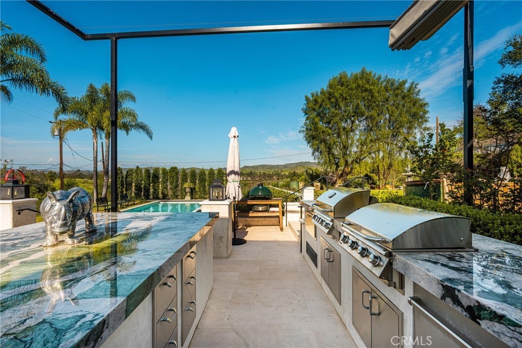 Set along the edge of Peters Canyon Reserve, this move-in ready luxury estate spanning .94 acres captures sweeping views of rolling hills, mountains and meadows in a setting that feels both peaceful and connected. The architecture is refined yet clean, executed with superb materials and meticulous attention to detail. The homes interior and furnishings were curated by a renowned Newport Beach designer, reflecting a balanced blend of sophistication and warmth. Custom millwork and cabinetry, inlaid stone, and hardwood flooring,and Anderson french doors and windows complement expansive walls of glass that bathe the interiors in natural light. Retractable custom glass doors create a seamless transition between indoors and out, extending the living spaces to generous terraces of limestone designed for both everyday enjoyment and elegant entertaining. Designed to live primarily as a single-story residence, the home offers all main living areas and secondary bedrooms onthe first leve, with only the private primary suite situated upstairs-creating a peaceful retreat elevated above the surrounding landscape. AN EXTENSIVE RENOVATION BY THE CURRENT OWNER INTRODUCED A THOUGHTFULLY REIMAGINED OPEN FLOOR PLAN WITH SOARING CEILINGS, A PRIVATE OFFICE AND DEDICATED EXERCISE ROOM IN ADDITION TO THE THREE BEAUTIFULLY APPOINTED BEDROOMS. The backyard unfolds as a private resort A sparkling pool and spa with limestone coping echo the terrace finishes, while multiple lounge areas and an expansive patio create an extrordinary environment. The fully integrated outdoor kitchen is outfitted with dual barbeque, refrigerators, dishwashers, and stainless steel cabinetry beneath striking slabs of richly colored malachite quartz countertops. ADJACENT TO THE ENTERTAINIG AREA, A RARE FLAT GRASSY LAWN- so seldom found on even other large properties -offers space for recreation, gatherings and endless other possibilities.