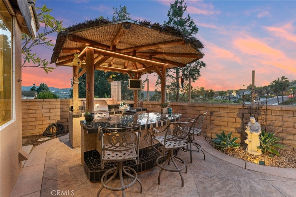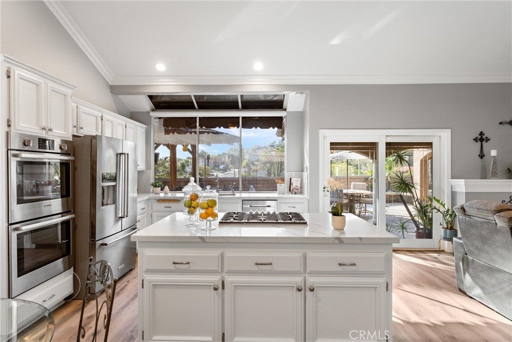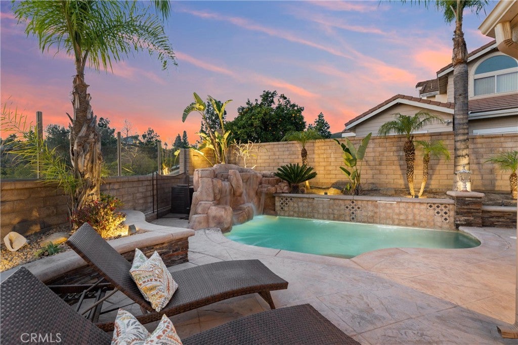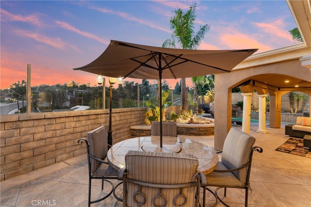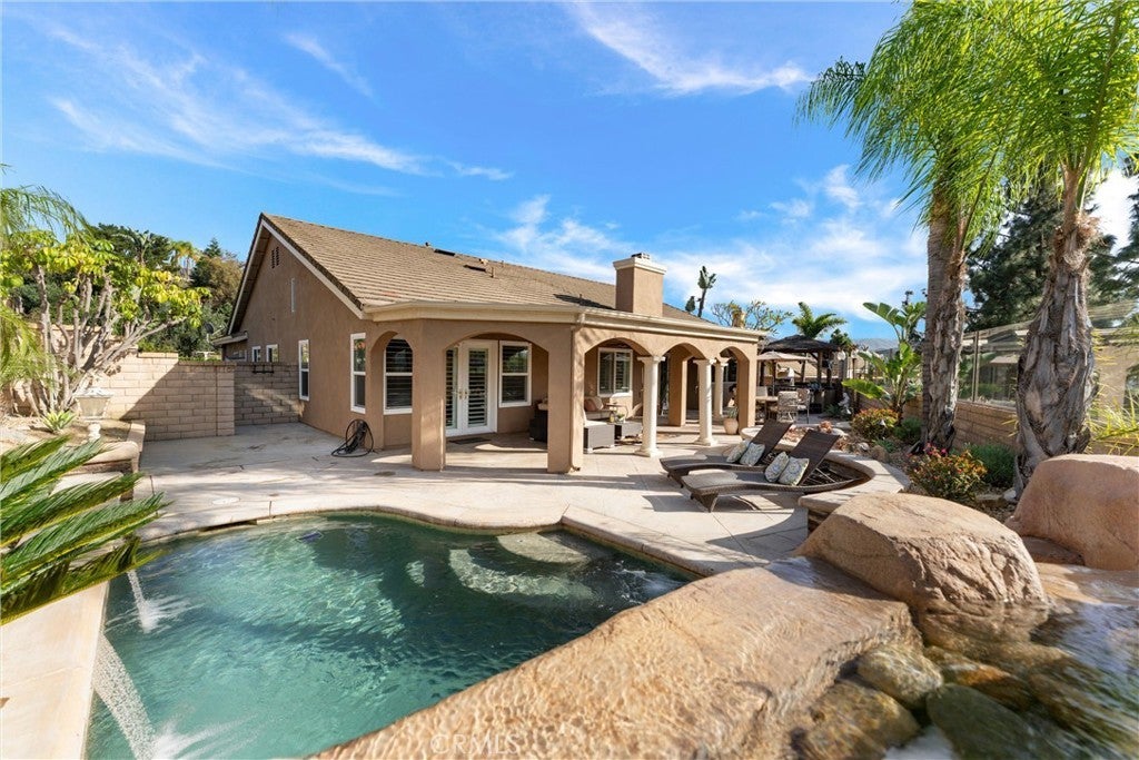 This one truly checks all the boxes. Nestled on a quiet cul-de-sac, this beautifully maintained single-level home offers 2,421 square feet of thoughtfully designed living space, featuring 4 bedrooms, 2.5 bathrooms, and a 3-car garage plus RV parking potential—the perfect blend of comfort, functionality, and timeless style. A backard oasis perfect for entertaining with a pool/spa combo with waterfalls and jets, covered patio and palapa with built in bbq and bar area. Curb appeal shines with a brick front porch and entry, welcoming you through double doors with stained glass, a grand chandelier, and an elegant arched window. Inside, light-filled living spaces showcase vaulted and cathedral ceilings, crown molding, and plantation shutters throughout. The formal living room features soaring vaulted ceilings, while the formal dining room impresses with cathedral ceilings, a statement chandelier, and a large arched window with secure glass and plantation shutters—ideal for entertaining. The chef’s kitchen boasts vaulted ceilings, crown molding, quartz countertops, stainless steel appliances including a double oven, stainless sink, ceiling fan, plantation shutters, and custom shades. The kitchen opens to the adjacent family room, complete with a ceiling fan and a gas fireplace with mantle and hearth, creating a warm and inviting gathering space. The primary suite is a private retreat featuring vaulted ceilings, crown molding, mirrored closet doors, plantation shutters, and French doors leading to the backyard. The spa-inspired primary bathroom includes a soaking tub, large walk-in shower with travertine and mosaic inlay tile, dual sinks with granite countertops, a custom built-in vanity, upgraded fixtures, and a walk-in closet. Secondary bedrooms are generously sized, each with ceiling fans, crown molding, and mirrored wardrobe doors. The secondary bathroom offers dual sinks, quartz countertops, a tub/shower combo, crown molding, and newer fixtures. A stylish powder room features travertine floors and a built-in vanity with granite countertops. Additional highlights include an indoor laundry room with utility sink, abundant storage, and a highly desirable single-story floor plan in one of Yorba Linda’s most sought-after neighborhoods. A rare opportunity to own a turn-key home where location, layout, and upgrades come together seamlessly.