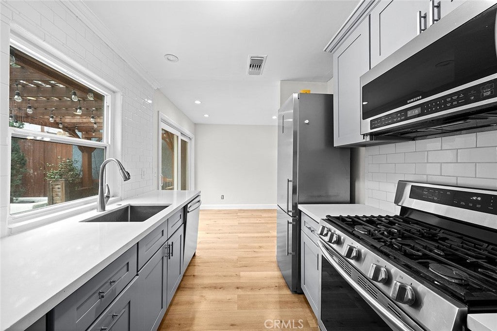 Nestled in the highly sought-after Victoria Park community of Rancho Cucamonga, this stunning 3-bedroom, 2.5-bathroom residence combines modern luxury with effortless comfort. From the moment you arrive, the impeccable curb appeal—featuring fresh exterior paint and an extra-wide driveway—sets the stage for what’s inside. Step through the front door to find a light-filled, open floor plan accentuated by vaulted ceilings and stylish, upgraded flooring throughout. The entire interior has a crisp, turnkey canvas for its next owners. At the heart of the home is a remodeled kitchen, complete with premium stainless steel appliances and ample workspace for the home chef. Every detail has been addressed for year-round comfort, including energy-efficient dual-pane windows and sliders, and a high-performance Trane XR A/C system. Even the attached 2-car garage has been upgraded with sleek, durable epoxy flooring. The expansive backyard is an entertainer's dream! Relax under the elegant pergola or gazebo, while the kids enjoy the charming built-in playhouse. The lush synthetic grass ensures a vibrant, green landscape year-round with virtually no maintenance. Location is everything! You are minutes away from the prestigious Etiwanda School District, premier shopping and dining at Victoria Gardens, scenic local parks, and easy freeway access for a seamless commute. Don’t miss your chance to own this turnkey masterpiece in one of Rancho Cucamonga’s favorite neighborhoods.