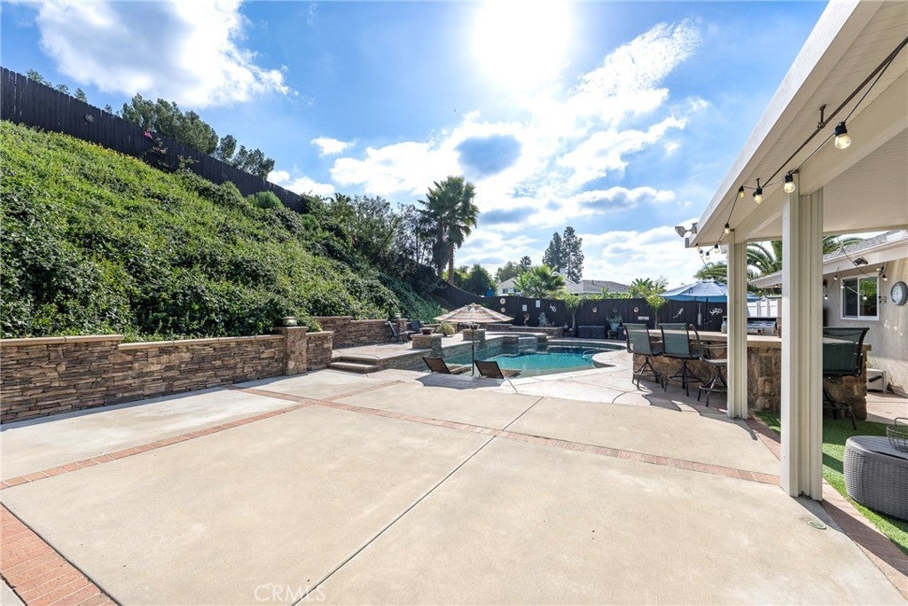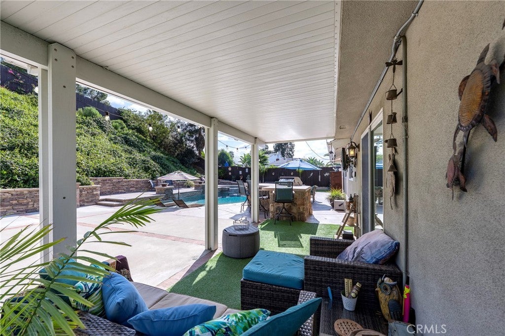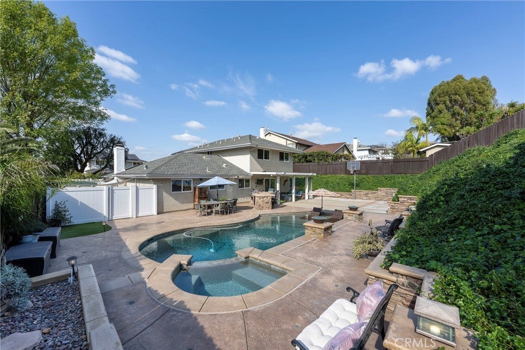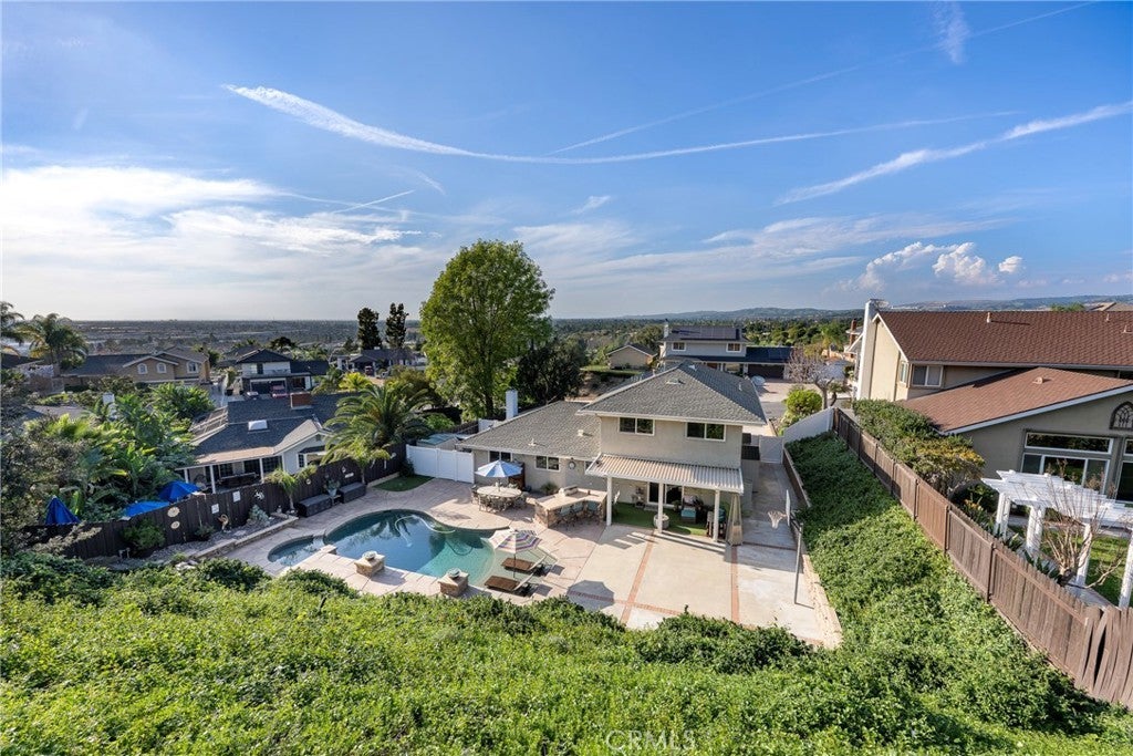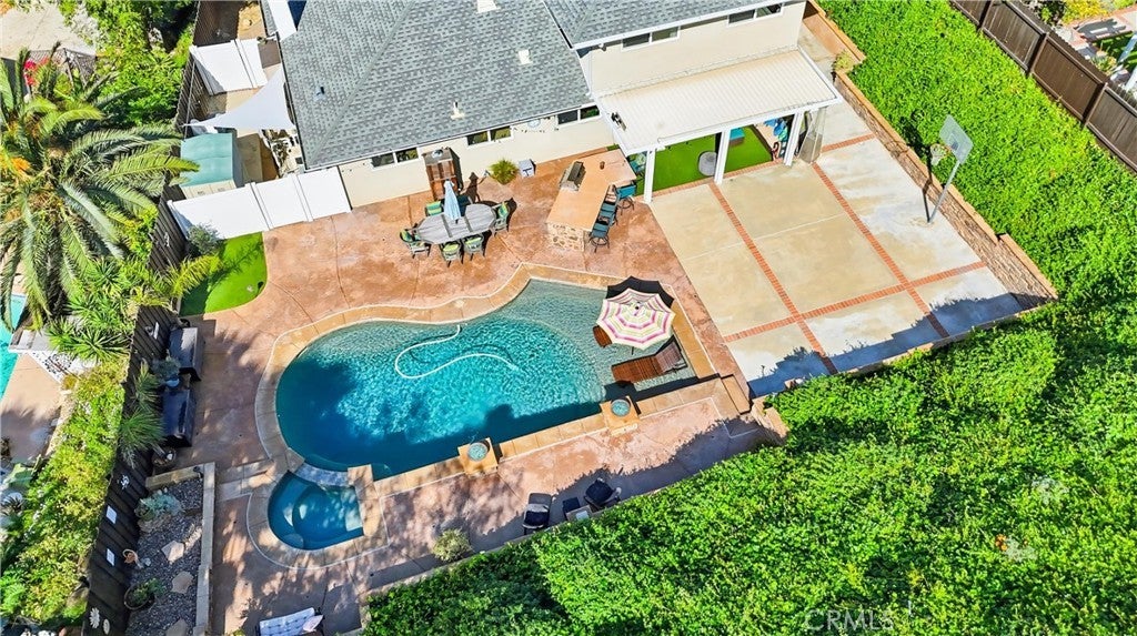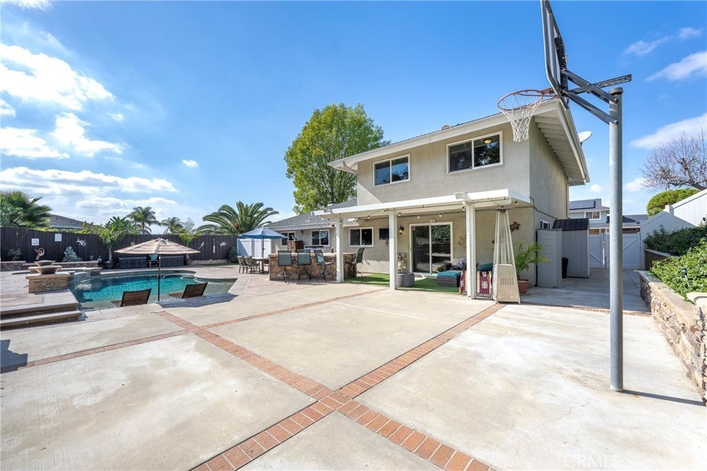 Perched at the top of Fairview Estates, this home delivers the ultimate backyard lifestyle with breathtaking panoramic views, exceptional privacy, and resort-style amenities. The expansive outdoor space is designed for both relaxation and recreation, featuring a saltwater pool and spa with waterfalls and copper fire pots, a built-in Jenn-Air barbecue island, Alumawood patio cover, private viewing platform, and a basketball court, a rare and highly sought-after addition that elevates the entire property. Fully remodeled from top to bottom, the home blends thoughtful design with quality finishes throughout. The open-concept main level seamlessly connects the living, kitchen, and dining spaces, all enhanced by durable luxury plank-tile flooring. The versatile dining area offers flexibility to accommodate an in-home office, workspace, or additional living area, adapting to your lifestyle needs. The chef’s kitchen is the centerpiece of the home, featuring a large island, dual pantries, granite countertops, tile backsplash, stainless steel appliances, wine refrigerator, and insta-hot faucet. Milgard windows throughout bring in natural light while enhancing energy efficiency and comfort. Additional upgrades include plantation shutters, crown molding, recessed lighting, and ceiling fans. System improvements include central heating and air conditioning, a QuietCool whole-house fan, added insulation, and a whole-house water purification system. Upstairs, the expanded primary suite offers a peaceful retreat with a private balcony showcasing stunning sunset and city light views, a walk-in shower, marble-topped vanity, and two closets including a walk-in. A secondary bathroom features a shower over a jetted tub, ideal for family or guests. The front yard is thoughtfully landscaped with drought-tolerant native plants, a dry creek bed, permeable pavers, and smart Rachio irrigation for both front and back yards. Additional features include a finished and insulated two-car garage with laundry, custom cabinetry, workbench, and storage sheds. Located in unincorporated Yorba Linda within the desirable Fairview Estates community, this home is served by highly sought-after Glenknoll Elementary and top-rated Placentia–Yorba Linda schools. Enjoy convenient access to the 91 and 55 freeways, as well as nearby shopping, dining, and entertainment at Yorba Linda Town Center and Savi Ranch. 19582 Crestknoll Drive; You Will LOVE Living Here!