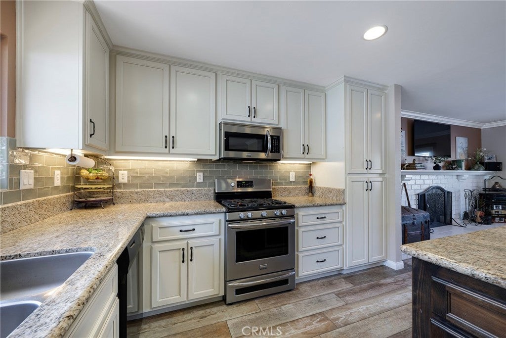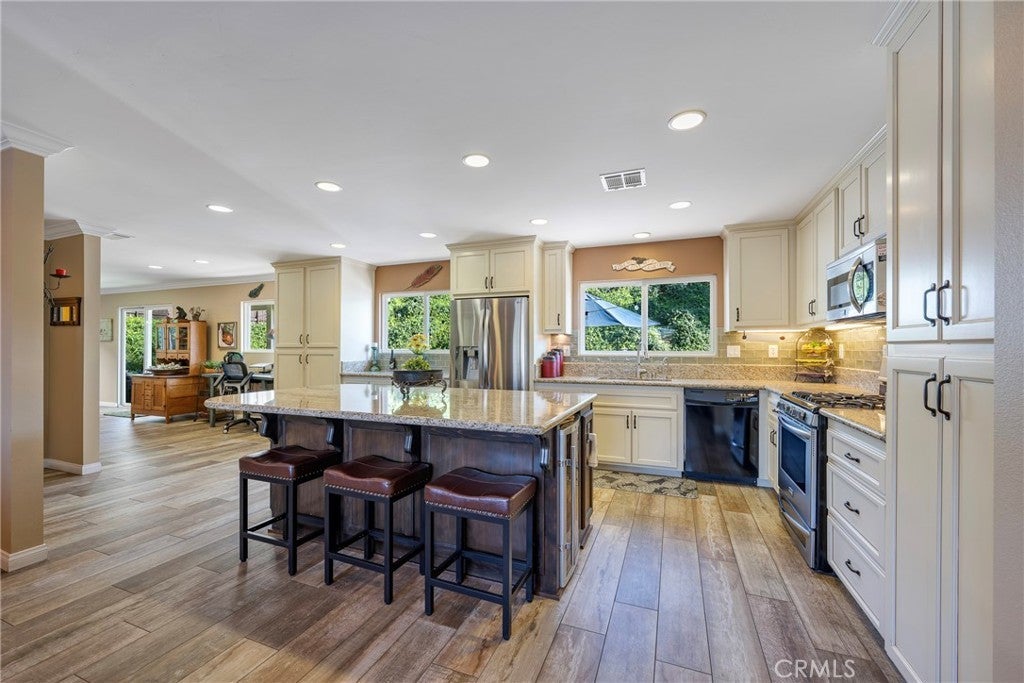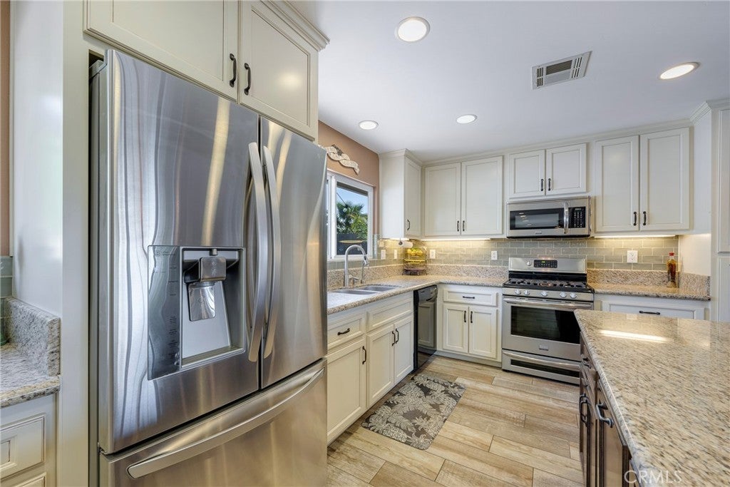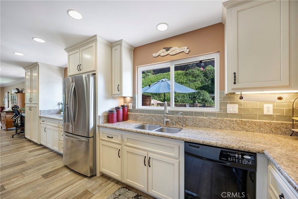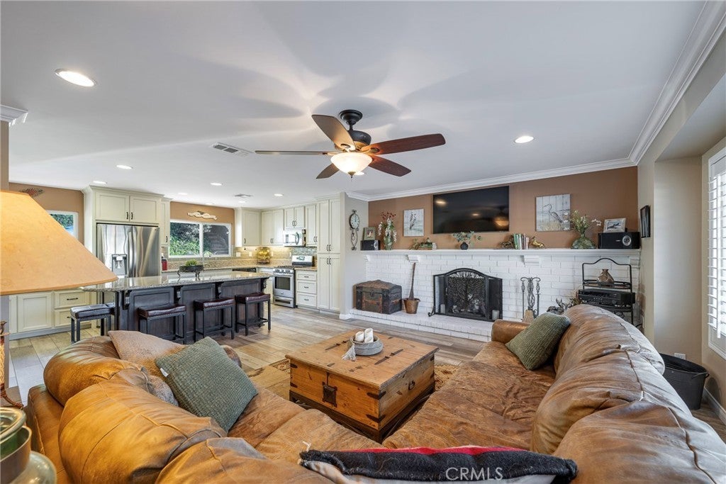 Perched at the top of Fairview Estates, this home delivers the ultimate backyard lifestyle with breathtaking panoramic views, exceptional privacy, and resort-style amenities. The expansive outdoor space is designed for both relaxation and recreation, featuring a saltwater pool and spa with waterfalls and copper fire pots, a built-in Jenn-Air barbecue island, Alumawood patio cover, private viewing platform, and a basketball court, a rare and highly sought-after addition that elevates the entire property. Fully remodeled from top to bottom, the home blends thoughtful design with quality finishes throughout. The open-concept main level seamlessly connects the living, kitchen, and dining spaces, all enhanced by durable luxury plank-tile flooring. The versatile dining area offers flexibility to accommodate an in-home office, workspace, or additional living area, adapting to your lifestyle needs. The chef’s kitchen is the centerpiece of the home, featuring a large island, dual pantries, granite countertops, tile backsplash, stainless steel appliances, wine refrigerator, and insta-hot faucet. Milgard windows throughout bring in natural light while enhancing energy efficiency and comfort. Additional upgrades include plantation shutters, crown molding, recessed lighting, and ceiling fans. System improvements include central heating and air conditioning, a QuietCool whole-house fan, added insulation, and a whole-house water purification system. Upstairs, the expanded primary suite offers a peaceful retreat with a private balcony showcasing stunning sunset and city light views, a walk-in shower, marble-topped vanity, and two closets including a walk-in. A secondary bathroom features a shower over a jetted tub, ideal for family or guests. The front yard is thoughtfully landscaped with drought-tolerant native plants, a dry creek bed, permeable pavers, and smart Rachio irrigation for both front and back yards. Additional features include a finished and insulated two-car garage with laundry, custom cabinetry, workbench, and storage sheds. Located in unincorporated Yorba Linda within the desirable Fairview Estates community, this home is served by highly sought-after Glenknoll Elementary and top-rated Placentia–Yorba Linda schools. Enjoy convenient access to the 91 and 55 freeways, as well as nearby shopping, dining, and entertainment at Yorba Linda Town Center and Savi Ranch. 19582 Crestknoll Drive; You Will LOVE Living Here!
