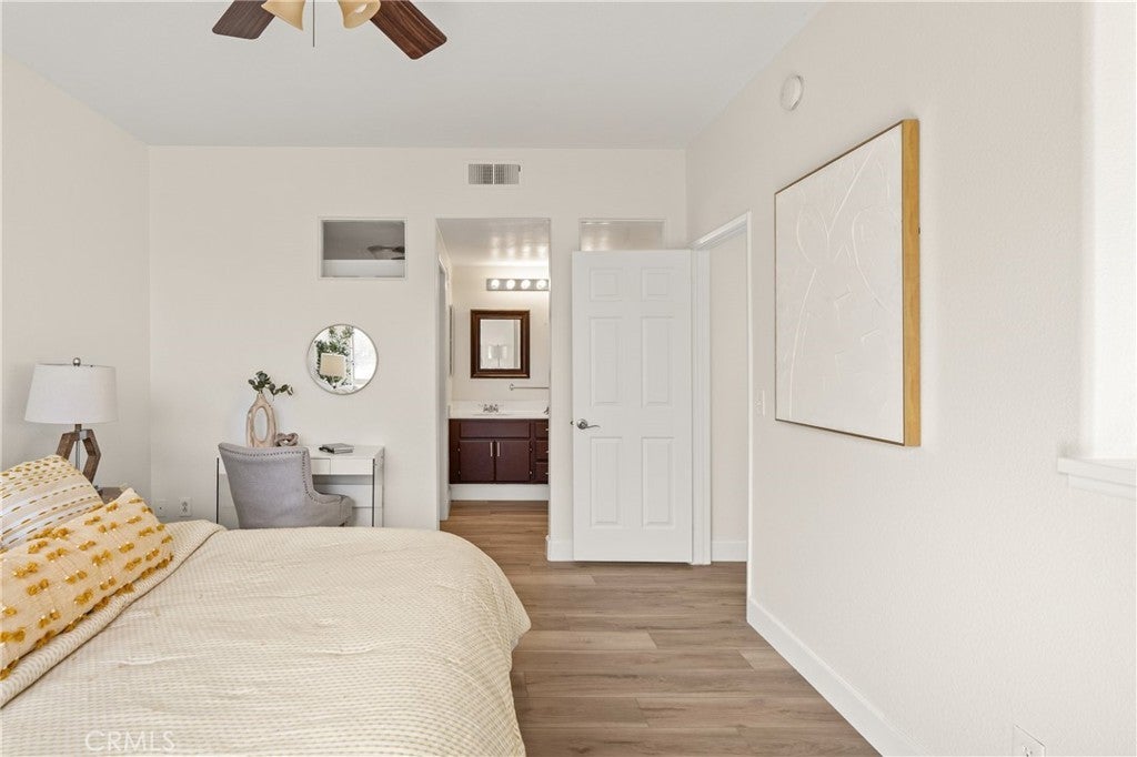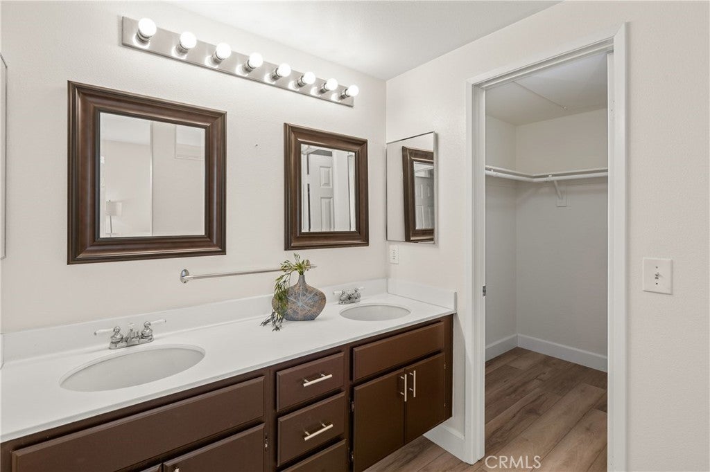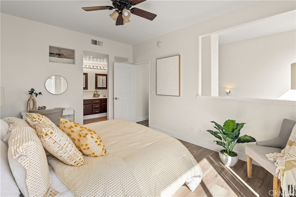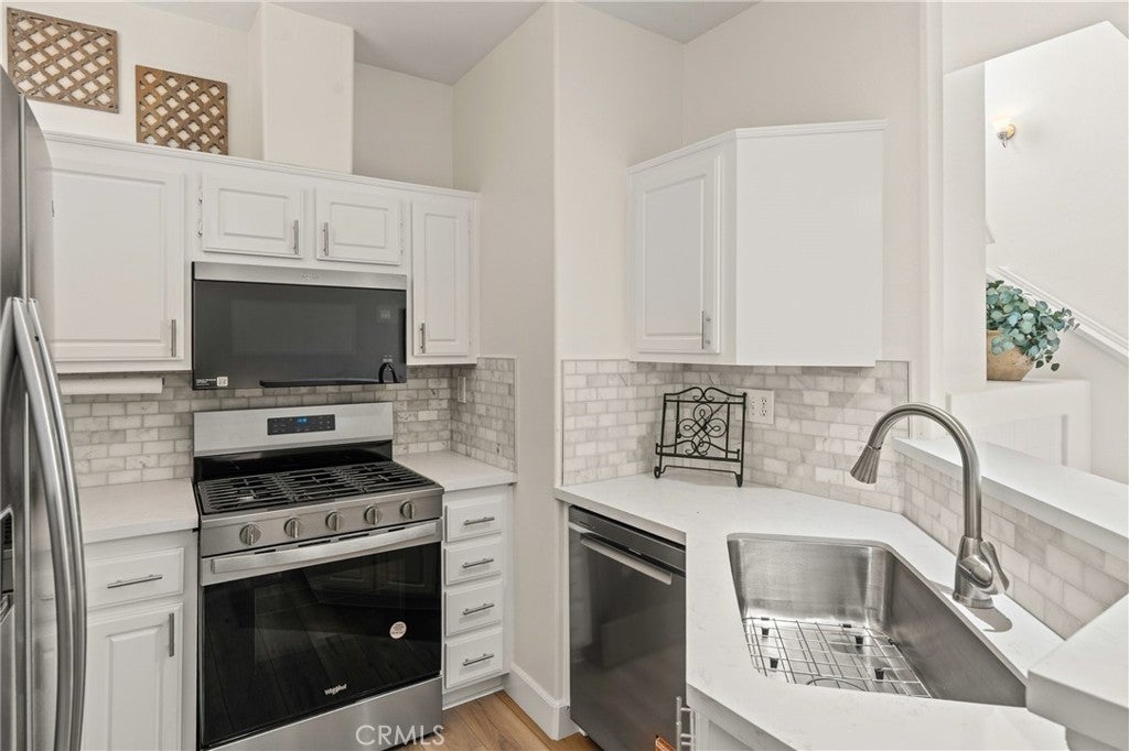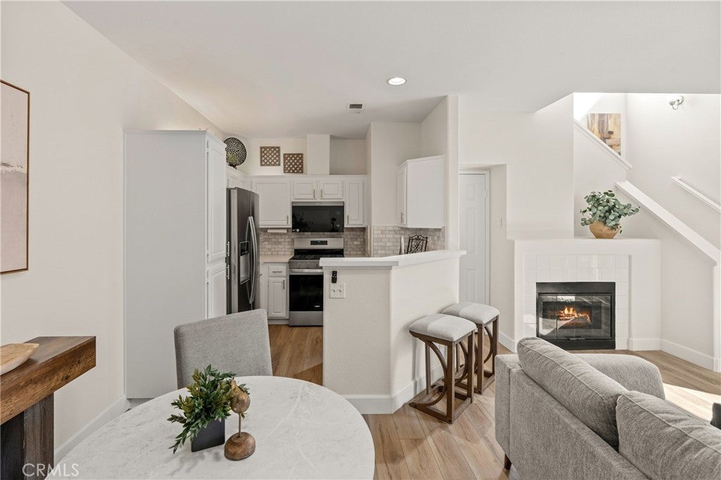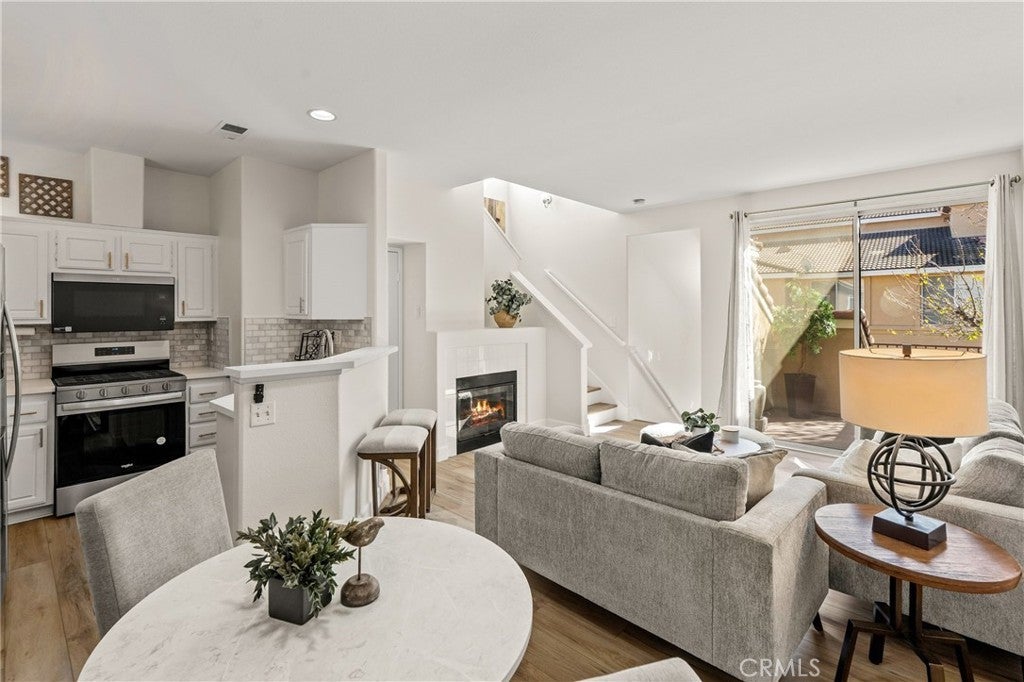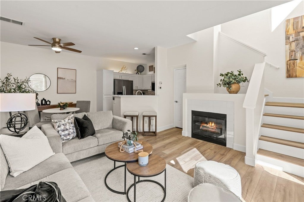 Welcome to this charming 1 bedroom 1.5 bath condo nestled in the highly sought after Monaco community in Anaheim Hills! Spanning 865 Square Feet, this home offers a perfect blend of comfort and convenience. Step inside and enjoy the spacious living room with gas fireplace and sliding doors that lead you to your own private balcony for outdoor entertaing and relaxing. The interior has recently undergone lovely upgrades including wood plank vinyl flooring. The kitchen boasts new appliances,5 burner gas stove, newer stainless sink and quartz countertops. Step upstairs to your peaceful bedroom offering ensuite bath with double sinks and fabulous walk-in closet. This condo also features a unique advantage - an attached 2 car tandem garage + a driveway large enough to park an SUV, providing ample parking space for visiting friends or additional storage needs. Residents of Monaco community are spoiled with resort-style smenities including sparkling swimming pool, 3 spas, tennis courts, gym, club house and more. Perfectly located near top rated schools, parks, shopping and dining plentiful options, this condo ensures you experience all that Anaheim Hills has to offer while enjoying tranquility within your own retreat. Don't miss out on making this delightful condo your home.