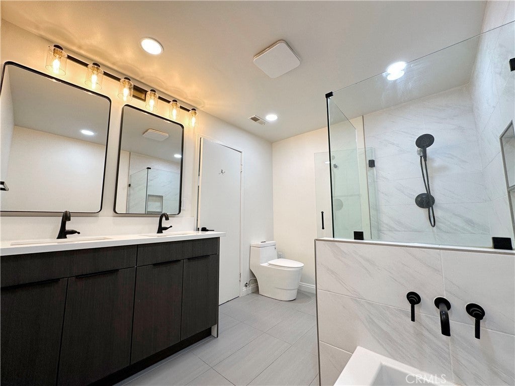 Welcome to this beautifully renovated 2-bedroom, 2-bathroom residence located in the highly desirable Westwood neighborhood. Thoughtfully remodeled approximately two years ago, this home features a bright open-concept layout with warm wood-toned vinyl flooring and a modern neutral color palette throughout. The spacious living and dining areas flow seamlessly together, highlighted by a stylish brick fireplace and a private balcony. Large windows invite abundant natural light and provide excellent ventilation. The two-layer window construction effectively reduces outside noise, creating a noticeably quieter and more comfortable interior environment. The contemporary kitchen showcases dark custom cabinetry paired with sleek white quartz countertops and a full suite of premium LG stainless steel appliances. A modern island sink, designer lighting, and generous storage space provide both functionality and sophistication. This unit offers two fully updated bathrooms featuring modern tile finishes, glass shower enclosures, elegant black fixtures, and a dual vanity in the primary bath for a spa-like experience. The bedrooms are thoughtfully positioned for privacy. The primary suite includes ample closet space, and additional built-in storage—such as a custom shoe cabinet near the entry—enhances everyday organization and convenience. Enjoy the convenience of an in-unit washer and dryer, along with central HVAC for year-round comfort. The building offers a secured gated parking garage with two tandem parking spaces. Ideally located just minutes from UCLA, Century City, Westfield Mall, popular restaurants, cafes, and parks, this home offers the perfect balance of peaceful residential living and prime urban accessibility.