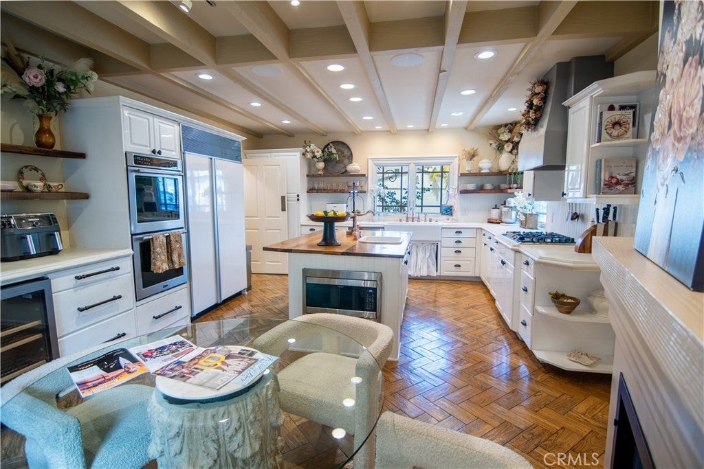 Experience refined coastal living in this exquisite French Provincial tri-level home, ideally positioned in exclusive Naples Island of Long Beach. Just steps from the scenic waterways and moments from world-class dining, this beautifully appointed residence offers timeless elegance with flexible furnishing options to suit your lifestyle. The first level welcomes you with a grand entry that opens to a formal living room featuring soaring vaulted ceilings, a fireplace, and a wet bar, perfect for entertaining your guests. The formal dining room showcases a stunning coffered ceiling with decorative floral inlays, and a stunning chandelier adding a touch of sophistication. A spacious eat-in kitchen anchors the rear of the home, complete with a large center island and prep sink, full suite of appliances, and direct access to a private patio with built-in BBQ, ideal for alfresco dining. A guest powder room, indoor laundry, and direct-access two-car garage complete this level. The second level offers three bedrooms and a large family/media room with its own wet bar and wine refrigerator. One of the bedrooms features an en suite bath, while another versatile space toward the rear adapts beautifully as a private bedroom, executive home office, or personal fitness studio, perfect for today's flexible lifestyle. A second full bath serves the remaining rooms. Ascending to the third level, you'll find the primary suite, a serene retreat featuring a fireplace, walk-in closet, and a newly remodeled spa-inspired bath with floor-to-ceiling tile, a floating vanity, modern fixtures, and an expansive dual-head walk-in shower. The entire suite is designed for privacy and comfort, separated from the rest of the home. A few steps above the primary suite leads to the rooftop deck, an entertainer's dream with panoramic 360º views of Naples Island, comfortable patio seating, and a gas fire pit that is perfect for sunset gatherings or evening relaxation. This exceptional home combines timeless European charm with modern amenities, all within Naples Island's coveted waterfront enclave, one of Southern California's most distinguished residential communities.