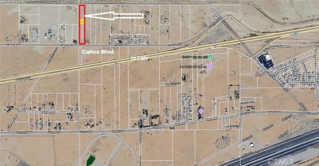Exceptional opportunity to own 5.43 acres of flat, buildable land with direct frontage on paved Calico Blvd in Yermo. Strategically located just off the Calico Rd exit from Interstate 15, this parcel benefits from high visibility and traffic exposure from millions of travelers heading to and from Las Vegas each week. Ideal for future development or investment, this lot offers convenient access and flexible RL (Rural Living) zoning. APN: 0537-121-01-0000 ; Zoning: RL (Rural Living) ; Size: 5.43 Acres ; Zoning: RL ; Access: Paved road ; Electricity: pole at the front, Water: Drill well ; Sewage: Septic area ; GPS Coordinates (SW Corner): 34.908975, -116.855953 ;