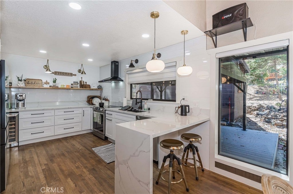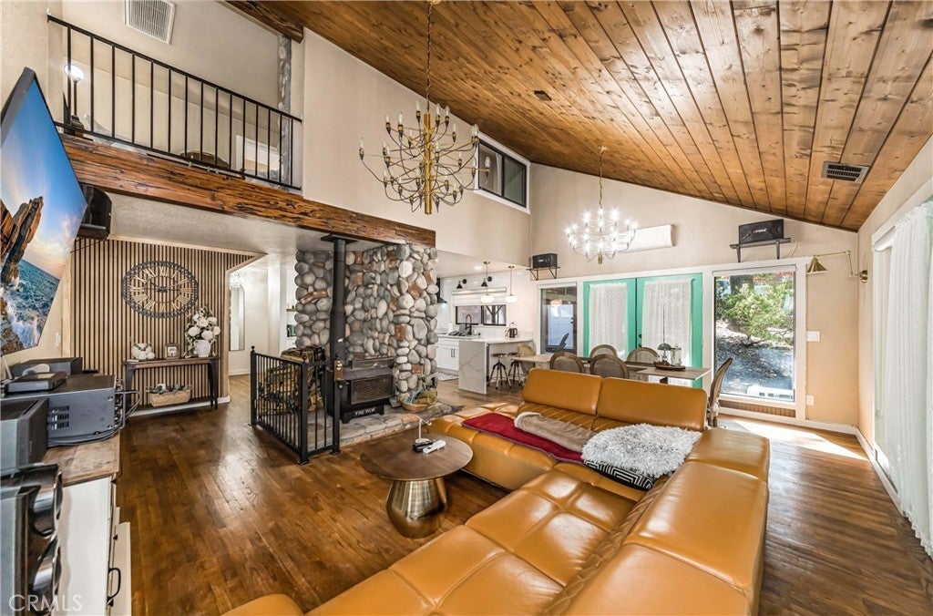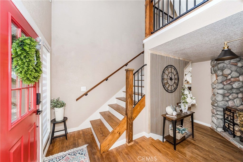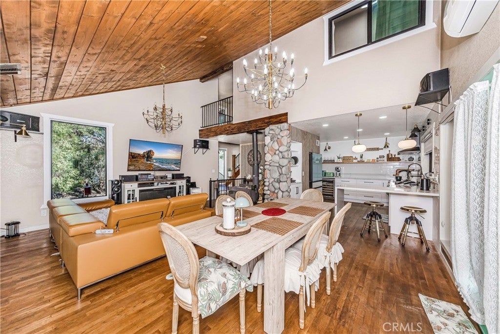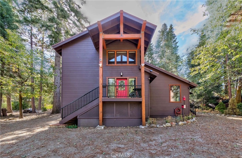 Nestled in the peaceful mountain community of Angelus Oaks, this beautifully updated 2 bed, 2 bath home offers 1,686 sq ft of bright and inviting living space. Soaring ceilings, warm wood floors, and large windows bring in natural light and forest views throughout. The living room features a stunning floor-to-ceiling river rock fireplace with wood-burning stove, creating a true mountain retreat feel. The remodeled kitchen includes quartz countertops, white cabinetry, stainless steel appliances, and a breakfast peninsula that opens to the dining and living areas. Both bathrooms have been tastefully updated, including a freestanding soaking tub in the primary suite. A loft overlooking the main living space provides flexible use for an office or sitting area. Surrounded by mature trees and fresh mountain air, this turnkey home offers privacy, charm, and modern comfort just off the Rim of the World Scenic Byway.