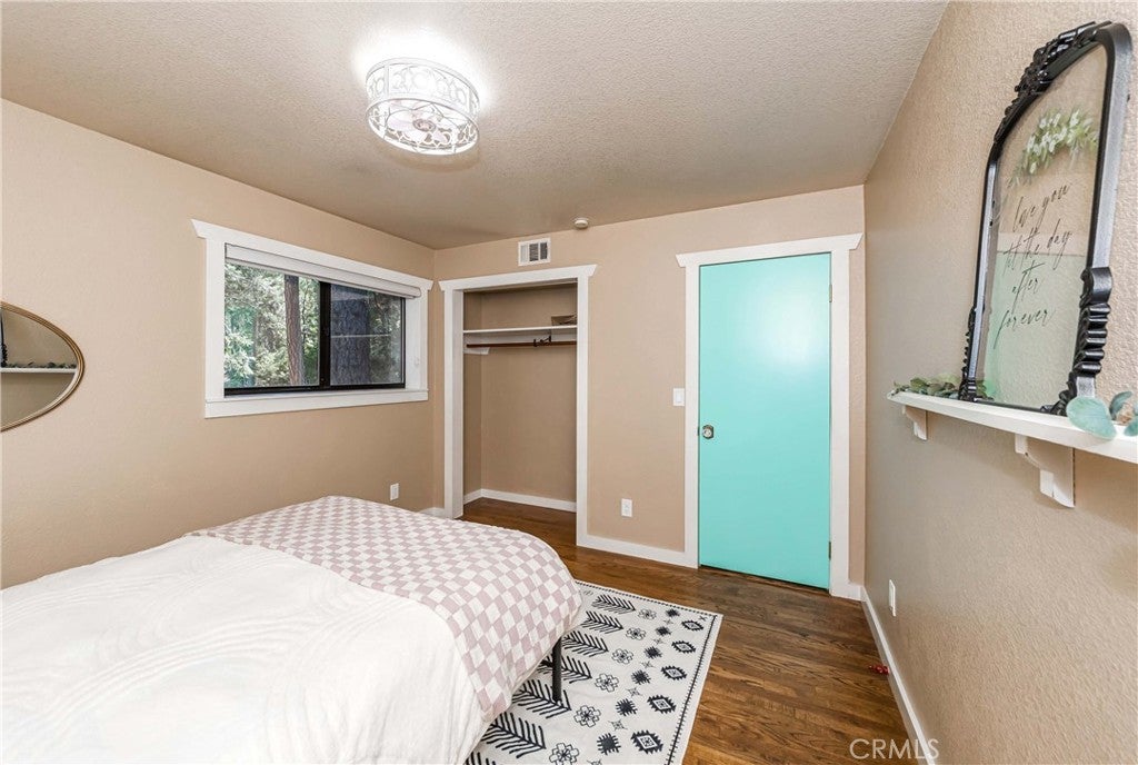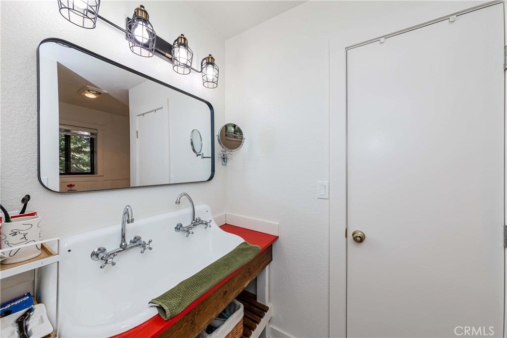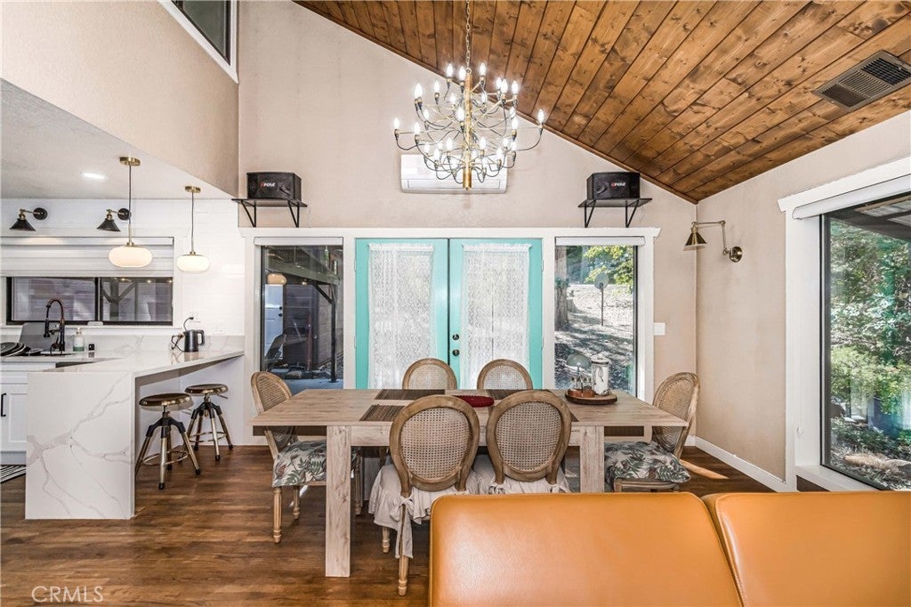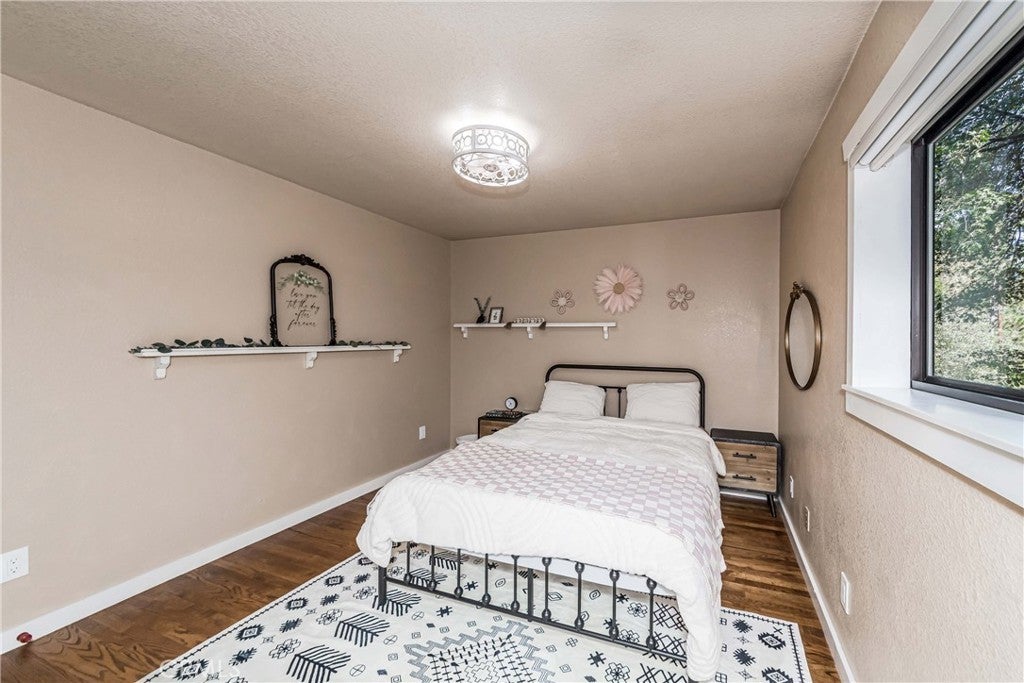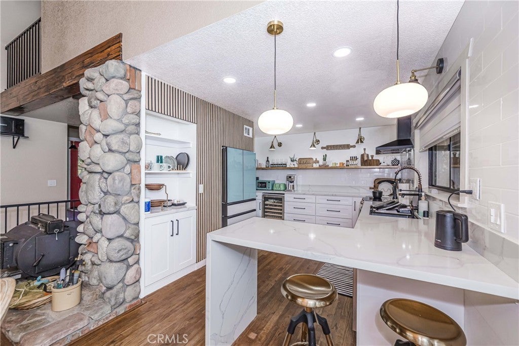 Nestled in the peaceful mountain community of Angelus Oaks, this beautifully updated 2 bed, 2 bath home offers 1,686 sq ft of bright and inviting living space. Soaring ceilings, warm wood floors, and large windows bring in natural light and forest views throughout. The living room features a stunning floor-to-ceiling river rock fireplace with wood-burning stove, creating a true mountain retreat feel. The remodeled kitchen includes quartz countertops, white cabinetry, stainless steel appliances, and a breakfast peninsula that opens to the dining and living areas. Both bathrooms have been tastefully updated, including a freestanding soaking tub in the primary suite. A loft overlooking the main living space provides flexible use for an office or sitting area. Surrounded by mature trees and fresh mountain air, this turnkey home offers privacy, charm, and modern comfort just off the Rim of the World Scenic Byway.