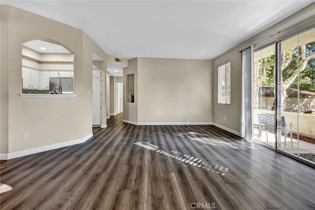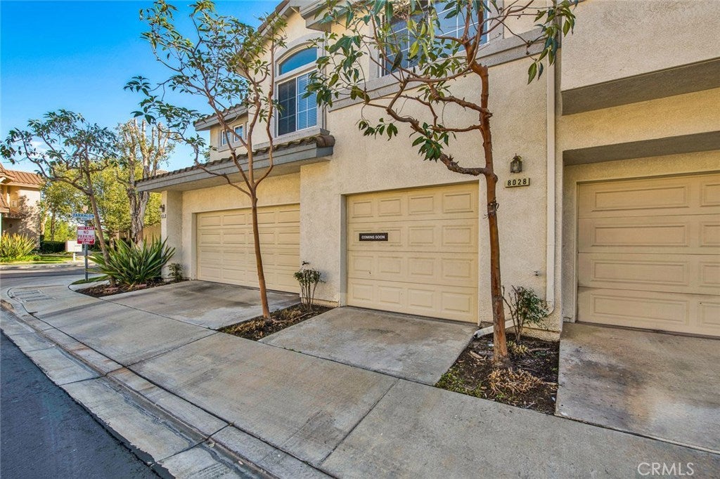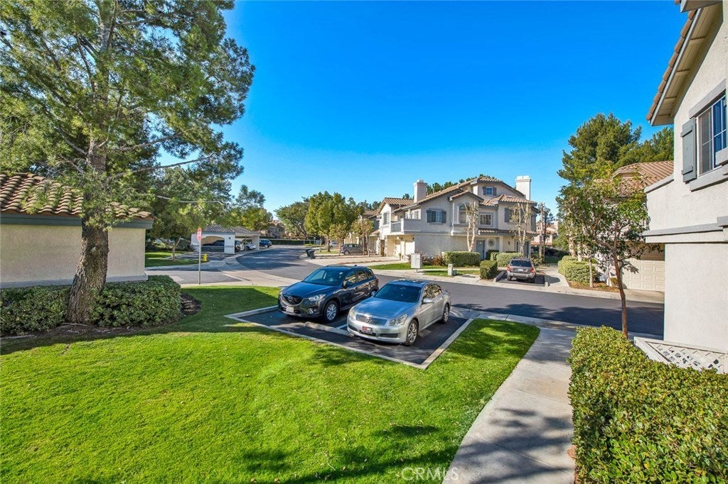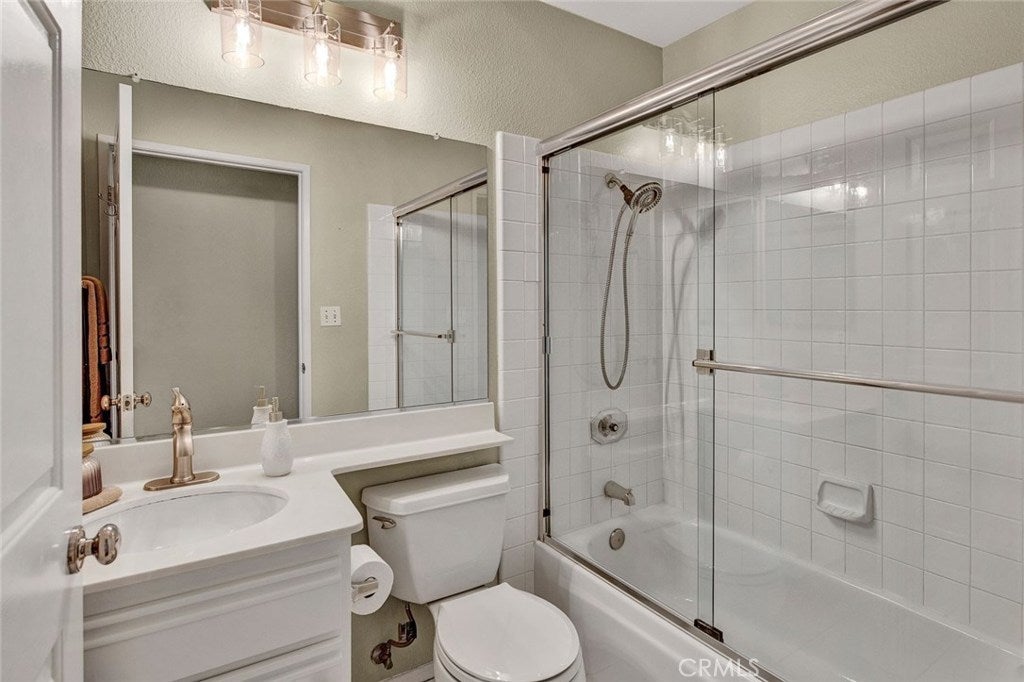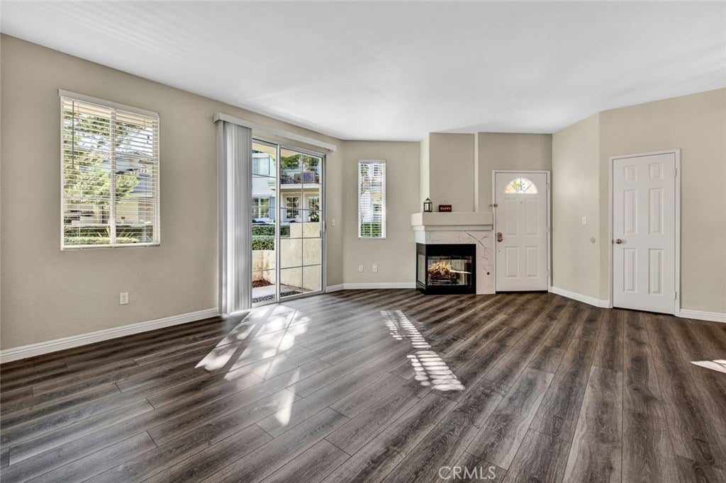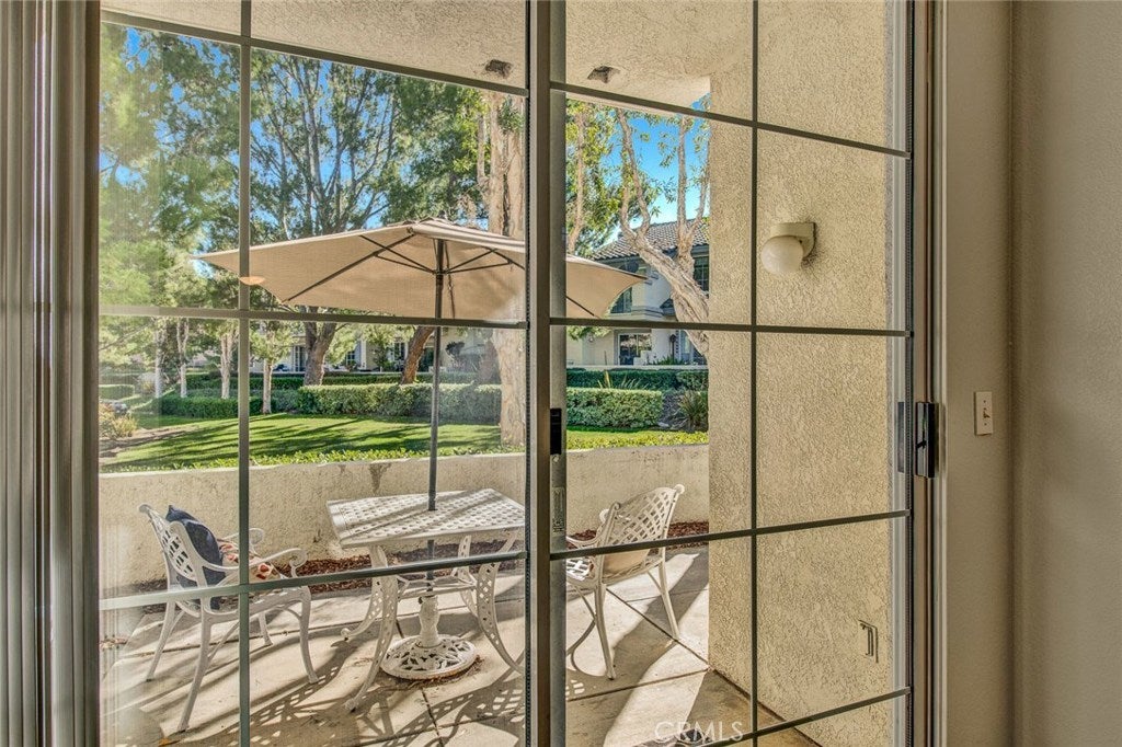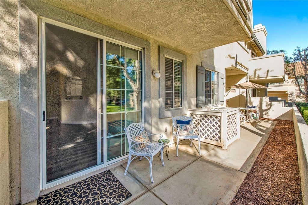 Desirable ground-floor end unit featuring 2 bedrooms and 2 bathrooms, located in the beautiful gated community of Viewpointe North. This popular floor plan offers an open living space and a large private patio extending from the living room to the primary bedroom. The inviting living room features laminate flooring, a cozy fireplace, and a large sliding glass door providing abundant natural light and direct patio access. The adjacent dining area includes an updated chandelier, creating an ideal space for entertaining. The remodeled kitchen showcases quartz countertops, white cabinetry, recessed lighting, stainless steel sink and faucet, and stainless steel appliances, including a refrigerator. Down the hall are two bedrooms, a guest bathroom, and a convenient indoor laundry closet. The spacious primary bedroom offers laminate flooring and a large sliding glass door leading to the private patio. The updated primary bathroom features a walk-in shower, dual-sink vanity, recessed lighting, and a walk-in closet. The guest bedroom includes laminate flooring, mirrored closet doors, and a peaceful greenbelt view. The guest bathroom offers a bathtub/shower combination. Additional highlights include a one-car attached garage with direct access and one designated covered carport nearby. Viewpointe North amenities include two pools, five spas, a clubhouse, and dual gated entries.