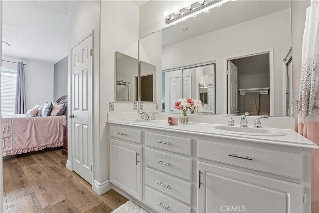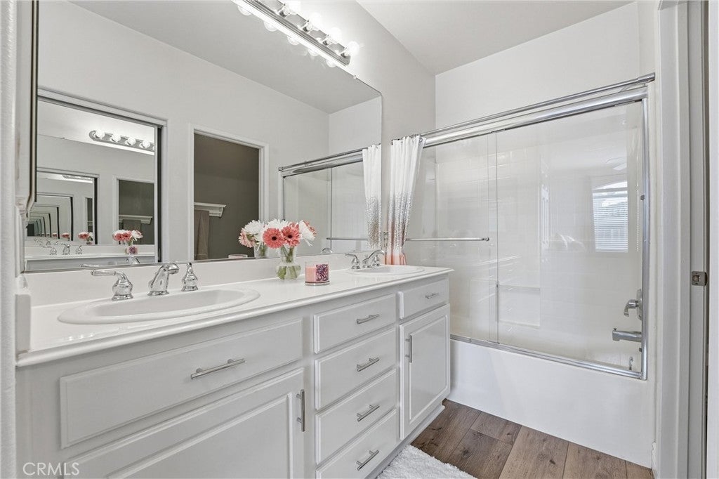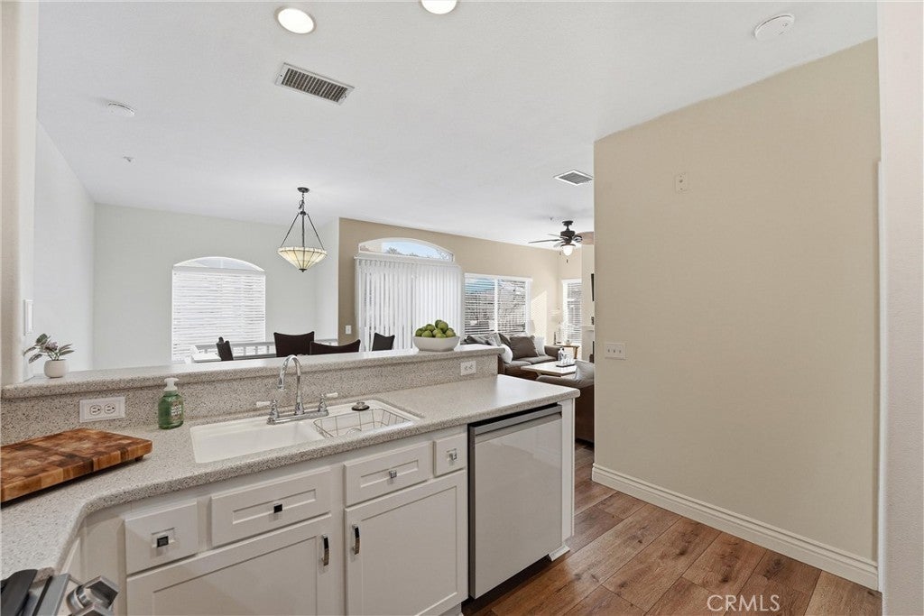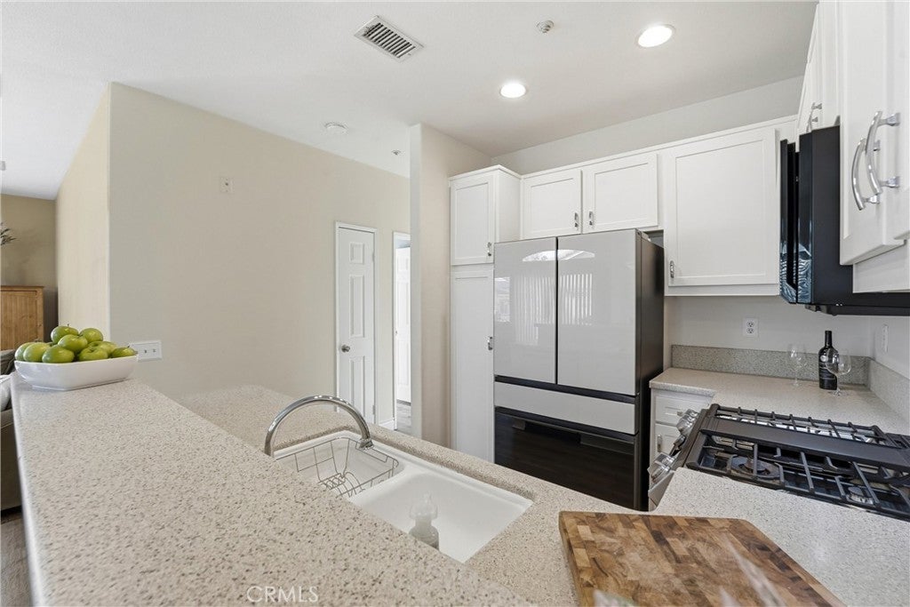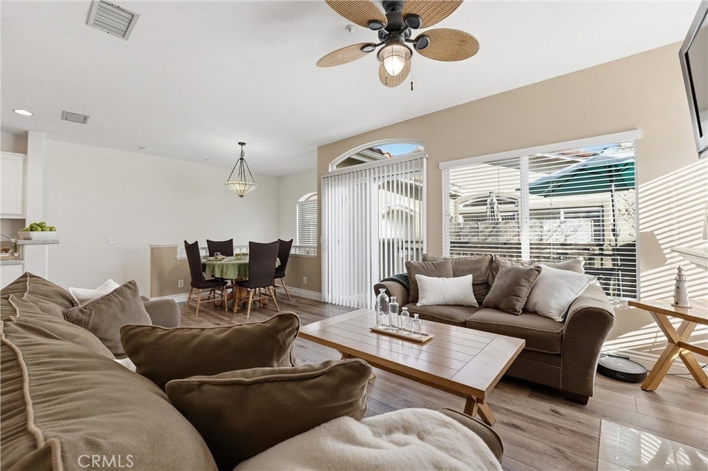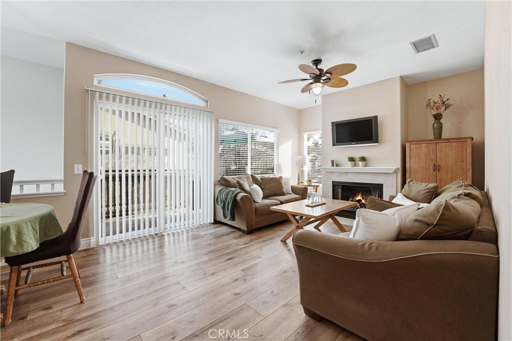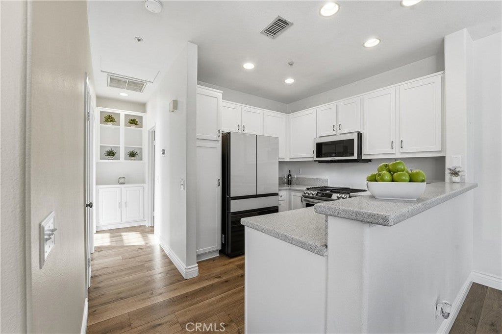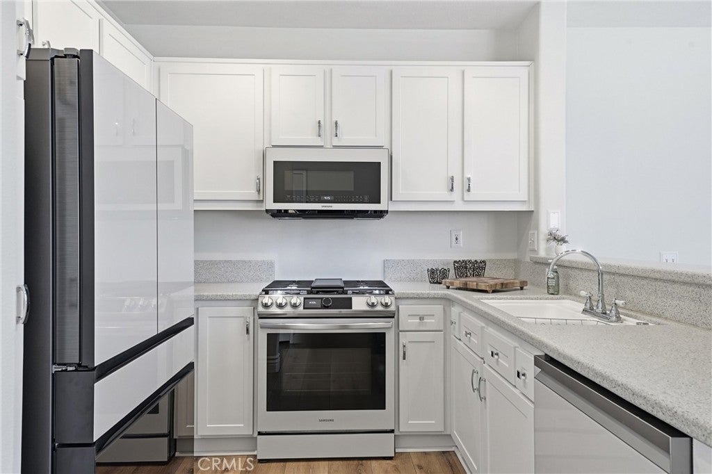 Modern updates and everyday comfort come together in this bright and inviting 2-bedroom, 2-bathroom corner carriage-style condo in Rancho Santa Margarita. With the garage below and all living space on one level, this thoughtfully refreshed home offers privacy, convenience, and a move-in-ready lifestyle. Inside, the home features new flooring installed in 2023, fresh interior paint, custom feature walls, and a restyled fireplace mantle that adds warmth and character to the living space. The kitchen has been refreshed with professionally resurfaced white cabinetry, new hardware, and a full suite of 2024 Samsung Bespoke smart appliances, including a gas stove, dishwasher, microwave, and refrigerator. Several key systems have also been recently updated for added peace of mind. Improvements include a brand-new water heater (2024), a Nest-controlled central AC system, and a Samsung top-load washer and dryer set (2023). The primary suite offers a comfortable retreat with mirrored closet doors and a new glass shower door installed in 2024. Additional highlights include a 1-car garage with epoxy flooring and a newer door mechanism, plus an additional reserved parking space. New blinds, upgraded outlet plates, and refinished stair railings add to the home's polished feel. Ideally located near parks, scenic hiking trails, shopping, and dining, this home offers convenient access to the lifestyle amenities that make living in Rancho Santa Margarita so desirable.