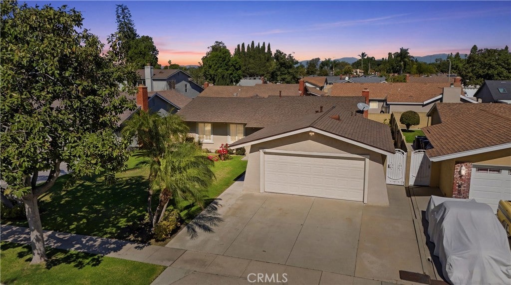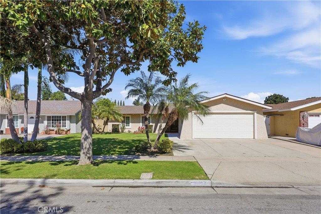 Situated in a quiet cul-de-sac, 1817 E Alcove Way in Anaheim is a charming California Ranch-style home built in 1968. With 1,557 square feet of living space on a 6,000-square-foot lot, it is perfect for first-time buyers or investors. This single-story residence features four bedrooms, each with mirrored sliding closet doors, and a main suite that includes a walk-in closet and a private, renovated bathroom. The home showcases tile floors throughout the entryway, family room, dining area, and kitchen. It boasts a custom bay window, granite countertops, a prep island, and convenient direct access to the garage. The family room offers a cozy gas-burning brick fireplace. Additional amenities include central air conditioning, forced heating, a newer roof installed in 2024, and a new water heater. Custom sliding doors open to the backyard, which features a concrete area, a brick fire pit, and an open covered patio, all surrounded by a block wall for privacy. The beautifully landscaped front yard enhances the home's curb appeal. Located just minutes from Disneyland Resort, Anaheim Garden Walk, Packing District, Honda Center, and the new OCVibe district, this property is a must-see!