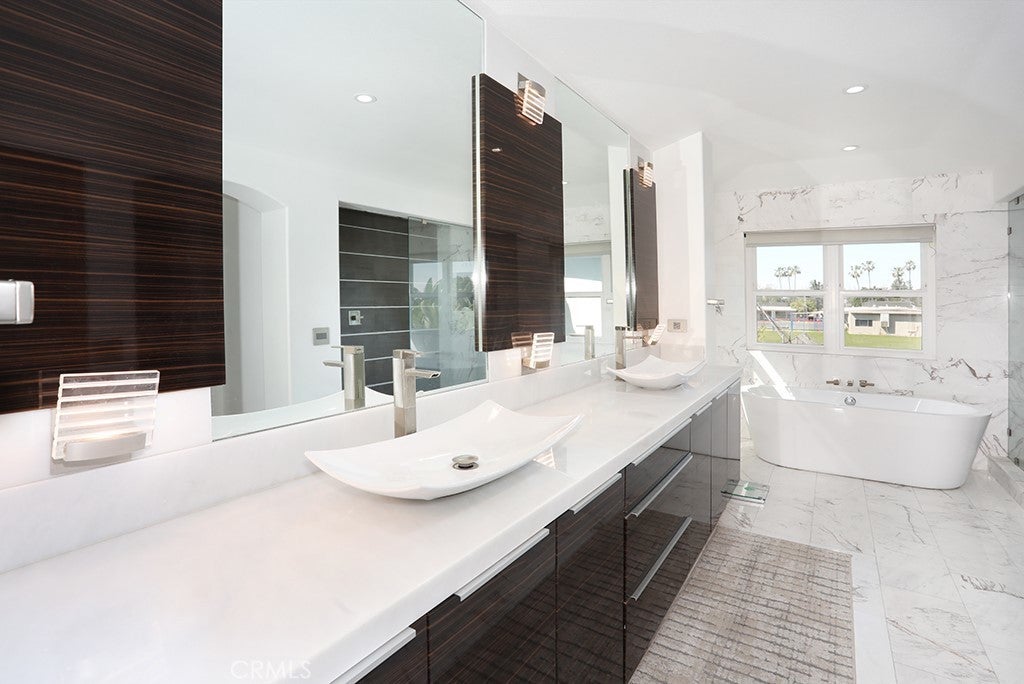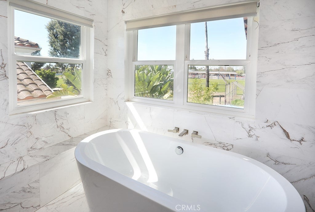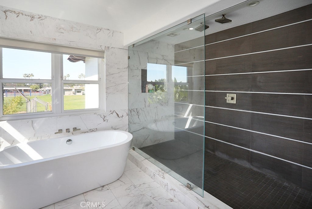 MODERN ELEGANCE! Largest model PLAN 6 in GATED COMMUITY of MALAGA in Tustin Ranch across from Tustin Ranch Golf Club. Completely REMODELED. Gorgeous BRAZILIAN WOOD flooring and stunning MARBLE FLOORING throughout, NO CARPET. RARE - 5 Bedrooms, 4.5 Bathrooms, SPARKLING POOL, SPA & WATERFALL with Cobalt Blue Tiles. Enjoy multi-colored lights for pool. Gazebo in backyard with built-in BBQ Island with refrigerator, burners, surround sound and swim up bar. No neighbors behind you. Convenient downstairs bedroom and bath with shower. 3 car ATTACHED garage with built-in cabinetry and stone floors. Electric shades on NEW windows. DUAL AC, Heating and water heater. Gorgeous GOURMET kitchen with Marble Island with Waterfall Edge and Stainless Appliances, 5 Burner Gas Cooktop with Overhead Stainless Vent. WALK-IN PANTRY with custom organization. Sleek White Cabinetry with Pull-Out Drawers and Soft Close. Stunning REMODELED bathrooms. Modern Glass and Stainless Steel staircase with wood stairs. Primary Bedroom Suite with soaking tub and walk in shower. Primary walk-in closet with upgraded organization. Downstairs LAUNDRY ROOM with Washer and Dryer, granite counters and sink. Designer ceiling fans. Beautiful professionally landscaped back and front yard with automatic sprinklers. Convenient Market Place and District Shopping. Close to Highly Rated Schools. Parks and Peters Canyon Trails Close by. No Mello Roos. Low HOA $135. No showings until open house on Sunday, 3/15/26.
