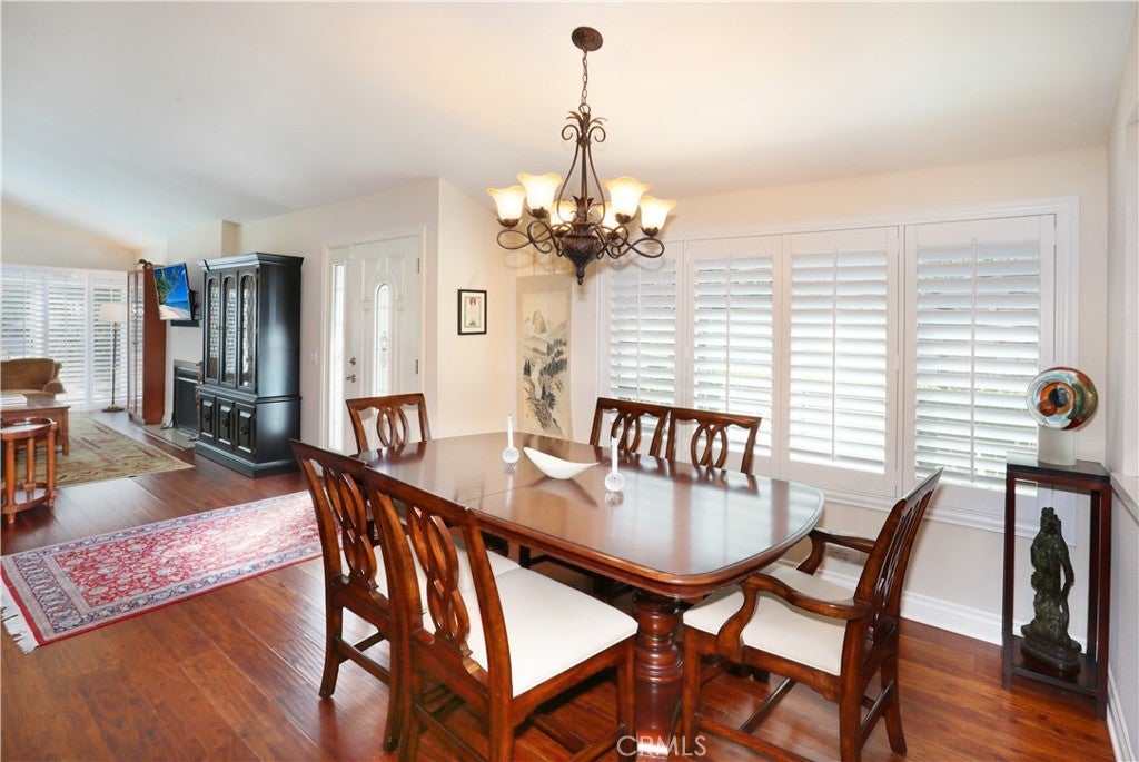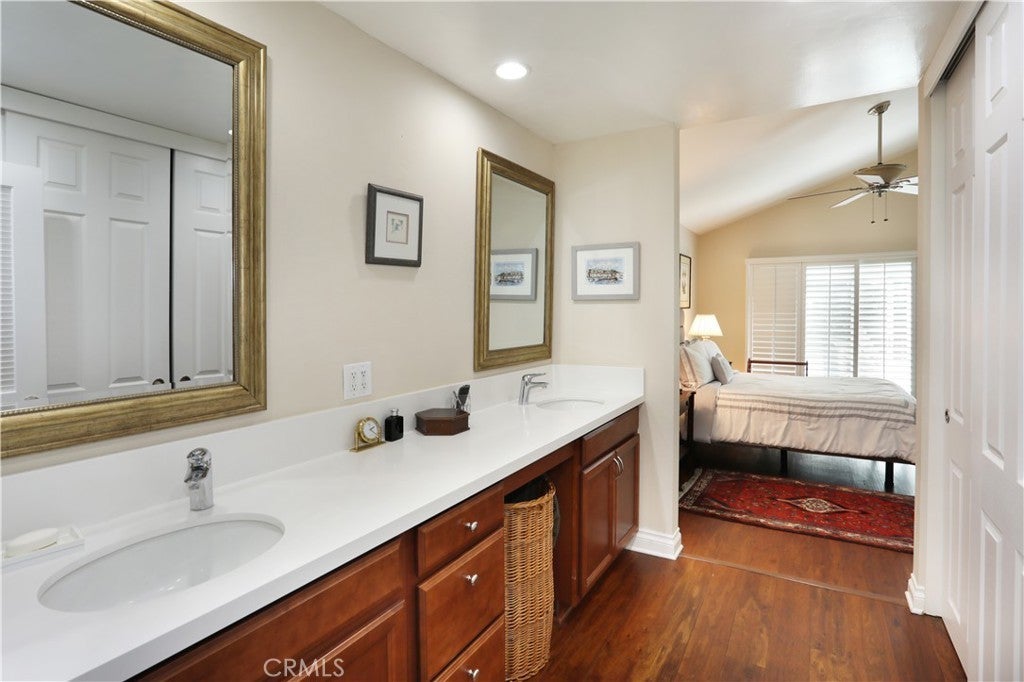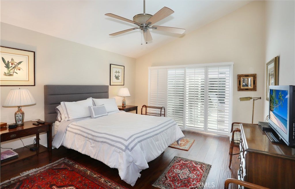 Beautifully remodeled single-story home featuring two spacious bedrooms, an open living and dining area with elegant plantation shutters throughout. Soaring high ceilings create an open, airy feel, complemented by gorgeous wood laminate flooring. An upgraded kitchen and primary bath showcase stunning quartz countertops, blending style and functionality. Premium stainless steel appliances include a Fisher & Paykel DishDrawer dishwasher, LG refrigerator, GE built-in microwave, and a 5-burner gas stove—perfect for everyday living and entertaining. This desirable end unit offers added privacy and a peaceful patio overlooking the hillside, providing a serene outdoor retreat. Add on the community features such as the pool, spa and clubhouse and you're getting the complete package.
