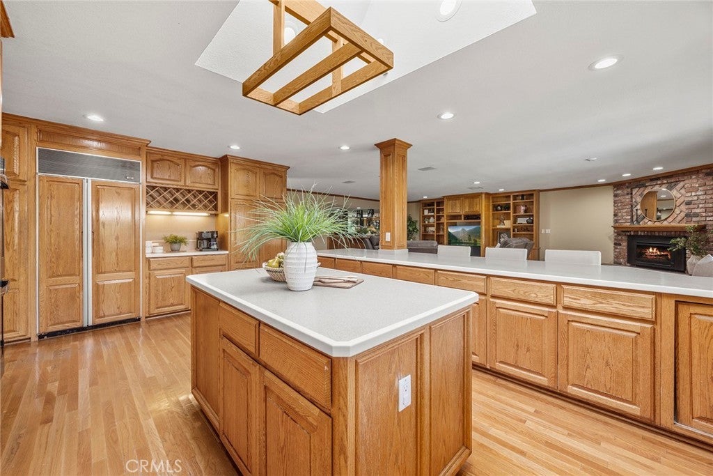 Welcome to 130 N Avenida Veracruz in Anaheim Hills, a rare opportunity to own a truly one of a kind 4 bedroom 3 bathroom home in one of the area’s most sought after neighborhoods. This thoughtfully expanded residence offers an oversized kitchen and family room design that creates exceptional flow for everyday living and unforgettable entertaining. Rich wood flooring adds warmth and character while the chef’s kitchen becomes the heart of the home featuring a large center island, double ovens, gas range, built in refrigerator and a charming garden window overlooking the backyard patio. A custom bar opens to the spacious family room, creating the perfect setting for gatherings, celebrations and holiday traditions. The formal living room and dining room showcase a beautiful brick accent wall and a second fireplace, adding architectural interest and inviting ambiance. A downstairs bedroom and full bathroom provide flexible living options for guests, extended stays or a private home office. The large inside laundry room offers functionality and storage. Upstairs, the expansive primary suite captures views and includes a private bathroom and two walk in closets. Secondary bedrooms are generously sized and designed for comfort. Recent updates include the roof (5 years) and appliances, offering peace of mind. Situated on a large lot with room for a future pool, the backyard is designed for entertaining with epoxy patio flooring and a built in BBQ. The front yard is equally impressive, complemented by two storage sheds, a two car garage with epoxy floors and an oversized driveway with RV parking and additional space for multiple vehicles. Located near top rated schools, popular shopping and dining destinations and with convenient access to the 91 and 55 freeways, this home blends lifestyle, location and livability. Designed for hosting life’s most meaningful moments, this Anaheim Hills home is ready to welcome its next chapter.