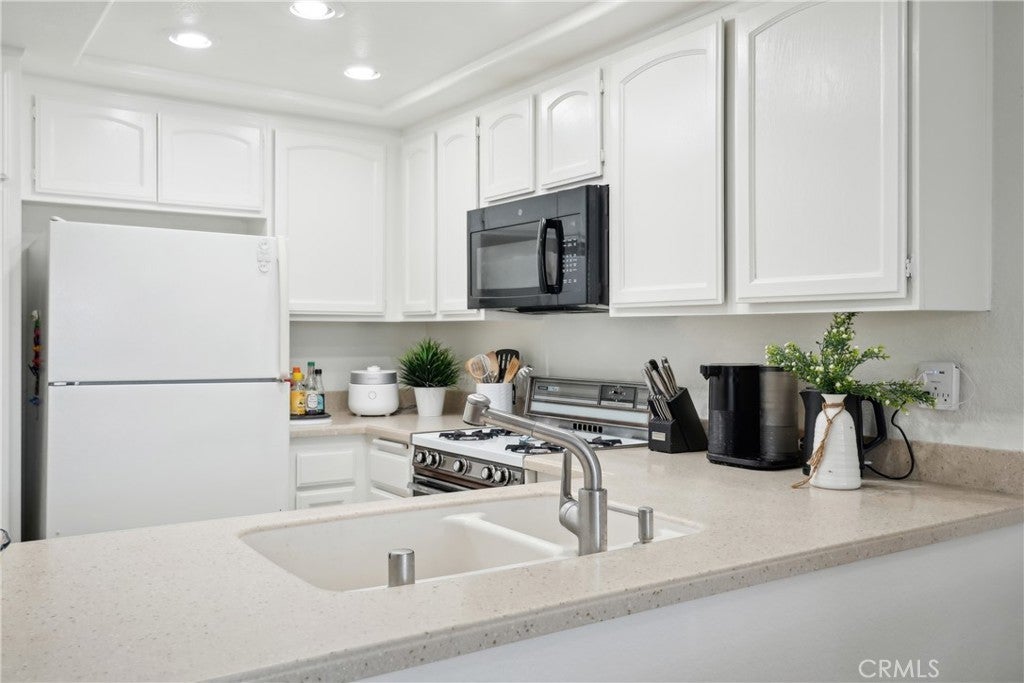FHA Approved! Welcome to this beautifully updated lower-level 2 bedroom, 2 bathroom condo offering comfort, style, and everyday convenience in a desirable community. This move-in ready home welcomes you with a light filled open floor plan, wood-style flooring, and a spacious living room anchored by a cozy gas fireplace. Large sliding glass doors open to a private patio, creating the perfect space to enjoy morning coffee, relax in the evening, or entertain guests while extending the living area outdoors. The open layout flows seamlessly into the dining area and well appointed kitchen, making the home feel both spacious and connected for daily living. The kitchen features crisp white cabinetry, neutral countertops, stainless steel appliances including a dishwasher and built in microwave, recessed lighting, and a convenient breakfast bar that opens to the dining nook for casual dining or entertaining. The primary suite offers a peaceful retreat with generous closet space and a private en suite bathroom designed with clean modern finishes and an updated vanity. The second bedroom provides flexible living options and can easily function as a guest room, home office, or additional sleeping space depending on your needs. Both bathrooms have been tastefully updated to provide a fresh, modern feel. An important upgrade to this home includes newly installed plumbing, adding long term value and peace of mind for the next owner. Additional features include: Laundry room with washer, dryer hook-ups, central air conditioning and heating for year round comfort, two covered carport parking spaces, and access to well maintained community amenities surrounded by mature landscaping. The community is FHA approved which opens the door to more financing options for buyers. Conveniently located near shopping centers, restaurants, parks, and major freeways, this home offers the ideal blend of comfort, accessibility, and low maintenance living. Whether you are a first time buyer, looking to downsize, or searching for a smart real estate investment, this turnkey condo is an opportunity not to be missed.