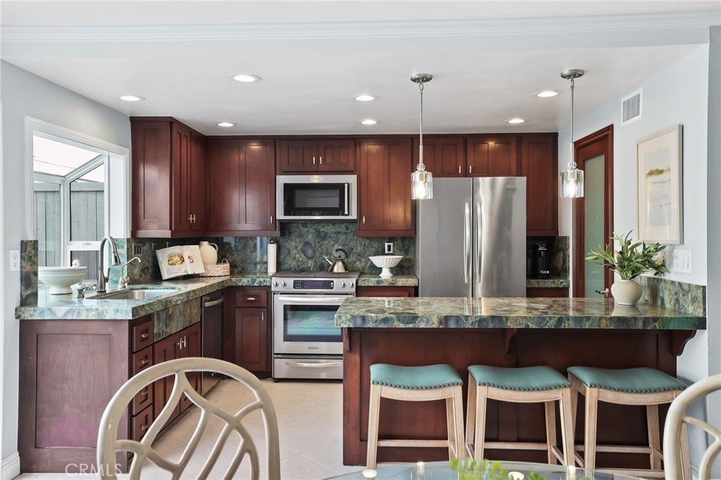 Welcome to the River Beach community in Old Town, where morning walks to the shore and sunset bike rides are part of everyday life. This inviting home features bright, open living spaces filled with natural sunlight and an easy indoor-outdoor flow that works beautifully for both daily living and entertaining. The thoughtfully designed layout includes a spacious primary suite along with two additional generously sized bedrooms and comfortable gathering areas throughout the home. A number of recent upgrades enhance both style and functionality, including new flooring, newer recessed lighting, a new furnace and A/C system, and beautiful designer interior doors throughout. The remodeled kitchen is a standout feature, showcasing Brazilian granite countertops in soothing shades of the sea, custom cabinetry, a built-in wine cooler, and a convenient breakfast bar. The main floor powder room has been refreshed with new lighting, vanity and flooring, while the upper bathrooms have been fully updated with modern finishes. Additional improvements and features include a new water heater, a new electrical panel, pull down stairs to the extra large attic storage space, recessed lighting and designer wall paper and custom touches throughout. The formal dining room opens to the newly remodeled outdoor patio featuring updated landscaping, new patio lighting, a built-in BBQ, and cool ocean breezes—an ideal setting for relaxing or entertaining. The 2 car garage includes all new custom cabinets, new epoxy floors and a charming Dutch door from the patio to the garage. Located near Main Street shopping and dining, the beach and Pier, 328 Regatta Way offers a beautifully updated home in a wonderful location with convenient access to everything that makes Seal Beach a special place to live. Be sure to view the video!
