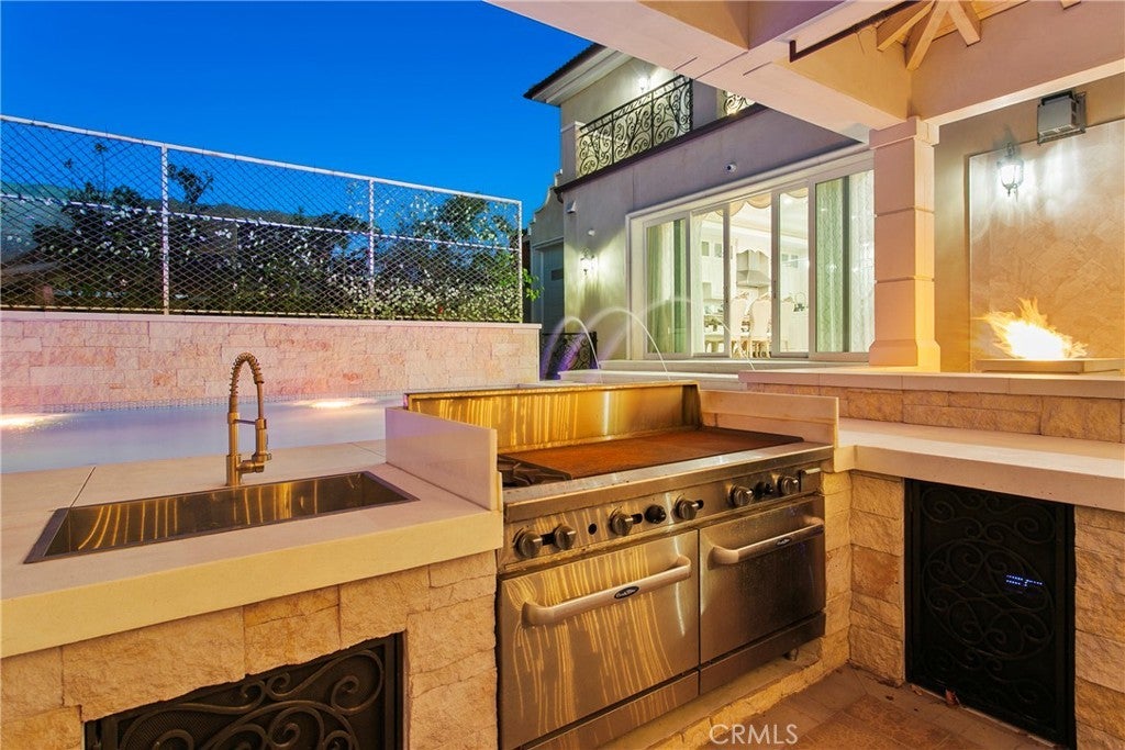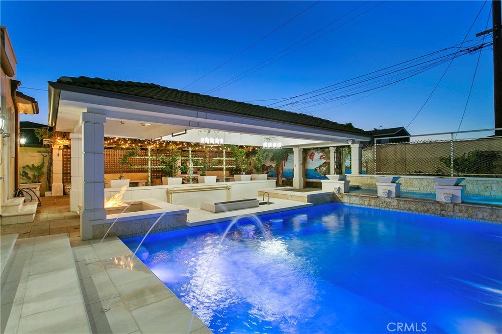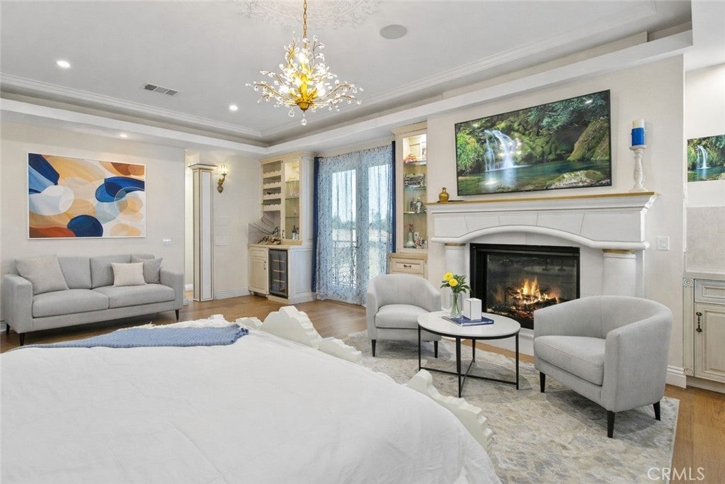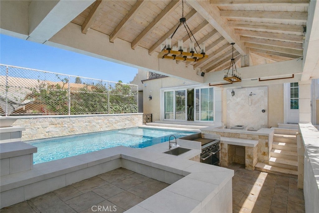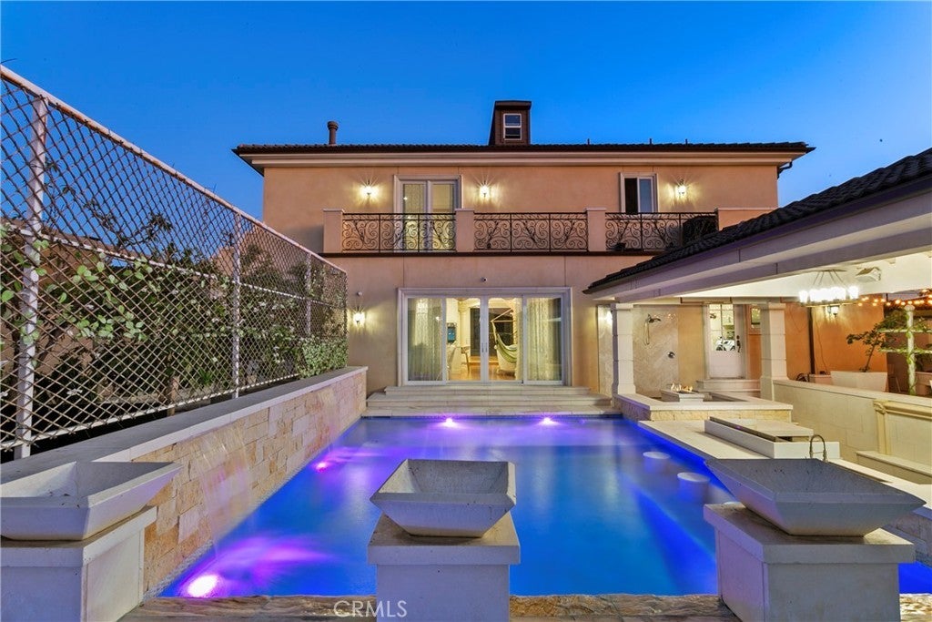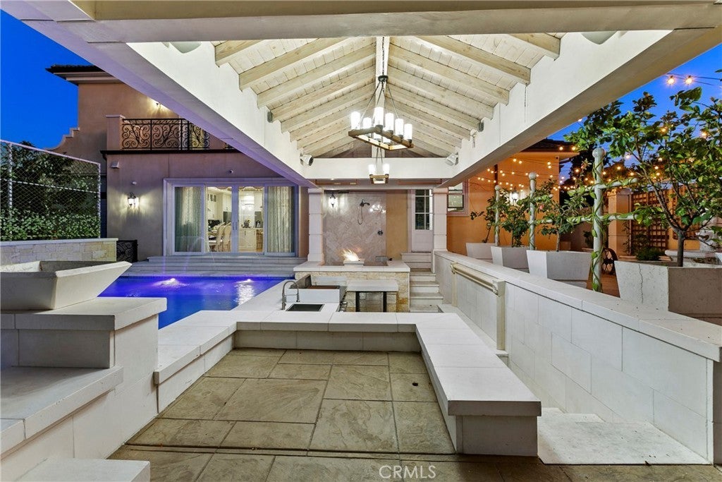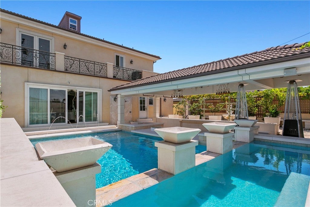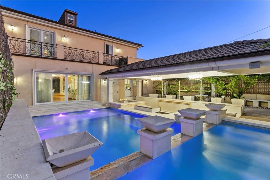 Rare opportunity to lease a spectacular custom-built Mediterranean luxury Smart Home (2020) offering resort-style living, exceptional craftsmanship, and modern technology throughout—ideal for executive living or discerning professionals seeking a private, turnkey residence. This extraordinary home features soaring 10-ft coffered ceilings, custom crown moldings, gold accents, rich wood and stone flooring, solid-core 8-ft doors, dual-pane fiberglass windows, plantation shutters, and a fully integrated Smart Home and intercom system allowing convenient control of lighting, pool features, and home systems from your smartphone. The living room showcases a dramatic built-in see-through saltwater aquarium with exotic fish, while the entry features a striking artistic wall installation with sculpted branches and floral detailing. All bedrooms function as private master suites with en-suite baths, walk-in closets, decorative soffits, chandeliers, LED ceiling lighting with remote controls, and Bluetooth speakers. Bathrooms feature Crema Marfil stone counters, freestanding soaking tubs, spa-style wet rooms, and premium finishes. The upstairs primary suite offers a luxurious retreat with dual walk-in closets, gas fireplace, Jacuzzi tub, Venetian plaster ceiling with gold veining, and a private balcony overlooking the backyard oasis. The gourmet chef’s kitchen includes quartz countertops, high-end range with pot filler, custom Antique White cabinetry, spice drawers, oversized island seating, and large sliding pocket doors opening seamlessly to the backyard. Outdoor living is designed for entertaining with a saltwater pool and spa with smartphone controls, waterfall, water jets, and color-changing LED lighting, plus a cabana featuring custom murals, built-in BBQ, refrigerator, Bluetooth sound system, and Baja shelf with bar seating. Additional highlights include a 3-car garage with RV hookups and EV charger, bonus room off the upstairs laundry, mature fruit trees, and an underground concrete-reinforced