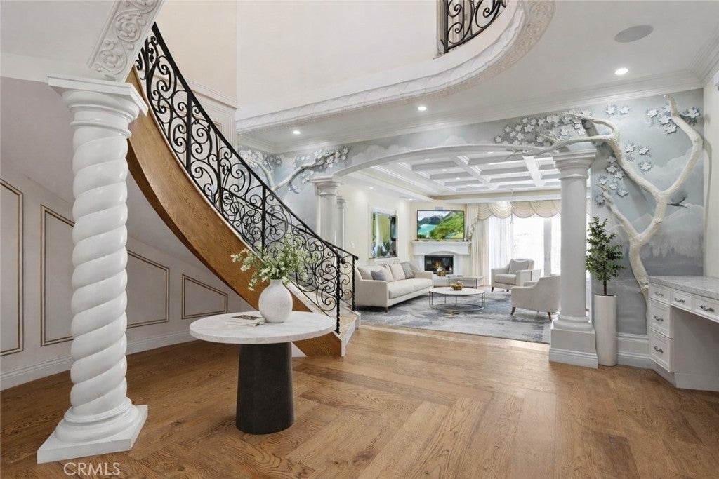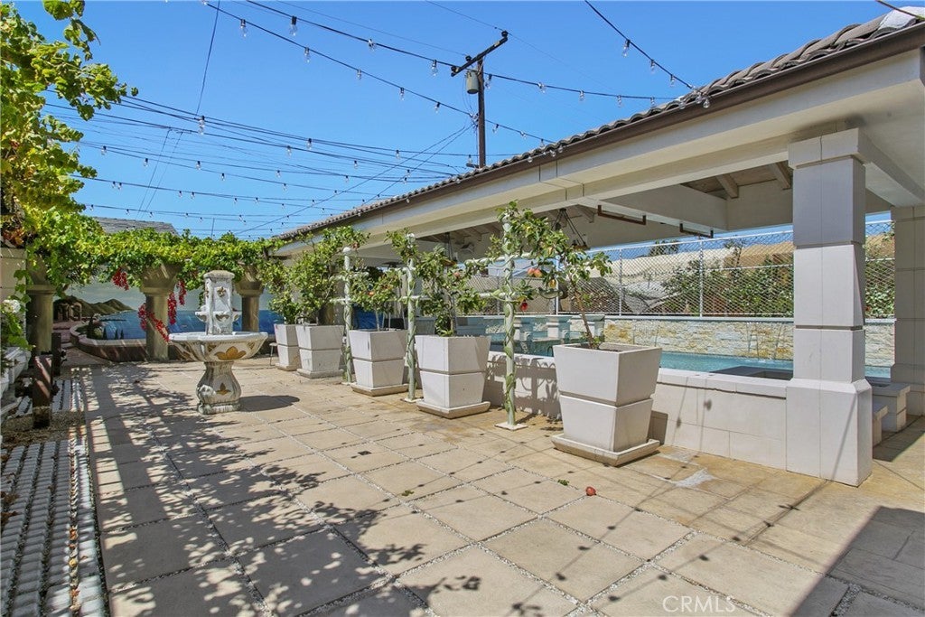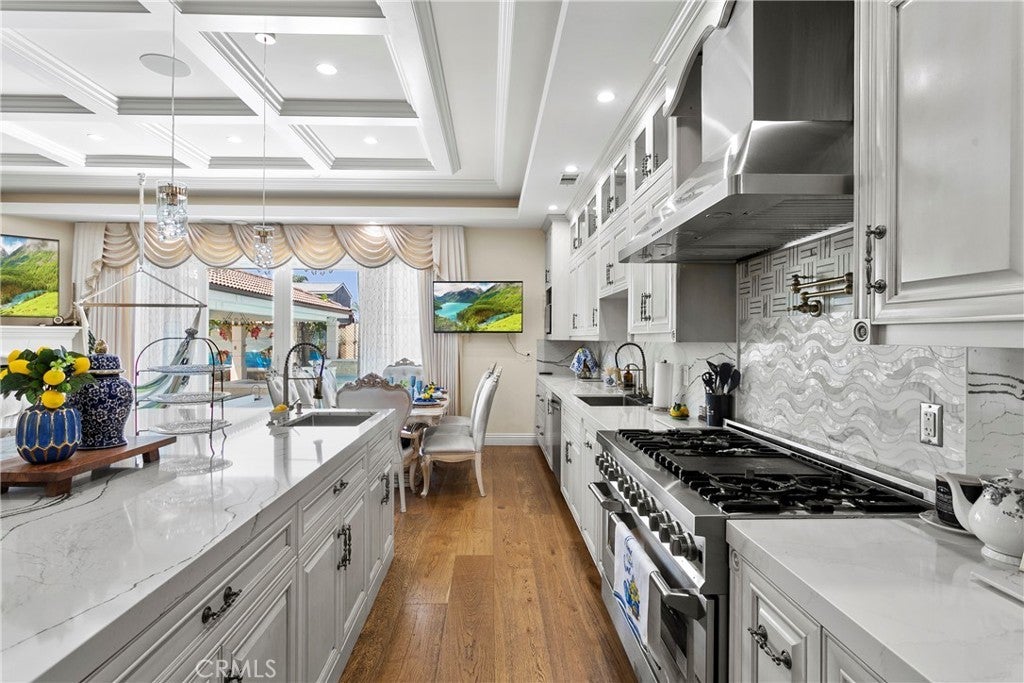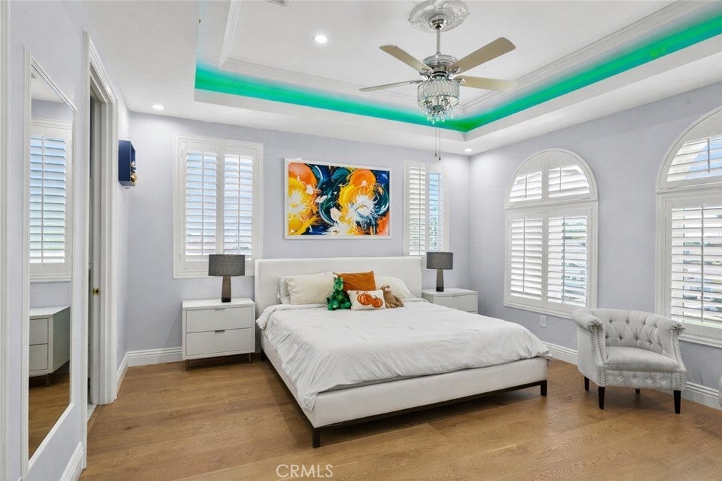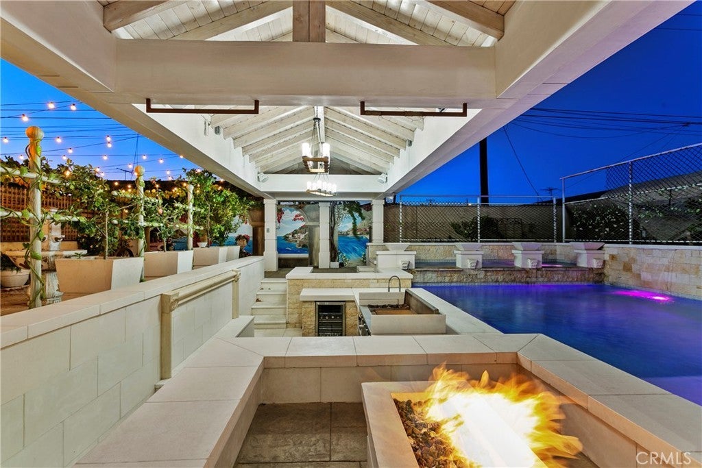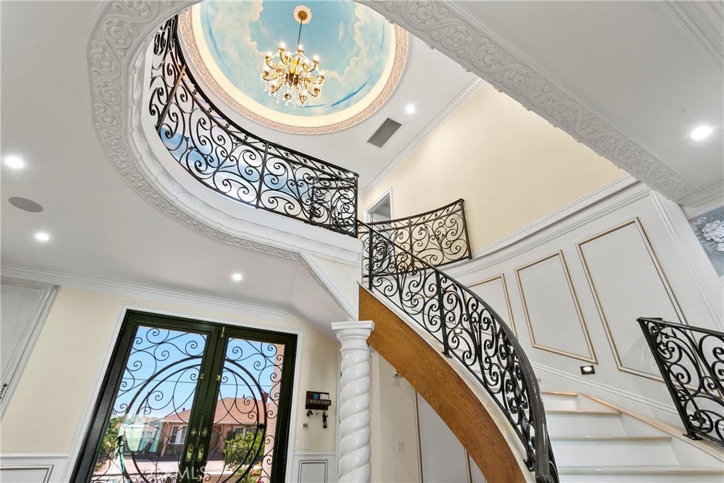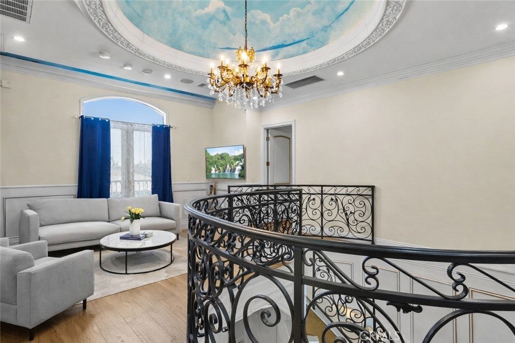 Rare opportunity to lease a spectacular custom-built Mediterranean luxury Smart Home (2020) offering resort-style living, exceptional craftsmanship, and modern technology throughout—ideal for executive living or discerning professionals seeking a private, turnkey residence. This extraordinary home features soaring 10-ft coffered ceilings, custom crown moldings, gold accents, rich wood and stone flooring, solid-core 8-ft doors, dual-pane fiberglass windows, plantation shutters, and a fully integrated Smart Home and intercom system allowing convenient control of lighting, pool features, and home systems from your smartphone. The living room showcases a dramatic built-in see-through saltwater aquarium with exotic fish, while the entry features a striking artistic wall installation with sculpted branches and floral detailing. All bedrooms function as private master suites with en-suite baths, walk-in closets, decorative soffits, chandeliers, LED ceiling lighting with remote controls, and Bluetooth speakers. Bathrooms feature Crema Marfil stone counters, freestanding soaking tubs, spa-style wet rooms, and premium finishes. The upstairs primary suite offers a luxurious retreat with dual walk-in closets, gas fireplace, Jacuzzi tub, Venetian plaster ceiling with gold veining, and a private balcony overlooking the backyard oasis. The gourmet chef’s kitchen includes quartz countertops, high-end range with pot filler, custom Antique White cabinetry, spice drawers, oversized island seating, and large sliding pocket doors opening seamlessly to the backyard. Outdoor living is designed for entertaining with a saltwater pool and spa with smartphone controls, waterfall, water jets, and color-changing LED lighting, plus a cabana featuring custom murals, built-in BBQ, refrigerator, Bluetooth sound system, and Baja shelf with bar seating. Additional highlights include a 3-car garage with RV hookups and EV charger, bonus room off the upstairs laundry, mature fruit trees, and an underground concrete-reinforced