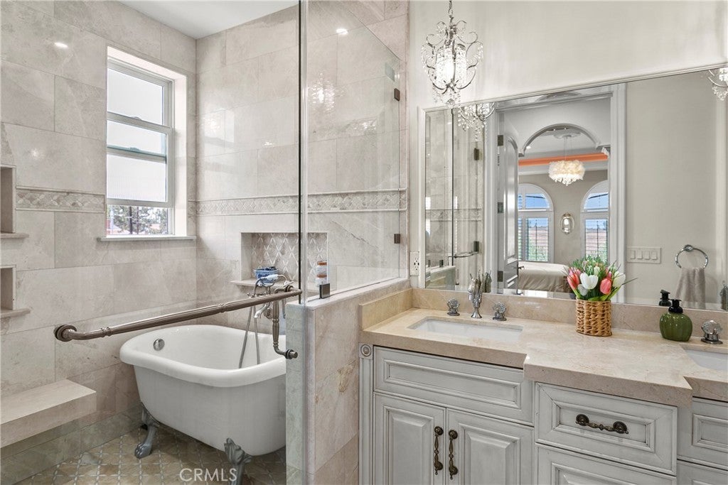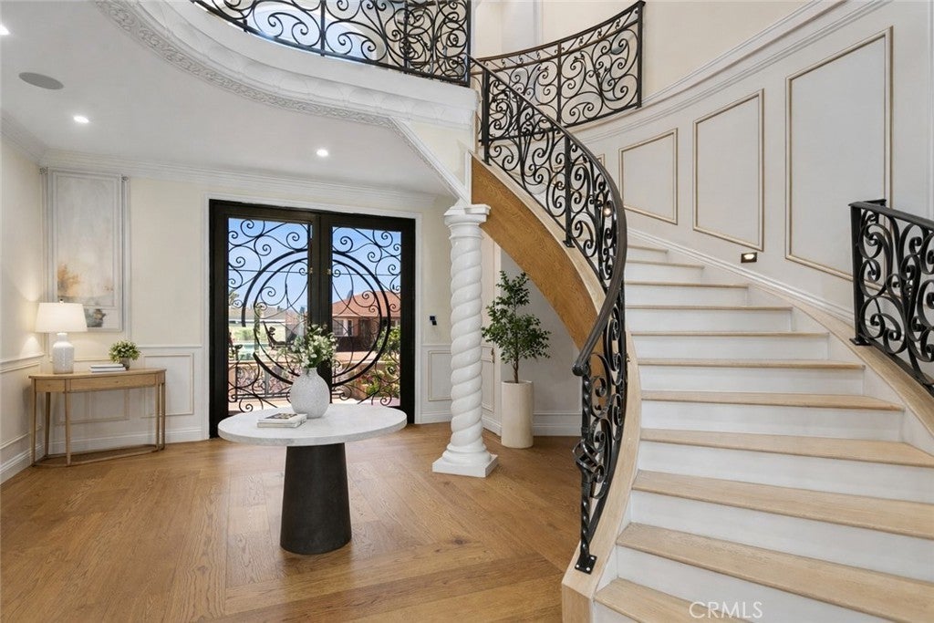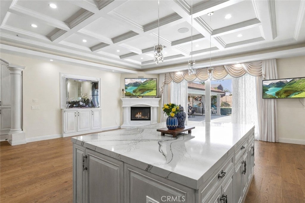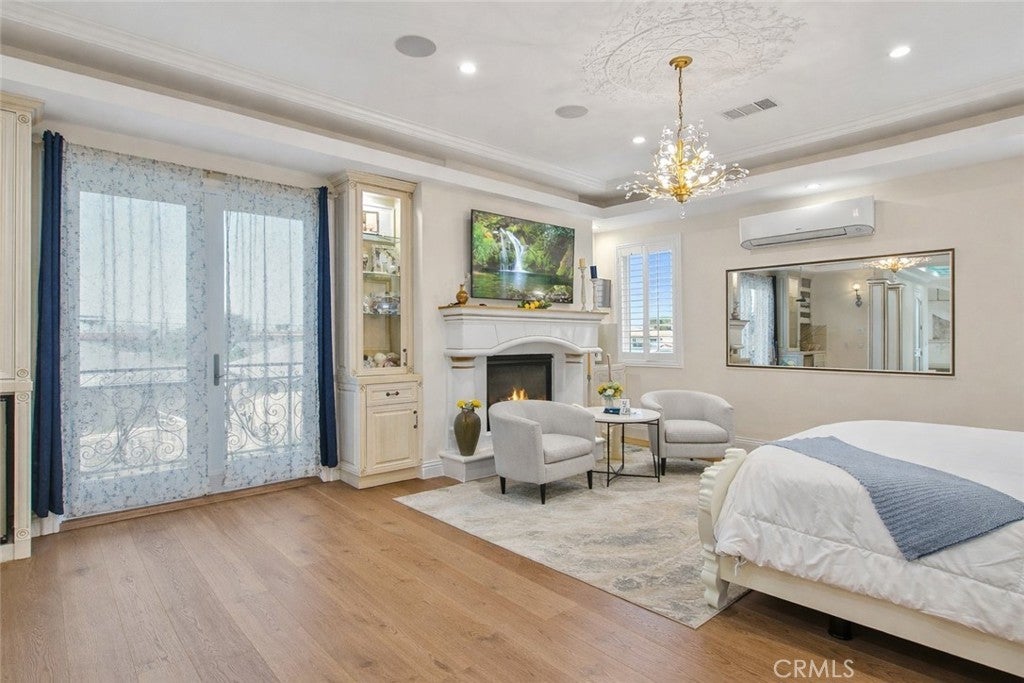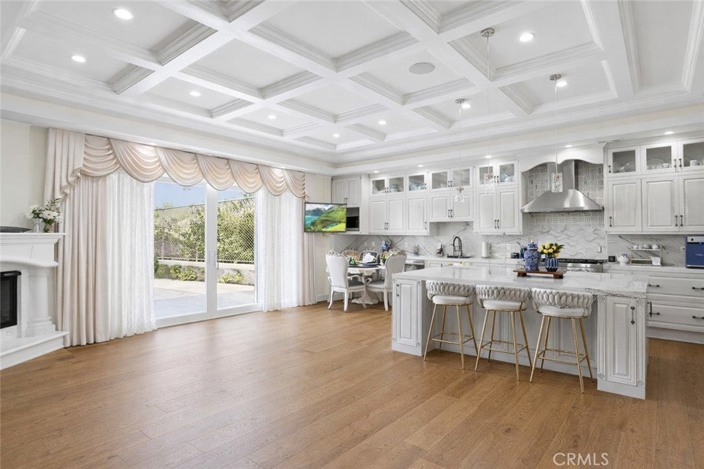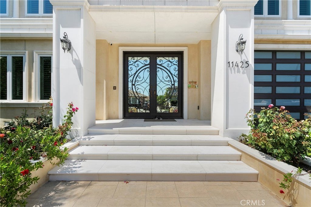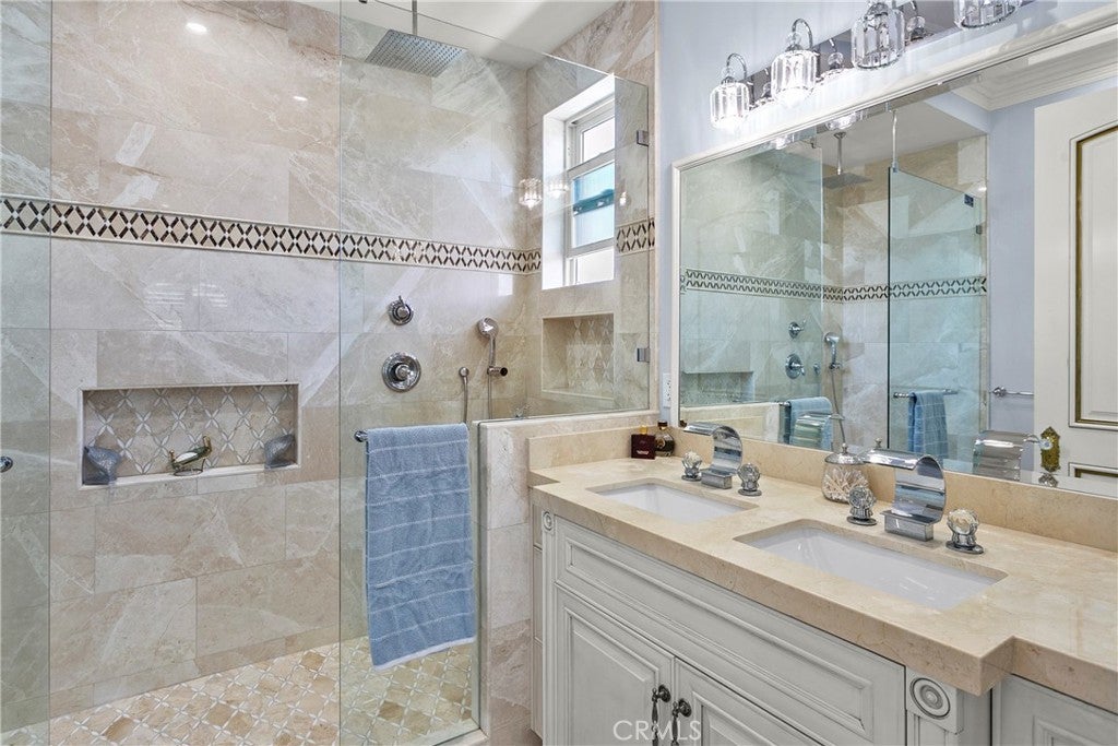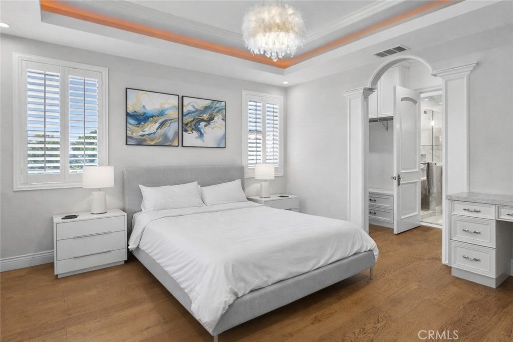 Rare opportunity to lease a spectacular custom-built Mediterranean luxury Smart Home (2020) offering resort-style living, exceptional craftsmanship, and modern technology throughout—ideal for executive living or discerning professionals seeking a private, turnkey residence. This extraordinary home features soaring 10-ft coffered ceilings, custom crown moldings, gold accents, rich wood and stone flooring, solid-core 8-ft doors, dual-pane fiberglass windows, plantation shutters, and a fully integrated Smart Home and intercom system allowing convenient control of lighting, pool features, and home systems from your smartphone. The living room showcases a dramatic built-in see-through saltwater aquarium with exotic fish, while the entry features a striking artistic wall installation with sculpted branches and floral detailing. All bedrooms function as private master suites with en-suite baths, walk-in closets, decorative soffits, chandeliers, LED ceiling lighting with remote controls, and Bluetooth speakers. Bathrooms feature Crema Marfil stone counters, freestanding soaking tubs, spa-style wet rooms, and premium finishes. The upstairs primary suite offers a luxurious retreat with dual walk-in closets, gas fireplace, Jacuzzi tub, Venetian plaster ceiling with gold veining, and a private balcony overlooking the backyard oasis. The gourmet chef’s kitchen includes quartz countertops, high-end range with pot filler, custom Antique White cabinetry, spice drawers, oversized island seating, and large sliding pocket doors opening seamlessly to the backyard. Outdoor living is designed for entertaining with a saltwater pool and spa with smartphone controls, waterfall, water jets, and color-changing LED lighting, plus a cabana featuring custom murals, built-in BBQ, refrigerator, Bluetooth sound system, and Baja shelf with bar seating. Additional highlights include a 3-car garage with RV hookups and EV charger, bonus room off the upstairs laundry, mature fruit trees, and an underground concrete-reinforced
