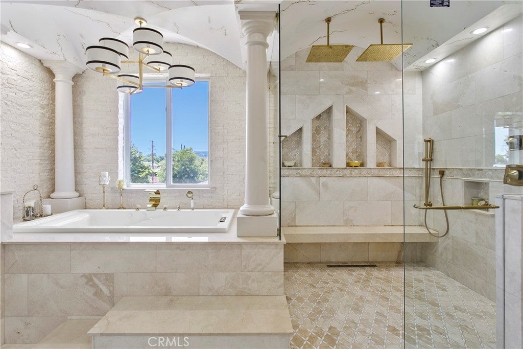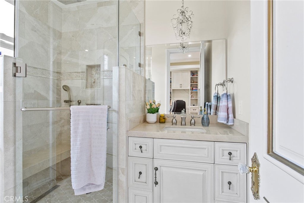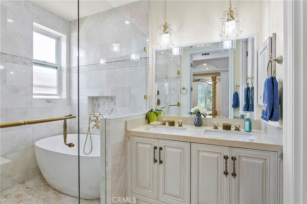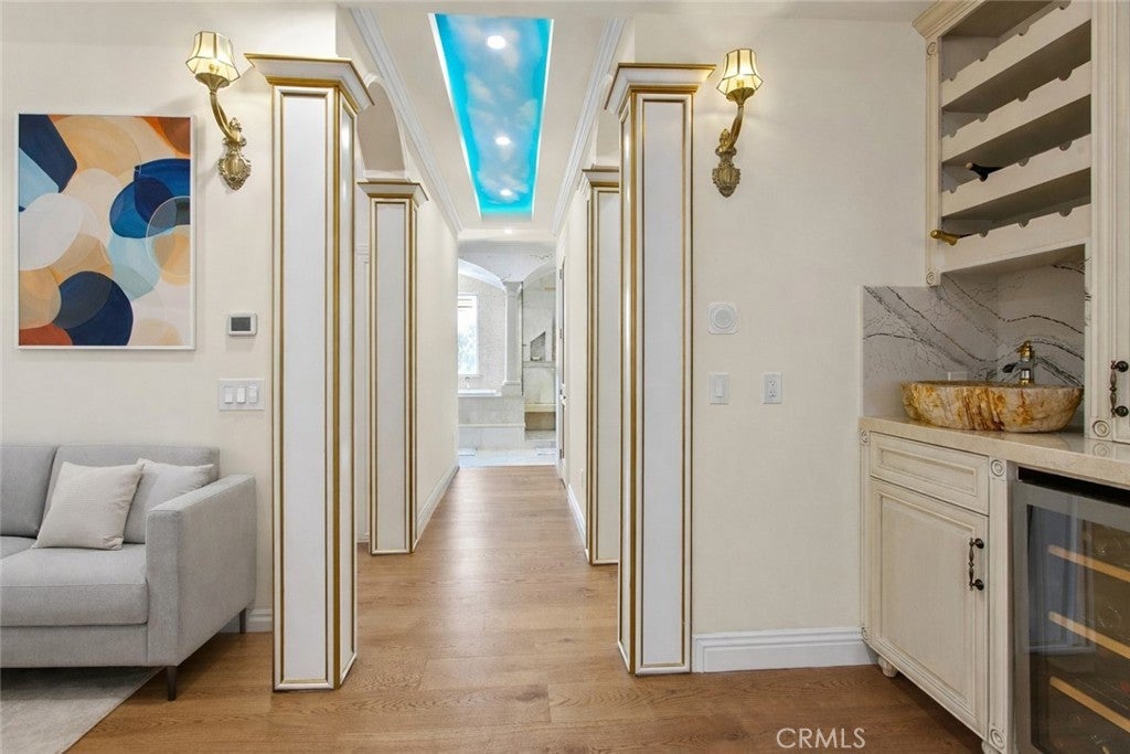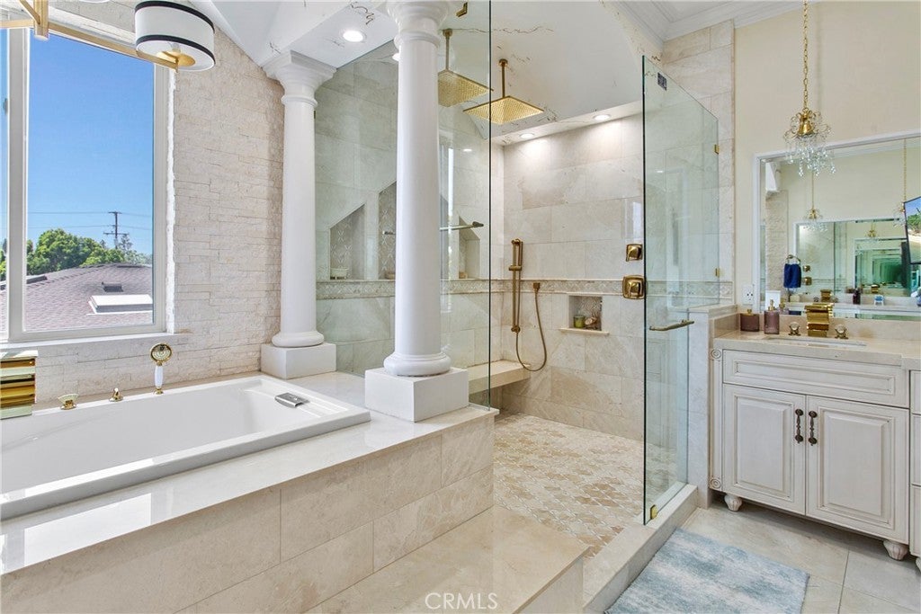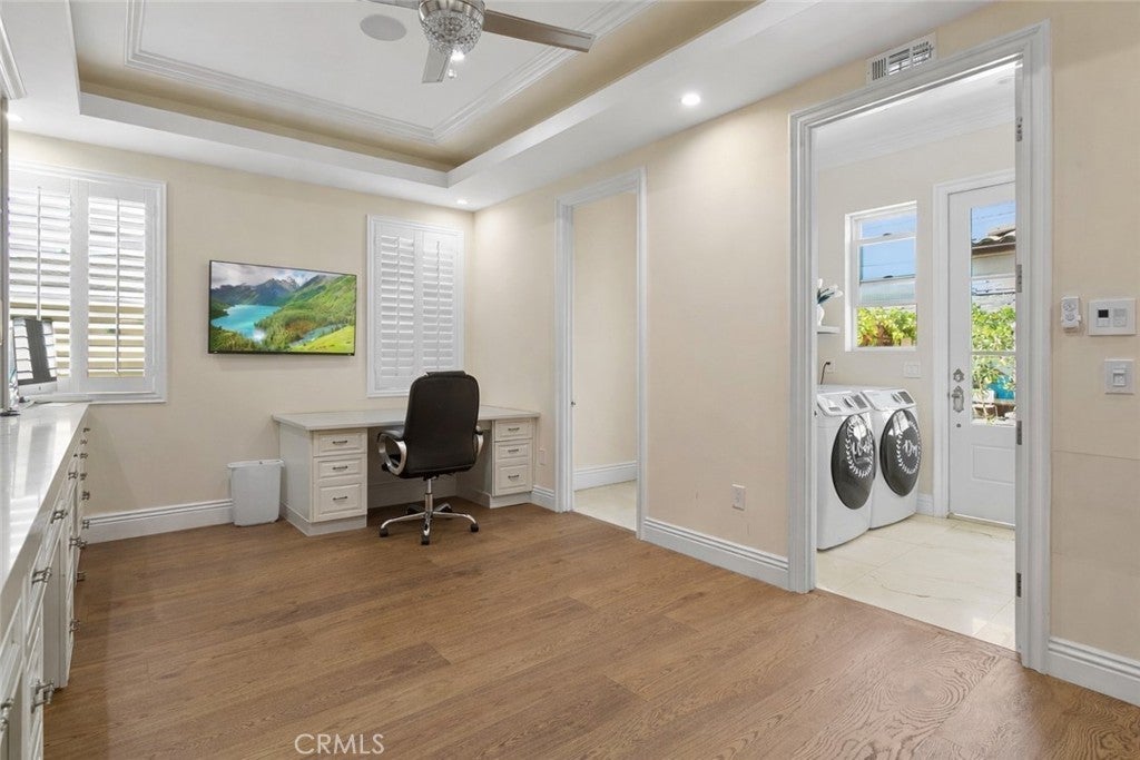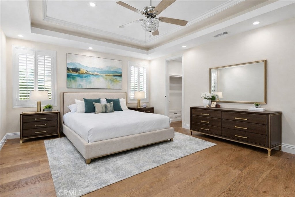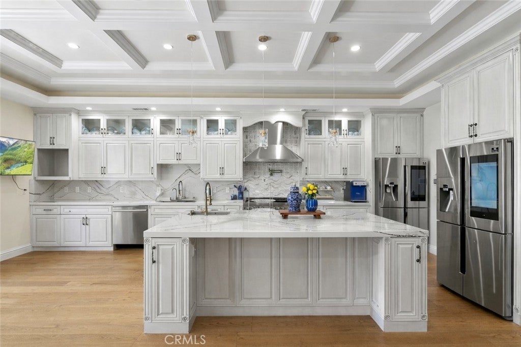 Rare opportunity to lease a spectacular custom-built Mediterranean luxury Smart Home (2020) offering resort-style living, exceptional craftsmanship, and modern technology throughout—ideal for executive living or discerning professionals seeking a private, turnkey residence. This extraordinary home features soaring 10-ft coffered ceilings, custom crown moldings, gold accents, rich wood and stone flooring, solid-core 8-ft doors, dual-pane fiberglass windows, plantation shutters, and a fully integrated Smart Home and intercom system allowing convenient control of lighting, pool features, and home systems from your smartphone. The living room showcases a dramatic built-in see-through saltwater aquarium with exotic fish, while the entry features a striking artistic wall installation with sculpted branches and floral detailing. All bedrooms function as private master suites with en-suite baths, walk-in closets, decorative soffits, chandeliers, LED ceiling lighting with remote controls, and Bluetooth speakers. Bathrooms feature Crema Marfil stone counters, freestanding soaking tubs, spa-style wet rooms, and premium finishes. The upstairs primary suite offers a luxurious retreat with dual walk-in closets, gas fireplace, Jacuzzi tub, Venetian plaster ceiling with gold veining, and a private balcony overlooking the backyard oasis. The gourmet chef’s kitchen includes quartz countertops, high-end range with pot filler, custom Antique White cabinetry, spice drawers, oversized island seating, and large sliding pocket doors opening seamlessly to the backyard. Outdoor living is designed for entertaining with a saltwater pool and spa with smartphone controls, waterfall, water jets, and color-changing LED lighting, plus a cabana featuring custom murals, built-in BBQ, refrigerator, Bluetooth sound system, and Baja shelf with bar seating. Additional highlights include a 3-car garage with RV hookups and EV charger, bonus room off the upstairs laundry, mature fruit trees, and an underground concrete-reinforced