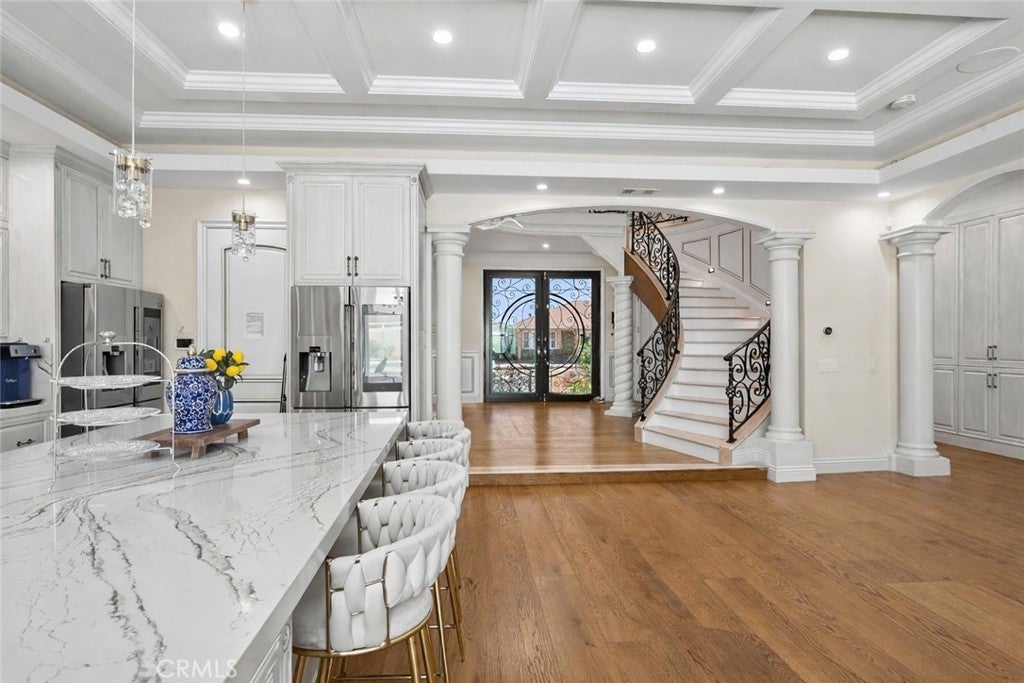 Breakfast Bar, Built-in Features, Balcony, Ceiling Fan(s), Separate/Formal Dining Room, High Ceilings, Pantry, Quartz Counters, Recessed Lighting, Attic, Bedroom on Main Level, Entrance Foyer, Loft, Primary Suite, Walk-In Closet(s), Central Vacuum, Coffered Ceiling(s), Intercom, Multiple Primary Suites, Pull Down Attic Stairs
