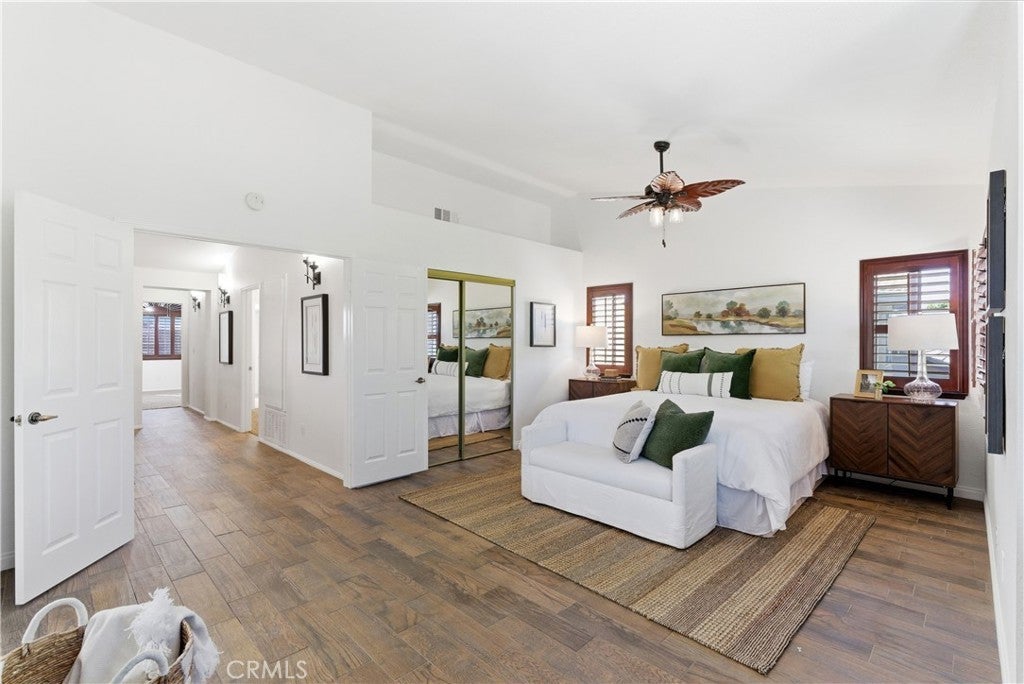 Private swimming pool and spa oasis in sought-after Terra Linda Estates, Yorba Linda! This spacious, sun drenched single family home offers impressive scale and seamless indoor outdoor flow. A dramatic two-story foyer welcomes you into hardwood floors and a formal dining room with vaulted cathedral ceilings. The open-concept family room connects to an eat-in kitchen with casual dining, walk-in pantry, cozy fireplace, and multiple sliding doors to the backyard. Plantation shutters bathe the interior in natural light. A main level bedroom and full bath with exterior access provide ideal flexibility for a home office, guest suite, or multigenerational living. The main floor also includes the laundry room and access to a large 3-car garage. Upstairs, the luxurious primary suite features soaring vaulted ceilings, a generous walk-in closet, private sitting area with bay window, and a two-sided fireplace shared with the spa-like primary bath (soaking tub, separate shower, double vanity). Two additional bedrooms with high ceilings and ceiling fans share a convenient Jack-and-Jill bathroom. The private backyard haven includes mature palms, lush landscaping, privacy walls, expansive sun-filled patio, grassy lawn, terraced planters, and gated side access to the sparkling pool and spa. Nestled in the small, peaceful Terra Linda Estates community with multiple parks, walking paths, and a tot lot playground with picnic tables—all minutes from shopping, restaurants, top-rated Yorba Linda schools, and easy freeway access. This home combines generous space, comfort, and an unbeatable neighborhood lifestyle.