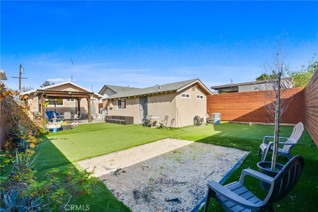 Welcome home! This charming starter home is full of potential and ideal for a first-time buyer in Bellflower. While the property profile reflects a 2-bedroom, 1-bath layout, the home features 3 bedrooms and 1 bathroom. The bedrooms are spacious with wood flooring and blackout blinds, along with a beautifully updated bathroom featuring a tub/shower combination and tile flooring with "Central HVAC." The property is fully enclosed with an iron fence and offers ample parking, including a long driveway. A private front porch with a newer front door welcomes you into an open, bright living room filled with natural light, which features newer windows, ceiling fans in all the rooms, wood flooring, and a cozy fireplace. The recently remodeled kitchen features countertops and tile flooring, creating a warm, functional space. A separate laundry area leads conveniently to the backyard. The backyard is perfect for entertaining, complete with low-maintenance turf—ideal for hosting gatherings year-round and a pergola covered seating area. The garage includes a shower and open space, offering excellent potential for a future ADU. Close to the Mall, Grocery Stores, Downtown Bellflower and the 110 /105 / 605 freeways. This is a must-see property to truly appreciate its value and possibilities!