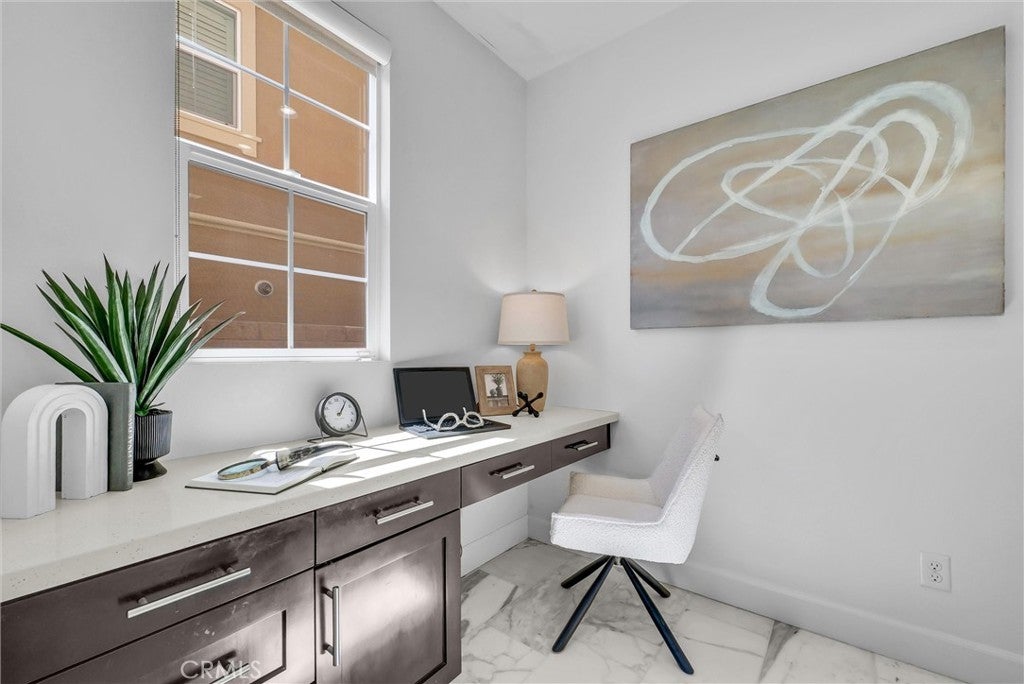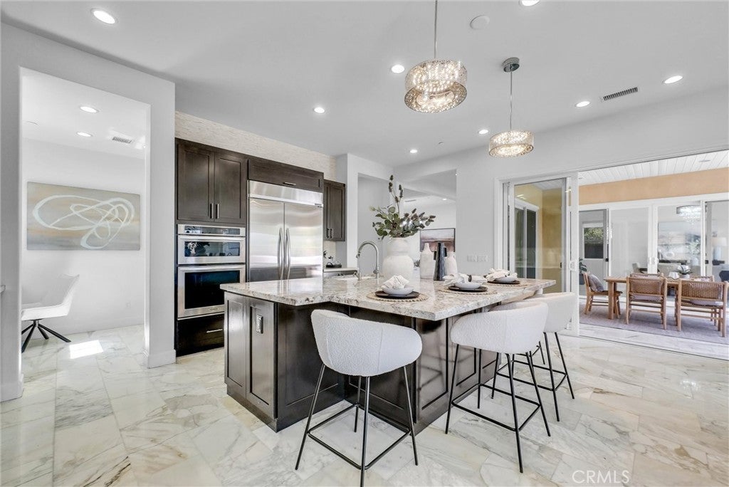 Stunning 5BD / 5.5BA residence in the prestigious Blackstone community of Brea, offering breathtaking mountain and city lights views. Thoughtfully designed for both everyday living and elevated entertaining, this home showcases an open and inviting floor plan with elegant marble flooring throughout the main living areas downstairs, complemented by recently upgraded luxury vinyl plank flooring from the staircase through the entire second floor & all bedrooms, creating a seamless, modern aesthetic. The gourmet kitchen is the heart of the home, featuring a spacious walk-in pantry, ample cabinetry, and seamless flow into both formal and informal dining areas. The family room & upstairs loft/media room are enhanced with mounted speakers, perfect for immersive entertainment. All 5 bedrooms are en-suite, offering comfort and privacy for every member of the household. The expansive primary suite serves as a private retreat, complete with its own balcony, a spa-inspired bath with dual vanities, a soaking tub, oversized shower, and a generous walk-in closet. Designed to embrace California living, 4 sets of sliding glass doors create a beautiful connection between indoor and outdoor spaces, filling the home with natural light and enhancing the open, airy feel. These doors lead to a well-appointed California Room, ideal for seamless indoor-outdoor entertaining. The professionally landscaped front & backyard feature low-maintenance artificial turf, 2 tranquil fountains, and a built-in gas fire pit with seating ~ perfect for gatherings or quiet evenings under the stars. This home offers two balconies: a shared balcony with access from both the primary suite & the loft, capturing stunning sunrise and sunset views. A secondary front-facing balcony connected to one of the en-suite bedrooms, adding charm and versatility. Additional highlights include paid-off Solar (20-panels) and an EV charger, providing energy efficiency & long-term savings. A rare opportunity to own a beautifully upgraded home in one of Brea’s most sought-after communities where luxury, comfort, and lifestyle come together effortlessly.
