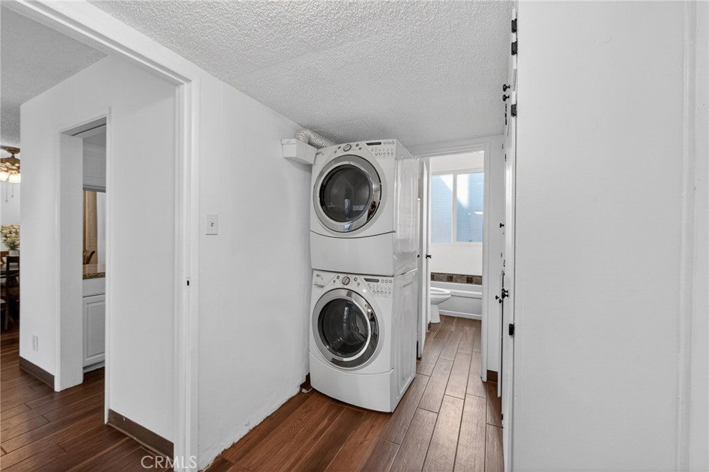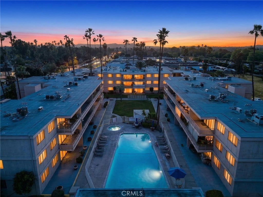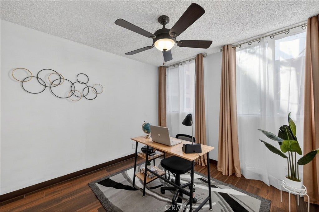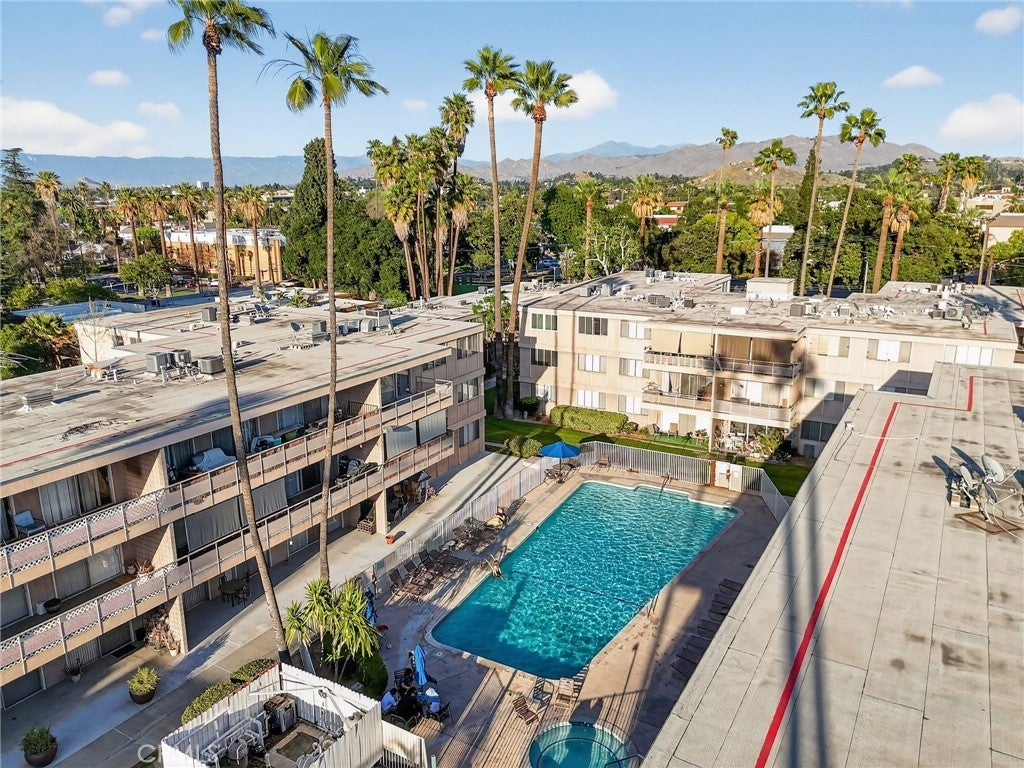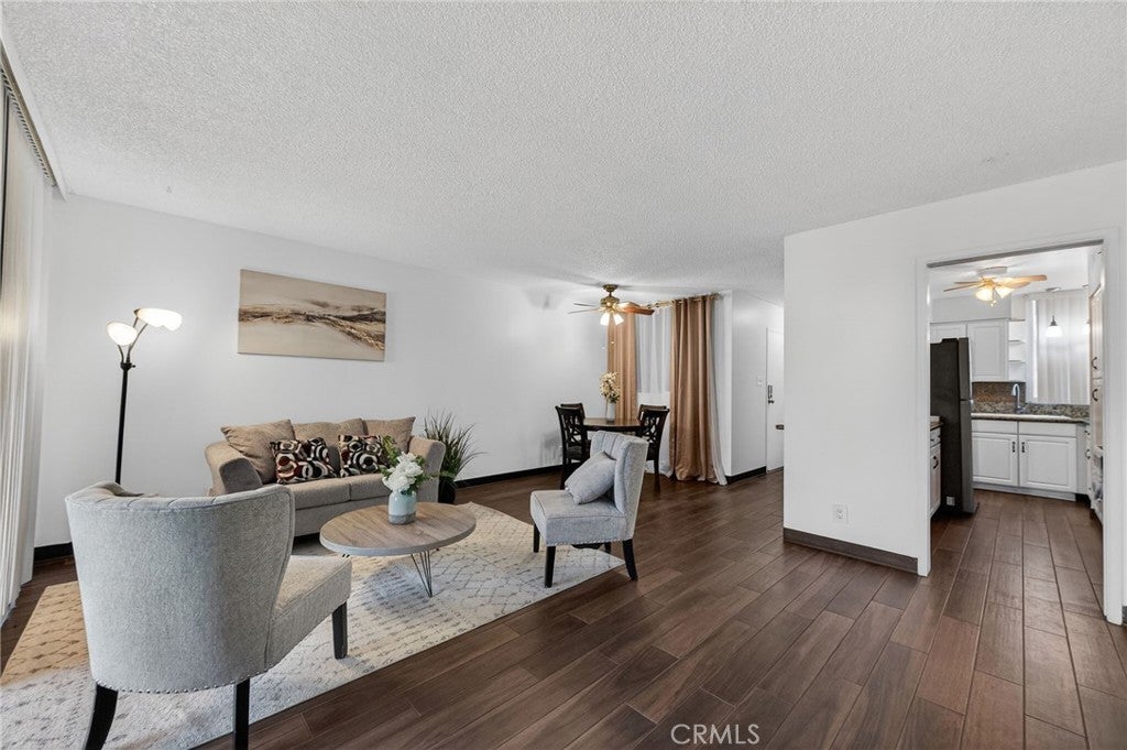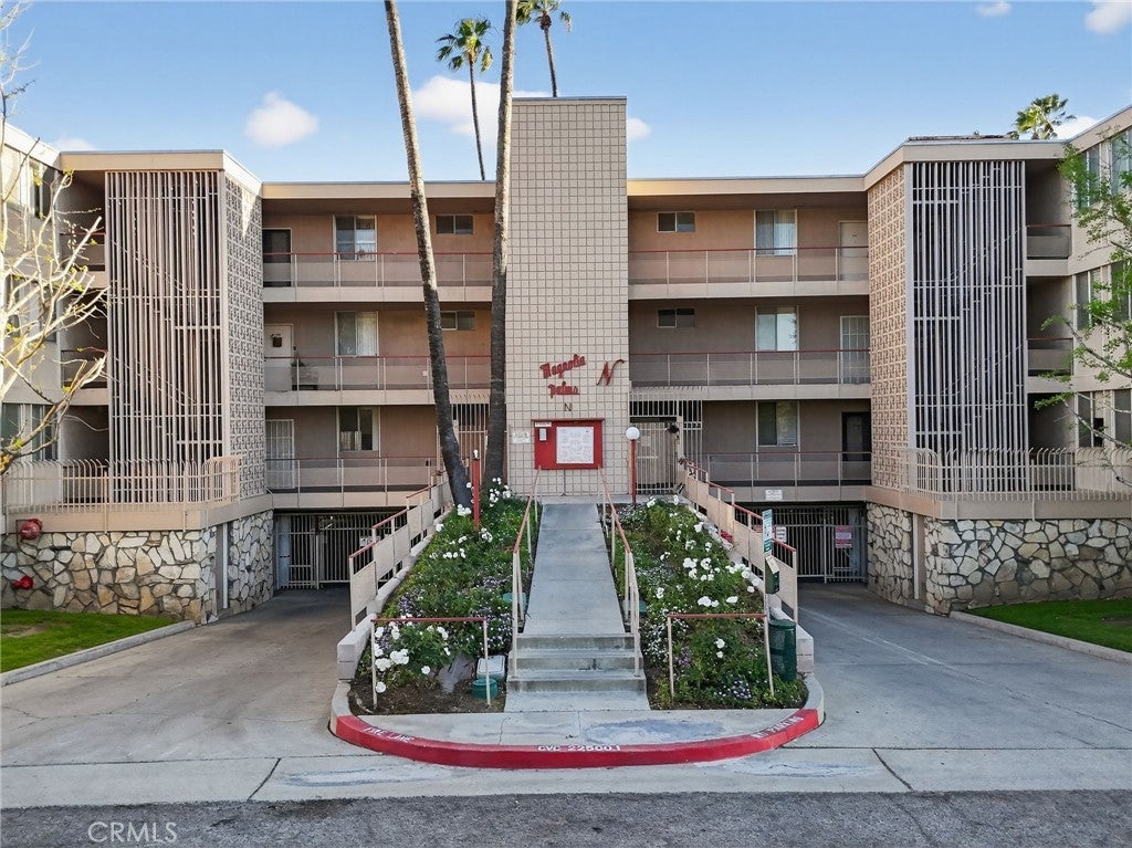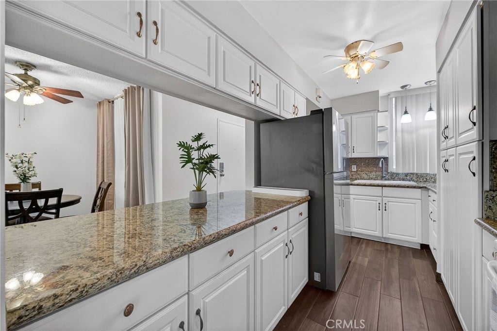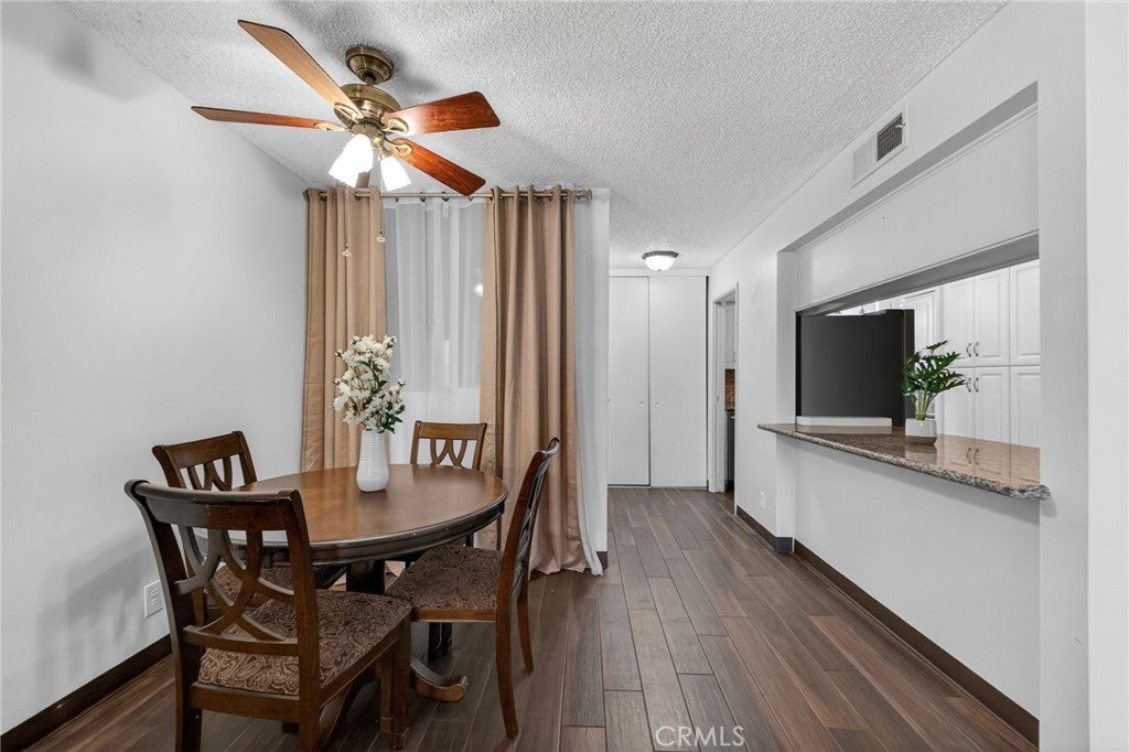 Welcome to Magnolia Palms, where first-floor living and a practical floor plan come together in a gated Riverside community. This 2-bedroom, 1-bath condominium offers a spacious living and dining area with wood-look flooring and large sliding glass doors leading to a covered patio with courtyard outlooks. The galley kitchen provides ample cabinetry, generous counter space, and a breakfast bar/pass-through that keeps the layout open to the main living area. Both bedrooms are well-proportioned and offer flexibility for everyday living, guest accommodations, or office use. Interior features also include ceiling fans, substantial storage, and a bathroom with built-in cabinetry and distinctive vanity design. Community amenities include pool and spa, with convenient access to nearby shopping, dining, and commuter routes.