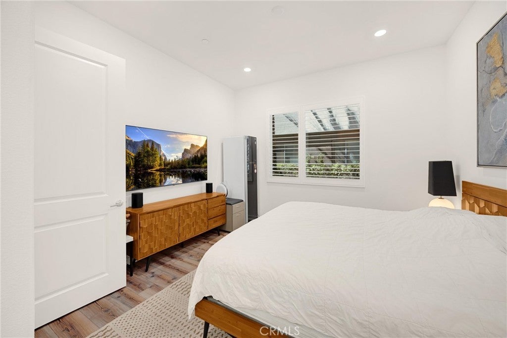 Better-than-new ground-level corner condo in Anaheim’s desirable Platinum Triangle. Light-filled and gently used as a second home (occupied only once per year since 2024), this private, quiet unit overlooks the pool, spa, and BBQ area. Open-concept layout with gourmet kitchen featuring granite countertops, stainless steel appliances, and elegant finishes flowing into a spacious living area. Upgrades include custom plantation shutters, Deuchateau exotic European hardwood flooring in bedroom and closet, and window tinting for added privacy and energy efficiency. Primary suite offers walk-in closet and spa-style bath with rain shower. Private patio perfect for relaxing. Ground-level location with only two units on the entire floor—one at each corner—offering exceptional privacy and a rare, almost single-family home feel. Prime location near Angel Stadium, dining, shopping, and entertainment. Move-in ready!