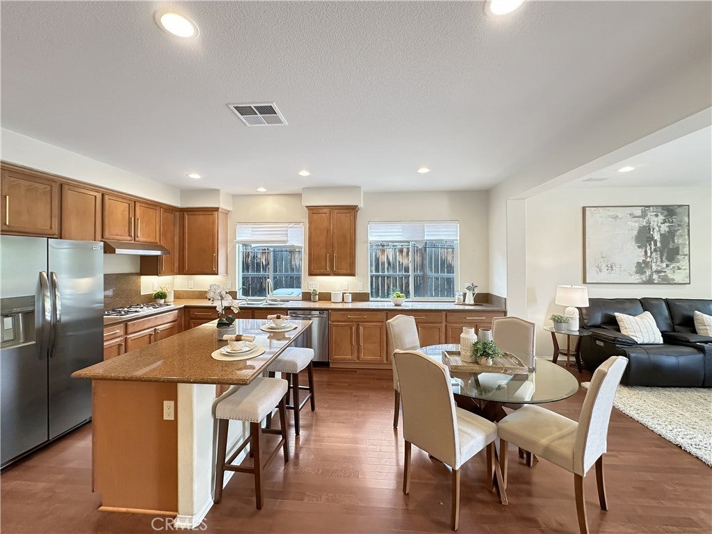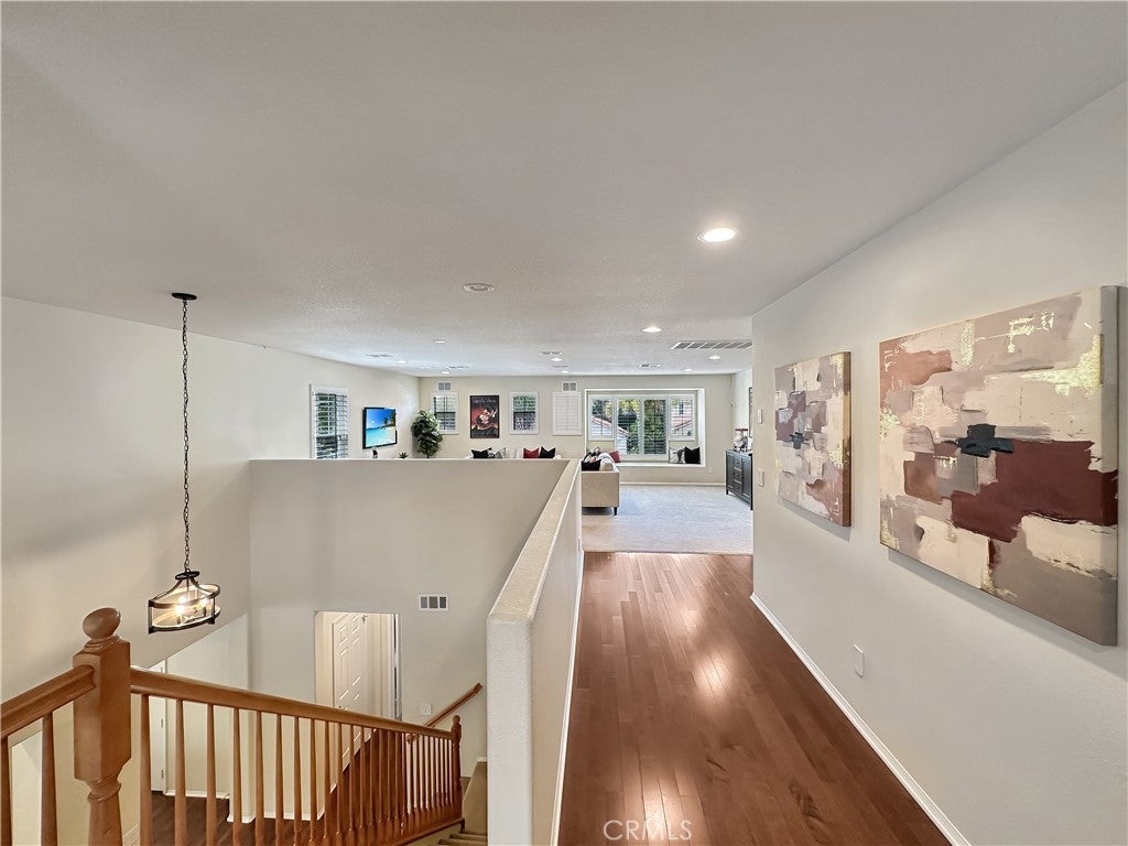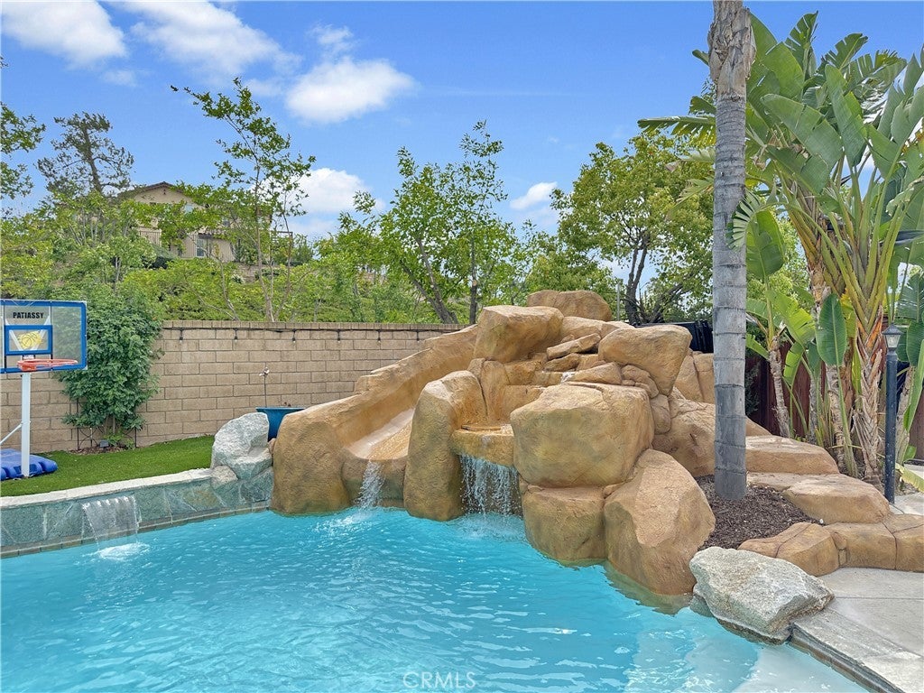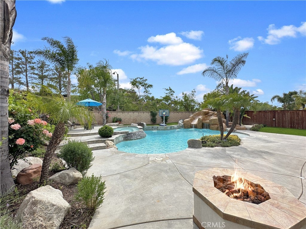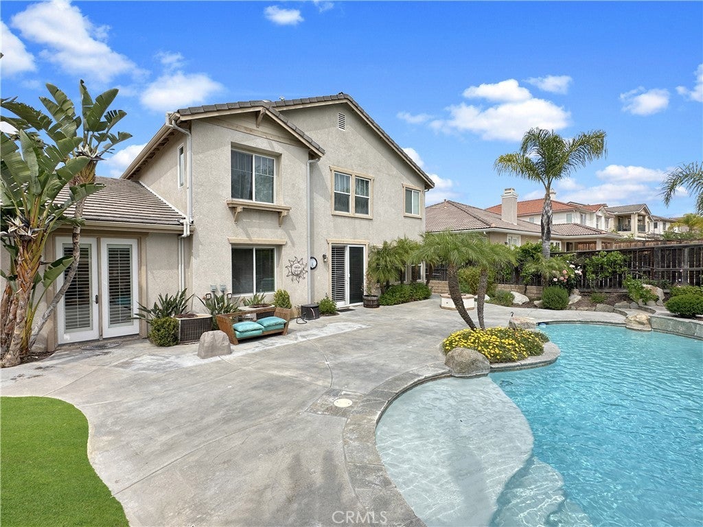 Stunning Crowne Hill pool home now features a newly plastered saltwater pool and offers the perfect blend of comfort, function, and resort-style living just minutes from Temecula wine country. Desirable floor plan includes a downstairs bedroom, full bath, and private office with double glass doors, ideal for guests, multigenerational living, or working from home. Rich hardwood flooring flows through most of the home, with a formal dining room positioned for easy entertaining and poolside views. The kitchen features granite countertops, gas cooktop, microwave, double ovens, center island with bar seating, and a butler’s pantry and a brand-new stainless refrigerator. Recently updated laundry room adds a modern touch with brand-new washer and dryer. Spacious family room includes a gas fireplace and direct backyard access for seamless indoor-outdoor living. Plantation shutters throughout most of the home. Upstairs offers a large loft, media/office nook, spacious primary suite with French door entry, dual sinks, soaking tub, separate shower, and walk-in closet with custom built-ins, plus two additional bedrooms and a full bath. Additional upgrades include QuietCool whole-house fan and solar for energy efficiency. Both front and backyards feature extensive hardscape and landscape. The private backyard is an entertainer’s dream with a newly plastered saltwater pool, rock slide, waterfall, spa, pool fence, tropical landscaping, plum tree, grapevines, expansive patio, and fire pit seating area. Located in one of Temecula’s most sought-after neighborhoods near top-rated schools, shopping, and award-winning wineries.