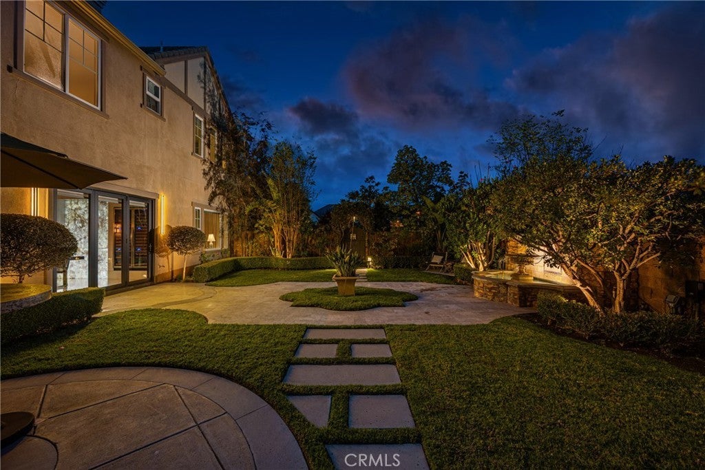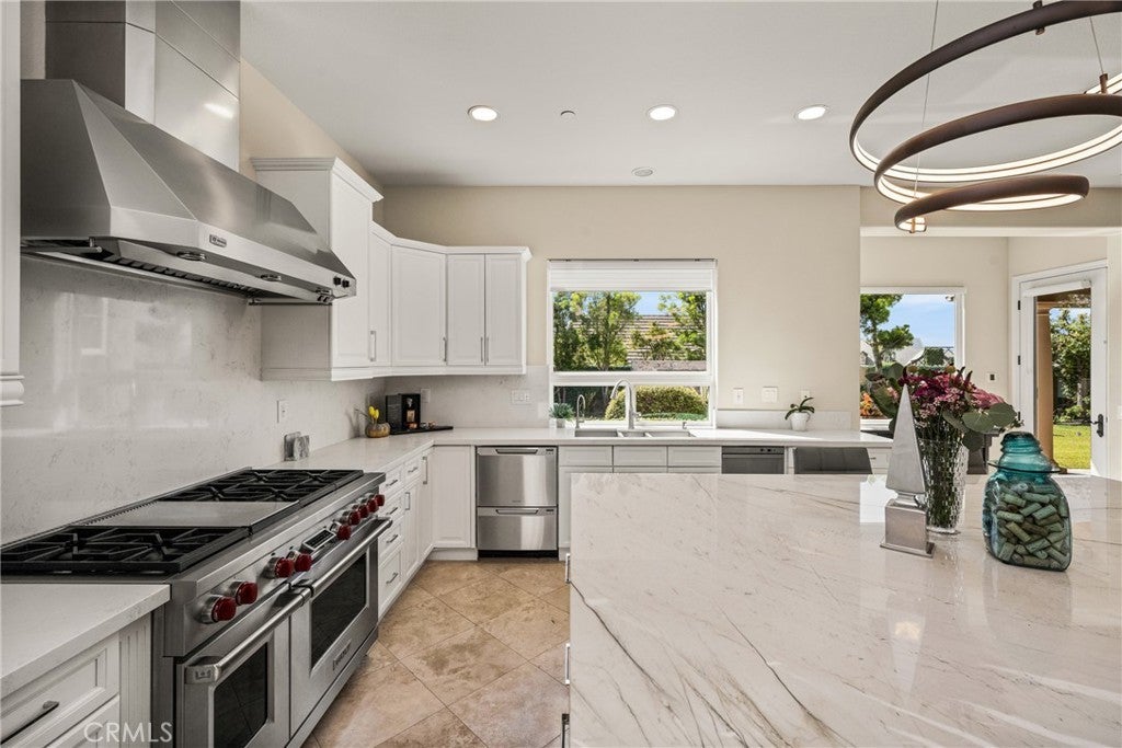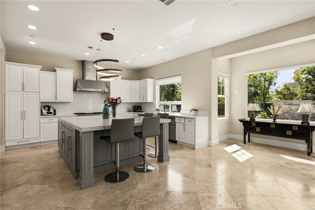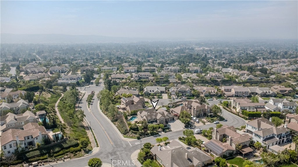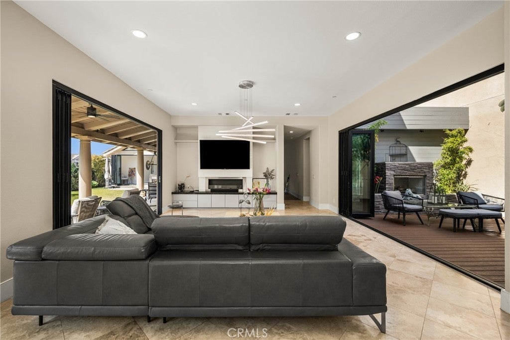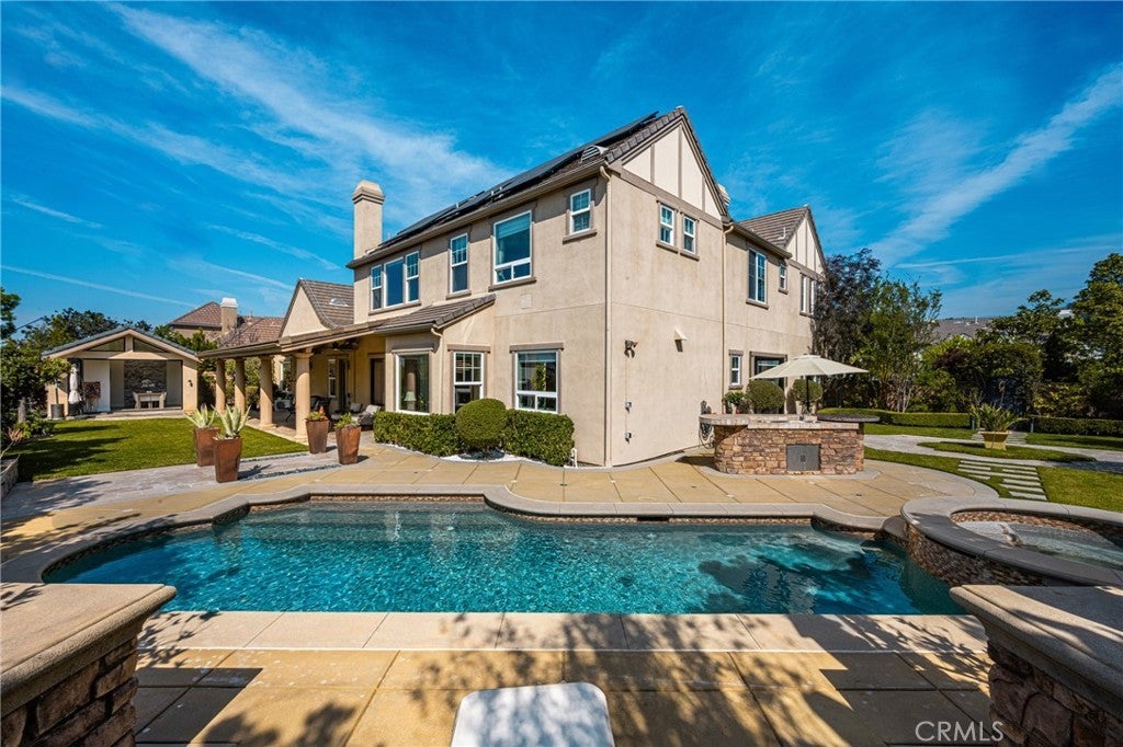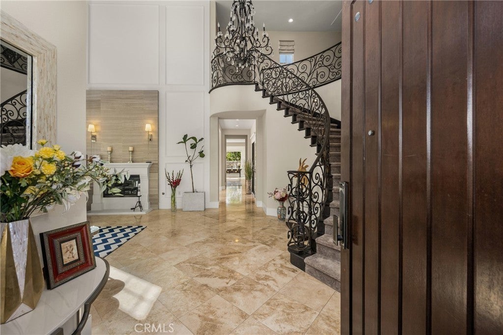 Located in the prestigious Kerrigan Ranch, this high-end masterpiece is a 4,999-square-foot "3X Model" estate situated on a rare, flat 18,121-square-foot lot with over $800,000 in recent luxury upgrades. The property commands attention with its impressive street frontage and an expansive driveway offering tons of parking, complemented by custom iron gates providing potential RV parking. Every inch of the interior is defined by high-end finishes, from the polished travertine floors to a culinary kitchen with an expanded marble island and a remodeled dining room anchored by stunning backlit transparent marble. Designed for the ultimate indoor-outdoor lifestyle, the estate features four black accordion folding glass doors that transition seamlessly to a remodeled central courtyard, a resort-style backyard, and a lush garden. One of these signature doors opens to an approximately 240-square-foot remodeled pool house, which features a convenient half-bathroom. The outdoor oasis is completed by a sparkling pool, a dedicated bar with a sink, and a back patio equipped with heaters and fans for year-round comfort. This estate is as efficient as it is elegant, featuring 50 paid-off solar panels, an electric vehicle charger, and a sanctuary-like primary suite with breathtaking Catalina Island views, all within the award-winning Yorba Linda High School boundaries.