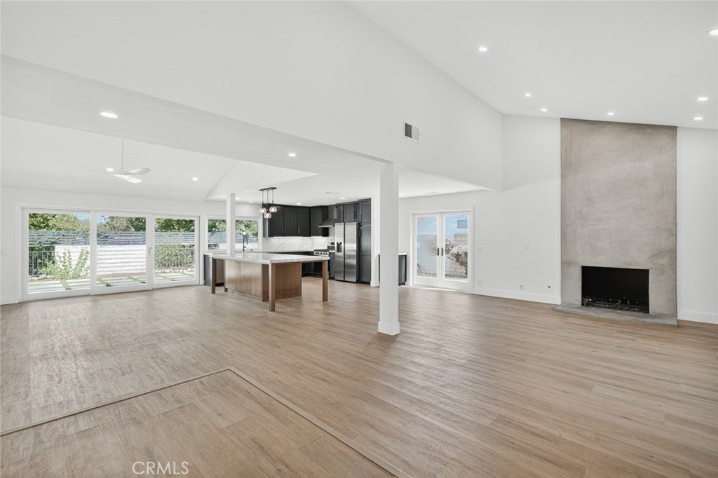 Discover this beautifully designed 4-bedroom, 2-bathroom single-story home offering 2,038 sq ft of open and inviting living space. The open floor plan is filled with abundant natural light from large glass doors and multiple windows, creating a bright and airy atmosphere throughout. The kitchen is both stylish and functional,featuring a center island perfect for casual dining, along with ample counter space and generous storage. The living room serves as a stunning focal point with a dramatic floor-to-ceiling fireplace, ideal for relaxing or entertaining. Situated on a spacious 9,583 sq ft lot, the exterior is equally impressive with a modern permeable patio and a large in-ground pool that thoughtfully wraps around the corner of the home, maximizing outdoor living space. This home seamlessly blends comfort, design, and indoor-outdoor living.