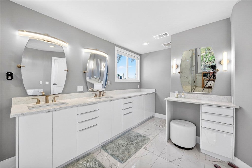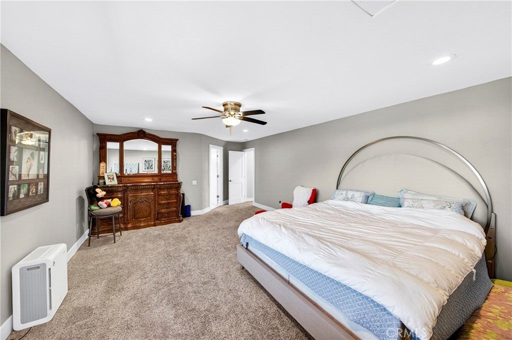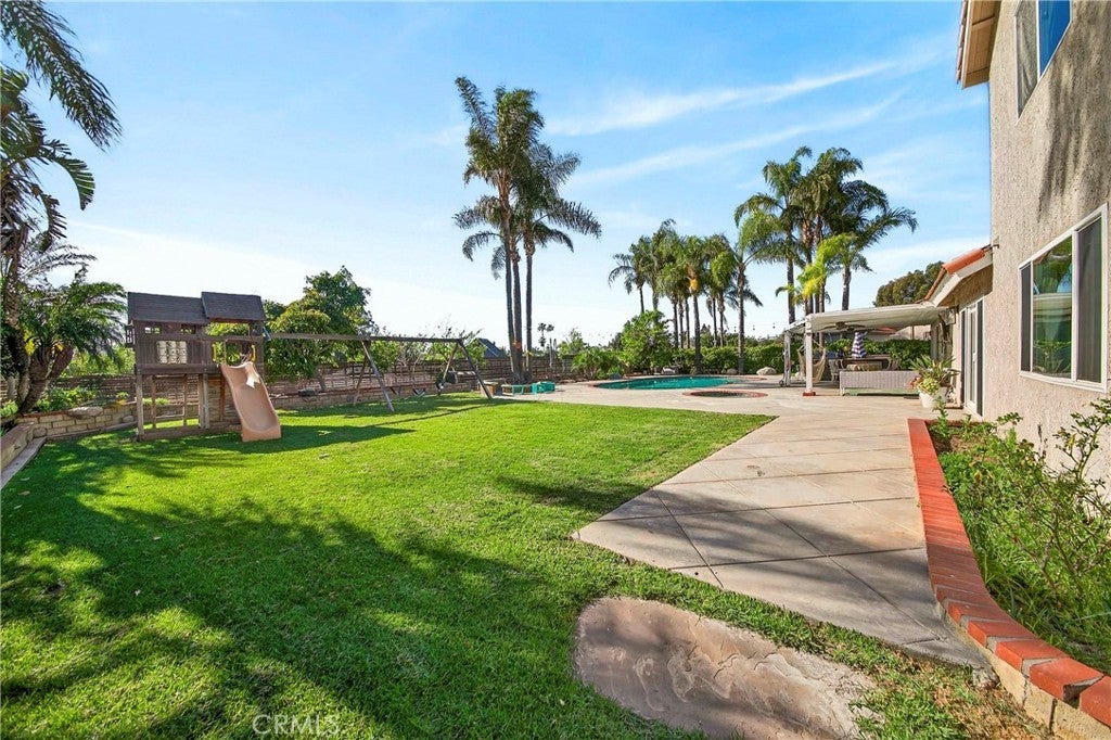 Wow! What more could you want in this exquisitely remodeled two-story sanctuary situated at the end of a quiet cul-de-sac on a massive lot with peek-a-boo views and a FULLY PAID-OFF SOLAR SYSTEM for ultimate energy savings. This versatile floor plan offers 5 spacious bedrooms and 4 full baths, perfectly distributed with three bedrooms on the main floor (including one en-suite) and two additional en-suite bedrooms upstairs. As you enter from the front porch, you are greeted by sleek porcelain tile floors, wood plank ceilings with recessed lighting, and smooth-surface walls. The open-concept gourmet kitchen is a chef’s dream, featuring sleek cabinetry with incredible storage, a massive center island, elegant quartz countertops, and premium appliances. The family room, anchored by a newly refaced fireplace, flows effortlessly through sliding glass doors to a resort-style backyard. Outside, enjoy a sparkling pool and spa, a built-in BBQ island, a large grass area, and a fruit-bearing avocado tree, all beautifully illuminated by professional string lighting. For those with toys, there is a 3-car garage and massive RV parking that fits a 45ft coach. The upstairs is highlighted by a luxurious primary suite with a standalone tub, walk-in shower with Satori porcelain tile, and an expansive walk-in closet. With fresh paint, dual-pane windows, and direct gate access to local trails, this home in the award-winning Placentia-Yorba Linda Unified School District is the perfect blend of luxury, convenience, and modern efficiency.