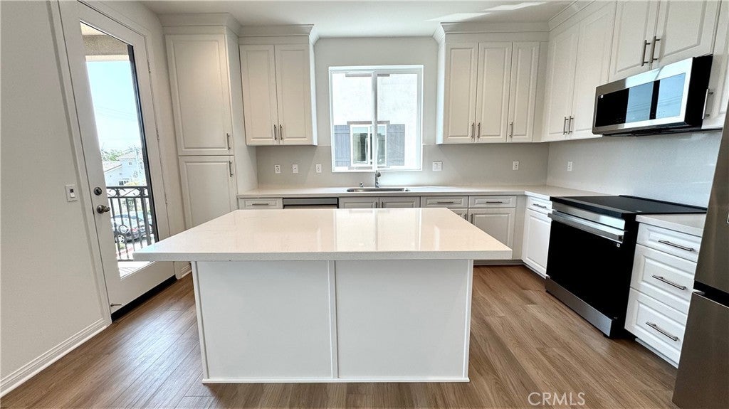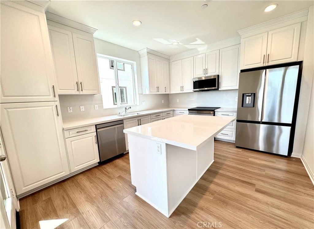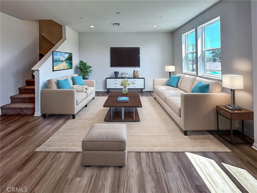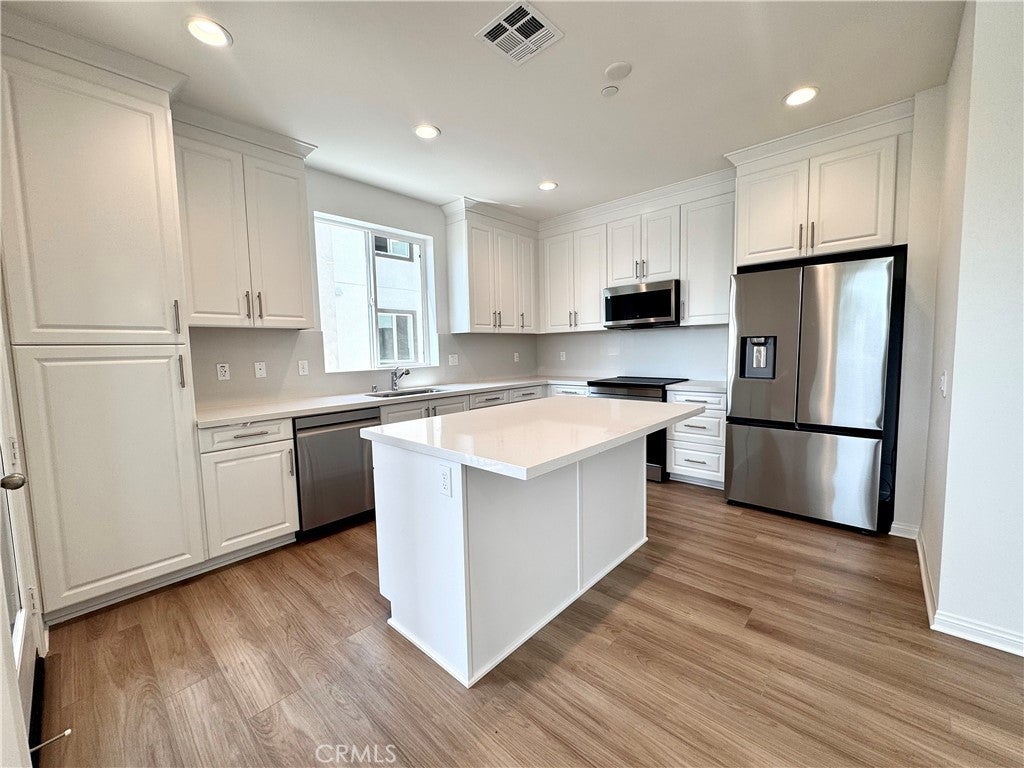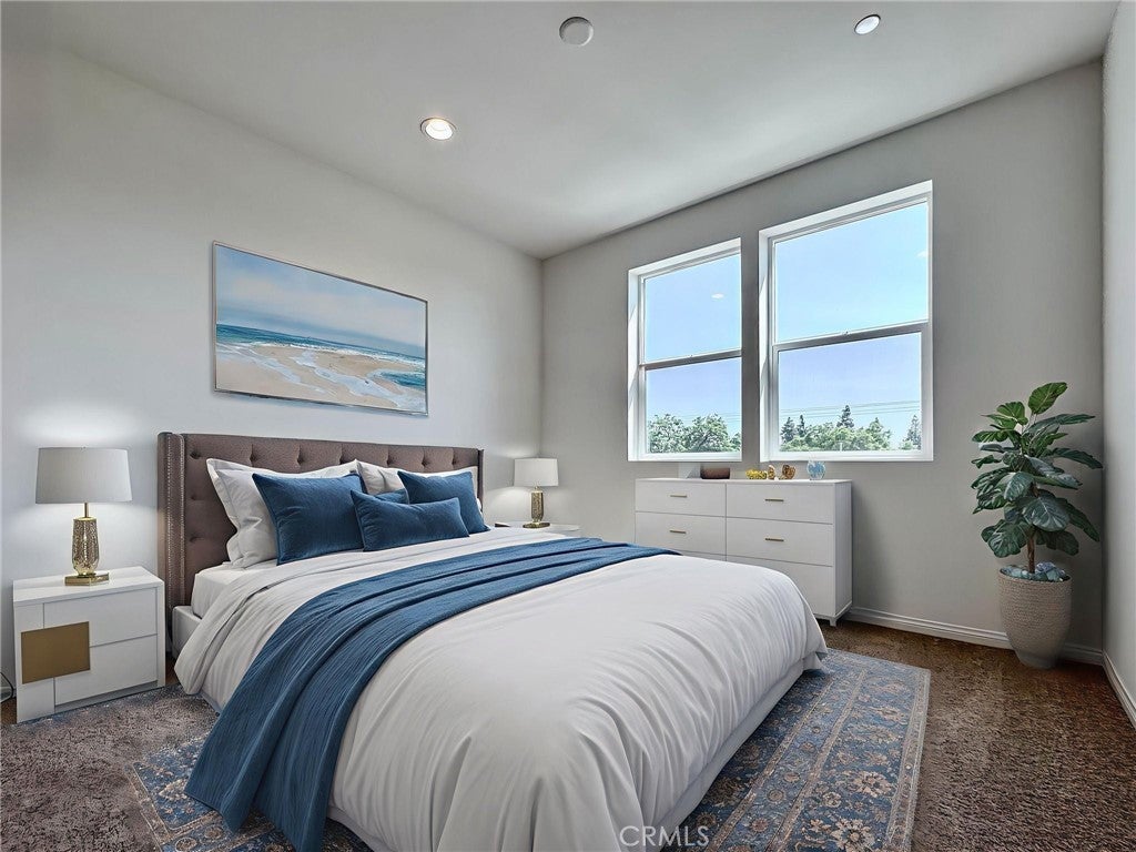 Enviable Dream Home: Tri-Level Townhouse with Sleek Modern Design This stunning, never-lived-in tri-level townhouse is a true standout in contemporary design, perfectly blending style, functionality, and comfort. Every corner reflects modern living at its finest, with smart, creative touches that make elegance effortless. The main level (2nd floor) features an inviting living room, dining area, chef-inspired kitchen, and a powder room with a pedestal sink—designed for both function and style. The kitchen boasts sleek quartz countertops, a food preparation island, deep-shelved pantry, and white cabinets with concealed hinges, complemented by a full suite of Samsung stainless steel appliances including a SmartThings dishwasher, electric range, microwave, and refrigerator. Luxury vinyl flooring flows seamlessly throughout the main level, while LED lighting illuminates the living spaces, creating a bright, welcoming ambiance. Faux wood blinds complete the contemporary window treatments. Upstairs, the primary bedroom retreat offers plush carpeting, recessed lighting, and mirrored closet doors. The en-suite bathroom features a quartz countertop, fiberglass shower stall with sliding glass door, and modern finishes for a spa-like experience. Two additional bedrooms—one with a walk-in closet—share a hallway bath with ceramic tile flooring, quartz countertop, and a Gerber toilet, providing both elegance and practicality. Paneled interior doors and plush carpeting throughout the staircase, hallway, and bedrooms add warmth and sophistication. Additional highlights include a single HVAC system with dual-zone controls, central A/C and heating, eight solar panels, a durable concrete tile roof, and Low-E dual-pane energy-efficient windows that flood the home with natural light while keeping energy costs low. Convenient double-stacked new LG Smart washer and dryer are included. Step outside to your private patio and enjoy magical views of Disneyland fireworks—perfect for relaxing evenings or entertaining guests. 2-car garage includes a sectional roll-up door, 220 V EV charger and direct interior access into the home. Thoughtfully designed, energy-efficient, and loaded with stylish finishes, this tri-level townhouse offers the perfect combination of comfort, convenience, and Anaheim charm. With brand-new construction, versatile living spaces, and premium features throughout, this home is exactly what you’ve been searching for.