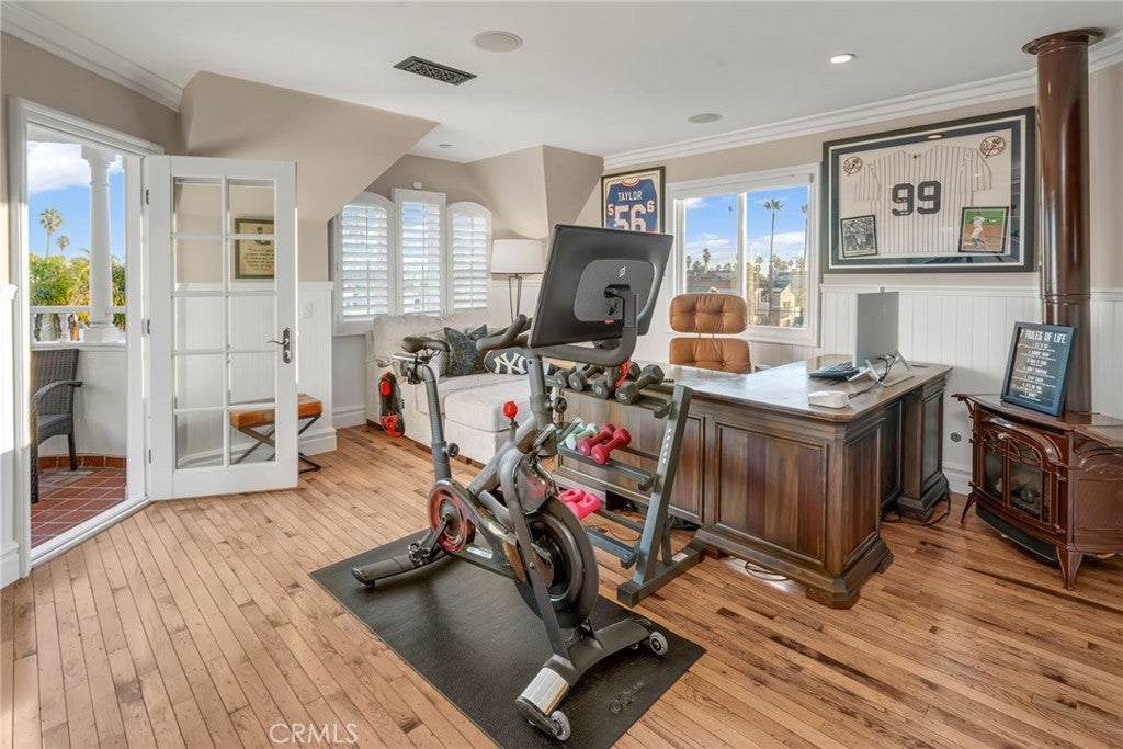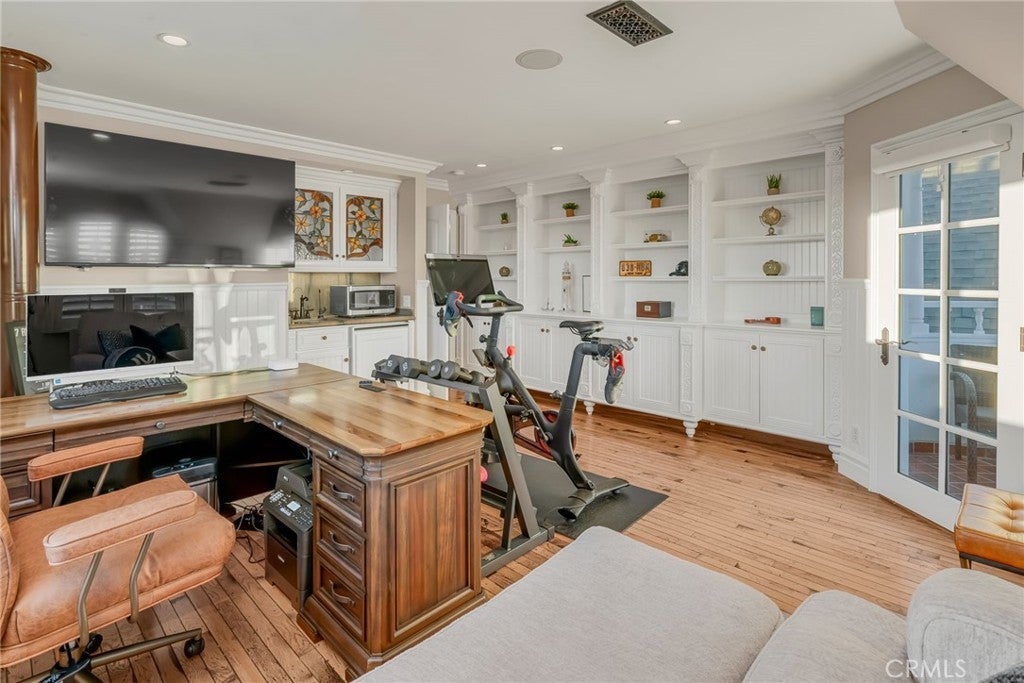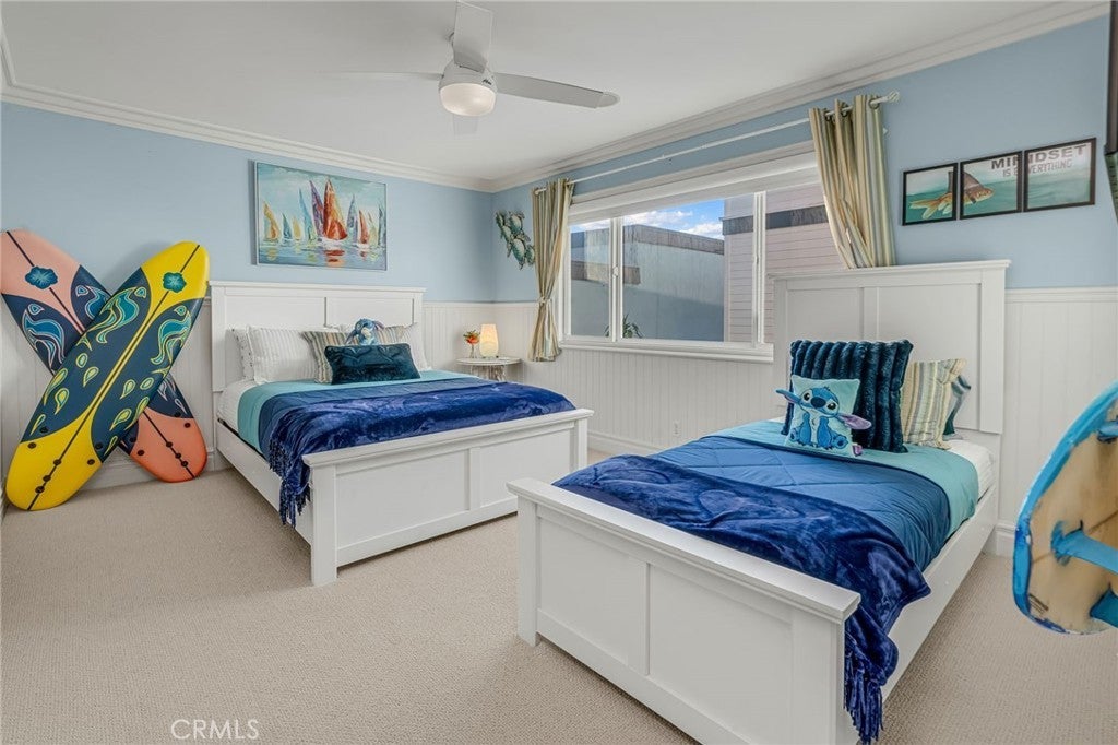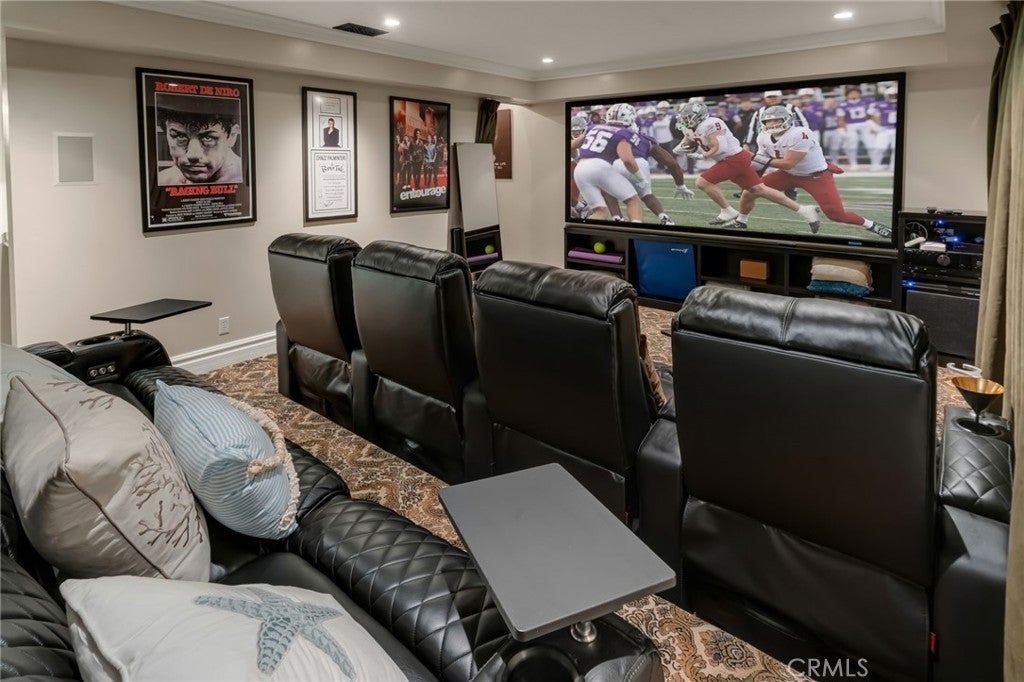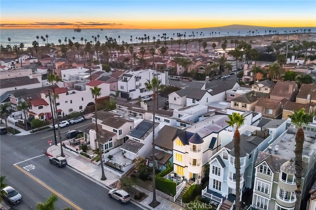 This Extraordinary custom-built beach home is located two blocks from the sand, in one of Huntington Beach’s most desirable coastal neighborhoods. This home stands out for its exceptional craftsmanship, timeless architectural details, and thoughtful design that blends coastal charm with upscale living. From the moment you arrive, the home impresses with its Victorian-inspired turret façade, wrap-around balconies, and picture-perfect curb appeal. Inside, every room showcases artisan-level detail, including coffered ceilings, rich wood flooring, custom millwork, and beautifully integrated built-ins. The heart of the home is the expansive chef’s kitchen, featuring a large island with Calcutta gold quartz, bar seating for five, custom cabinetry, a vintage-inspired range, and open shelving. The kitchen flows seamlessly into the light-filled family room, highlighted by intricate ceiling panels and French doors that open to the courtyard. Multiple entertaining spaces, both upstairs and downstairs, make this home ideal for gatherings. The welcoming formal living and dining rooms offer warm millwork, wainscoting, and cozy sitting areas, including a charming elevated lounge framed by columns and a brick alcove. Upstairs, the spacious primary suite is an oasis of comfort with its own private balcony, a sitting area, and plenty of natural light. The spa-inspired primary bathroom features a claw-foot soaking tub, a walk-in shower, and elegant finishes. Additional bedrooms are well-appointed, with custom wall treatments and coastal décor. The upstairs also includes a home office, complete with built-ins, and access to another balcony with ocean breezes. This home offers unique, high-value amenities rarely found this close to the beach, including: A full media/theater room with tiered leather seating and a massive 125-inch screen, A rooftop deck with hot tub, panoramic sunset views, and space for lounging or dining, Multiple balconies with neighborhood and palm-tree-lined sightlines, A private courtyard patio perfect for morning coffee or evening relaxation. This home is in the boundaries of Agnes L Smith Elementary, Ethel Dwyer Middle, and Huntington High—all highly rated schools. Enjoy the oceanfront bike path, Pacific City, Huntington Beach Farmers Market, and Surf City Nights. The pier and popular off-leash dog beach are within walking distance. Your dogs can enjoy the sand and the surf while you relax.
