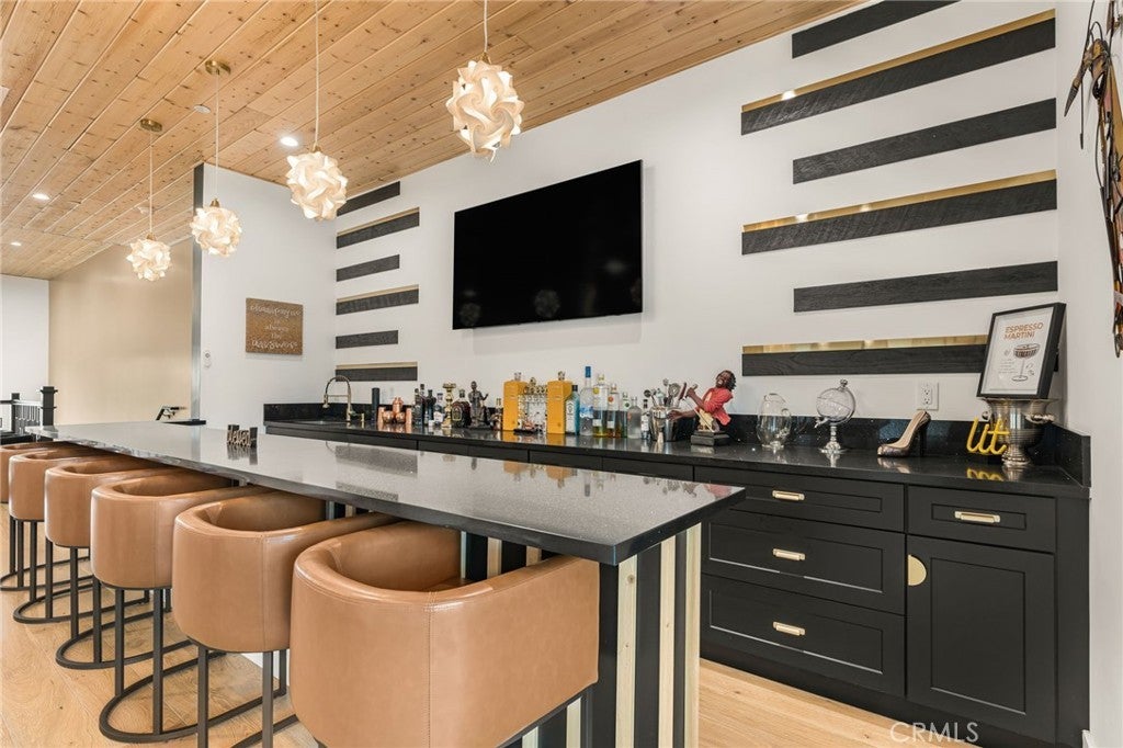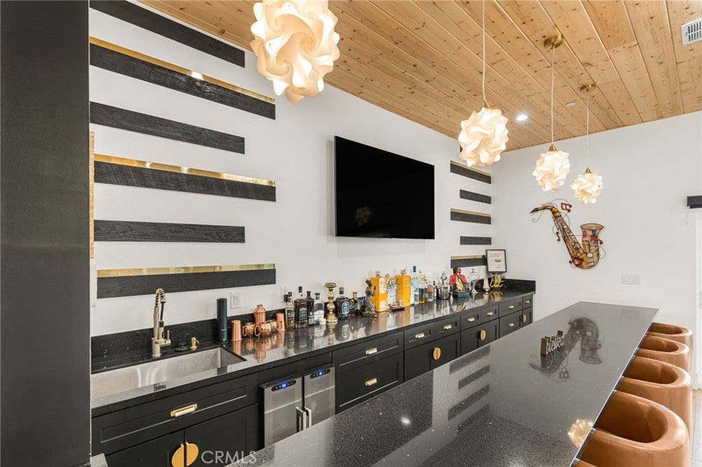 Breakfast Bar, Built-in Features, Ceiling Fan(s), Cathedral Ceiling(s), Eat-in Kitchen, High Ceilings, Pantry, Stone Counters, Recessed Lighting, Bar, Bedroom on Main Level, Entrance Foyer, Primary Suite, Utility Room, Walk-In Pantry, Walk-In Closet(s), Brick Walls, Wired for Sound, Wood Product Walls