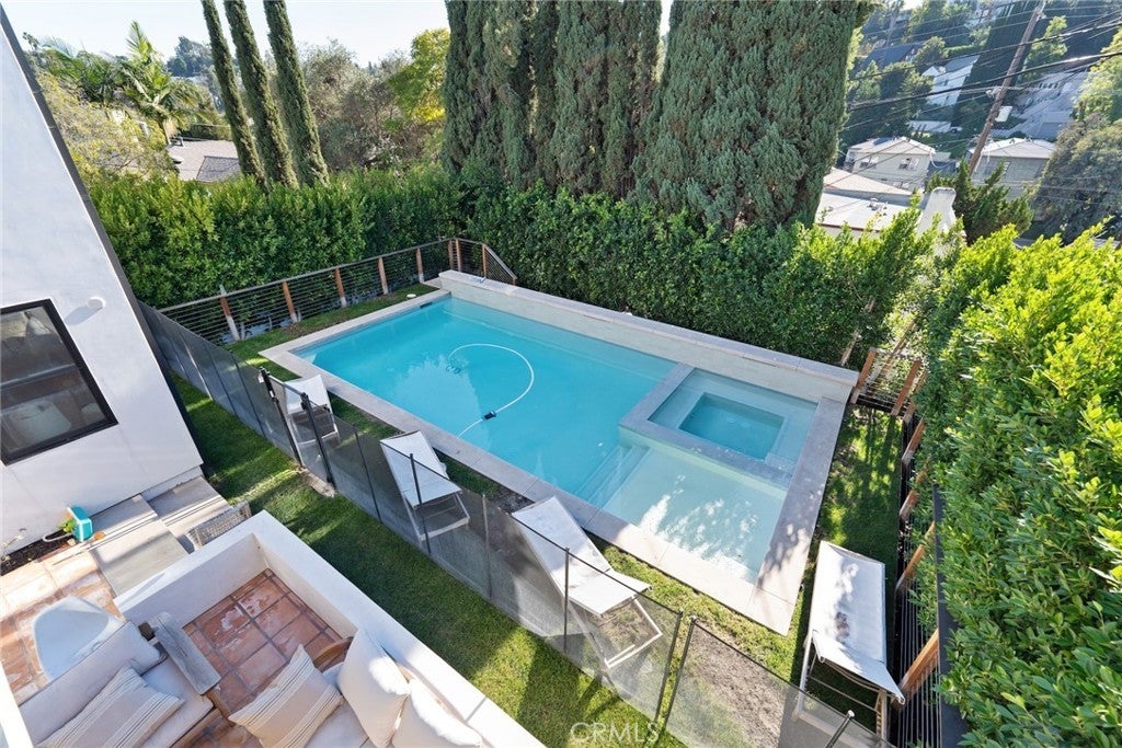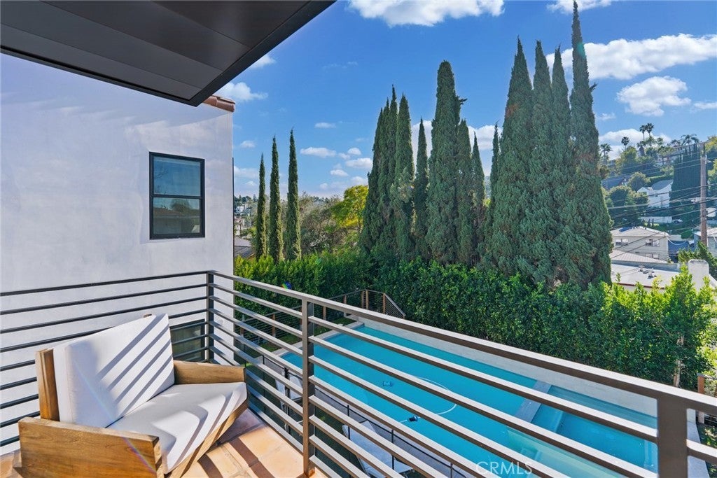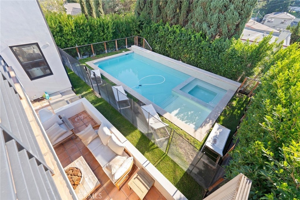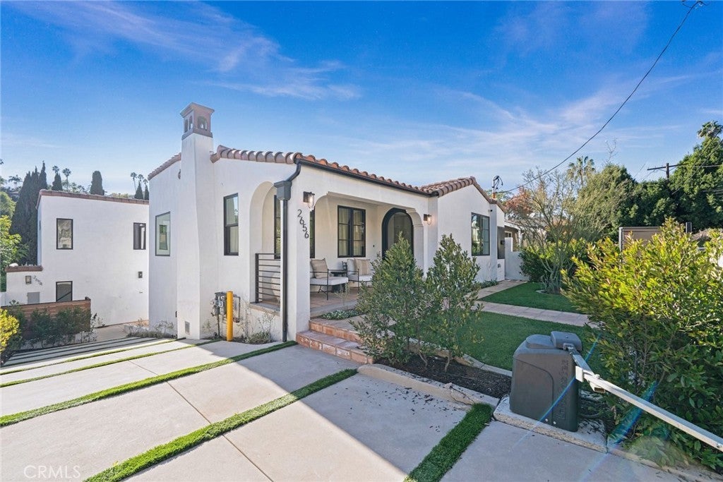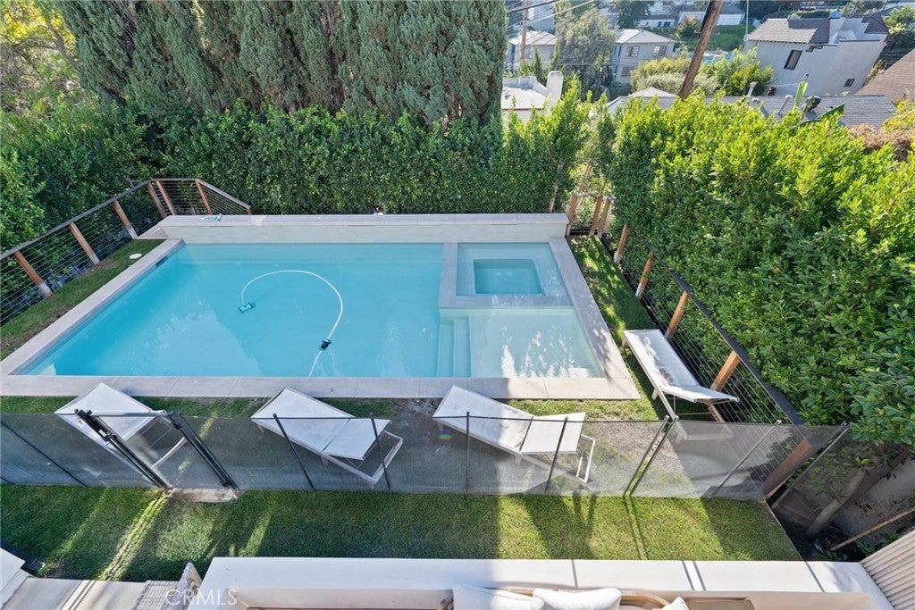 $100K Price Improvement. A rare opportunity to secure a fully gated, architecturally reimagined Silver Lake estate offering exceptional privacy and resort-style living. In 2023, the home was rebuilt to the studs and expanded with a new second story, totaling 2,773 sq. ft. The property also includes a newly built two-story 809 sq. ft. ADU and a newly constructed heated saltwater pool, spa, baja shelf, framed by mature trees, privacy hedging, and new hardscape. Located within the Ivanhoe School District and moments from the Silver Lake Reservoir and neighborhood dining and shopping, the home offers tranquility without compromise. The main residence features two true primary bedroom suites (one upper level, one lower level), an additional upstairs bedroom, a downstairs den opening to an outdoor dining area, multiple decks, and a flexible bonus space for office, gym, or storage. Past the newly landscaped front yard and custom iron front door, the home opens to a living room with an updated fireplace and chimney, flowing into a chef’s kitchen with slim-shaker soft-close cabinetry, Calacatta Taupe Quartzite counters and island, Zia Zellige backsplash, Rejuvenation hardware, Newport Brass fixtures, and a Thermador appliance suite. The dining area overlooks Cyprus trees and the pool, with a nearby flexible room for office or family use. Upstairs features the upper-level primary suite in a private wing with walk-in closet, balcony, and spa bath with Calacatta Gold marble dual vanity, Kohler rain shower, and Zia Zellige tile, plus an additional bedroom, hall bath with Crema Breccia finishes, and full laundry with custom cabinetry and LG stackable washer/dryer. The lower-level primary suite includes a Crema Marfil marble vanity and direct access to the den and backyard. Exterior features include a newly built heated saltwater pool with three linear fountains, Akuza Sky porcelain tile backsplash, removable pool safety fence, Ipe railing, Saltillo exterior flooring, new irrigation, mature Ficus and Carolina Cherry hedges, smooth plaster perimeter walls, and a remote- and app-controlled driveway gate. Additional improvements include upgraded and new foundations, new roof and insulation, new ABS sewer lines with sump pump and ejectors, new plumbing, new 200-amp electrical system with smart wiring and EV charger, dual-zone HVAC with Nest thermostats, Marvin fiberglass-clad wood windows and accordion doors, concrete driveway, and smart dimmers throughout.