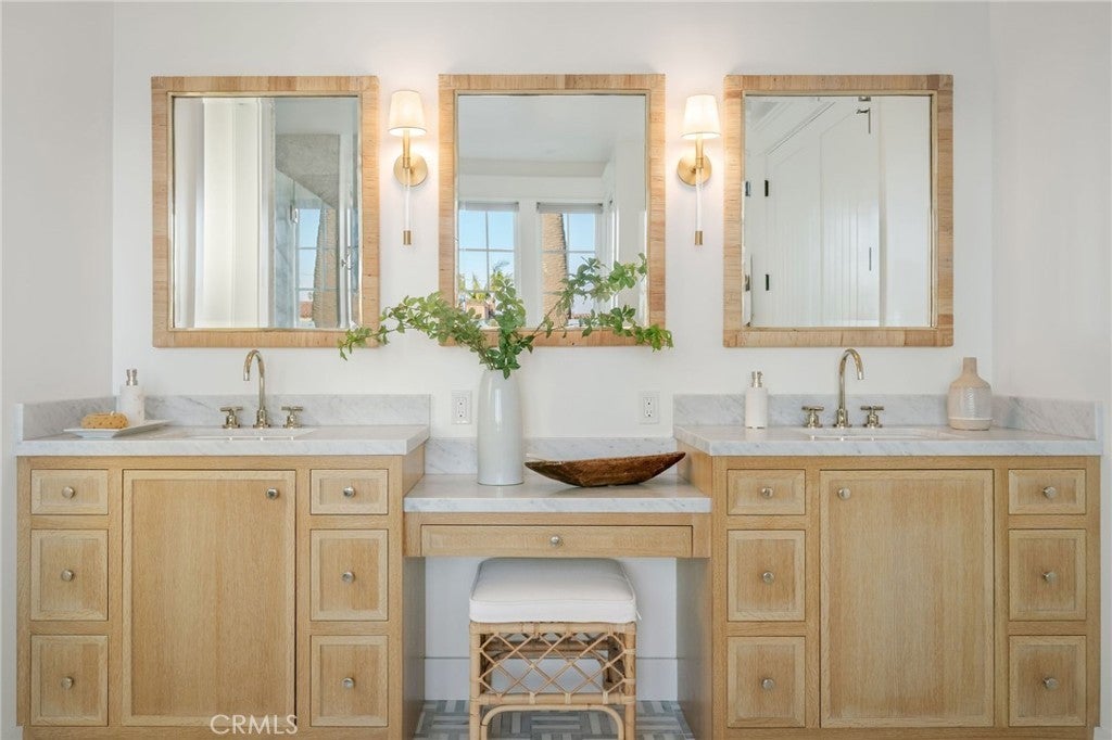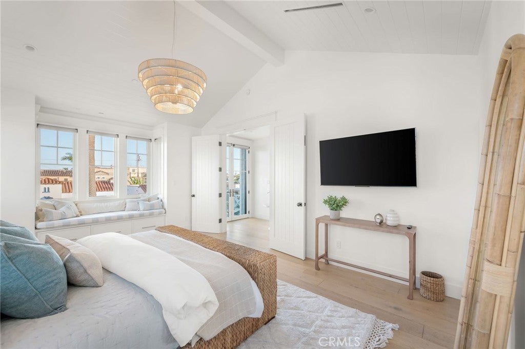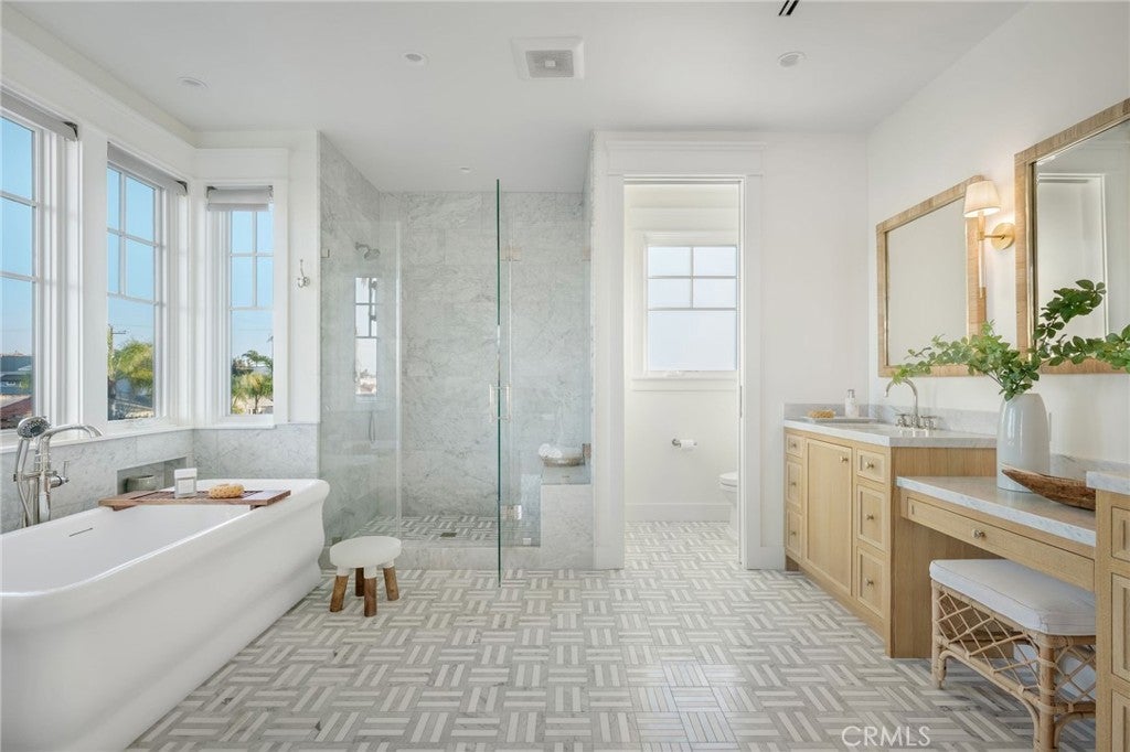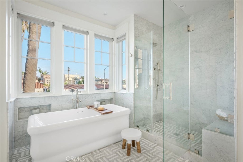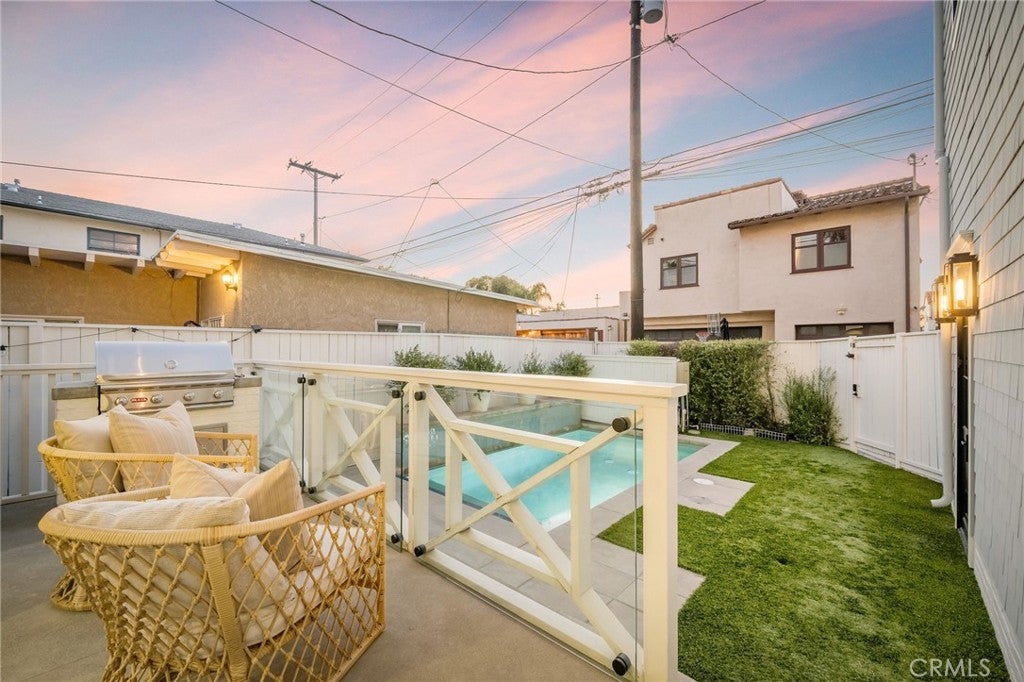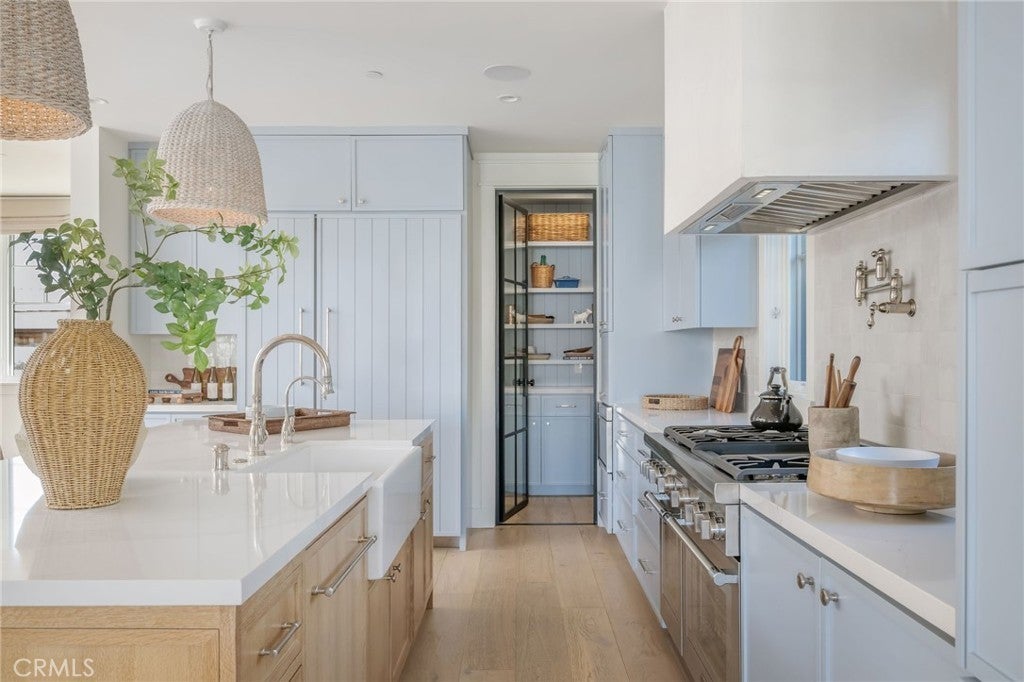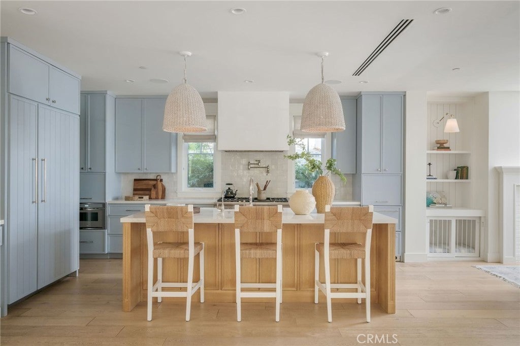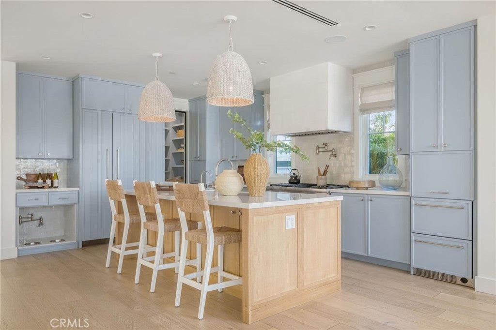 Welcome to 153 Granada Avenue ~ an exquisite 5 bed, 4 bath designer’s own POOL home, situated on a rare LOT AND A HALF and offering gracious Coastal Living in highly desirable & vibrant Belmont Shore. Built from the ground up in 2023 with meticulous attention to detail & unparalleled craftsmanship throughout, this spacious, light-filled property seamlessly blends classic Cape Cod architecture with cool, contemporary finishes in an open floor plan that are sure to please the most discerning buyer. Captivating curb appeal & an inviting front porch with cozy seating areas & fire pit for year-round indoor/outdoor living beckon you inside, where soaring ceilings & gorgeous wide plank white oak floors accentuate a stunning Great room & dining area, each with their own fireplace, a lovely bath, and a dramatic, glass enclosed office/5th bedroom. The well-appointed gourmet kitchen is centered around a huge island with an incredible Shaw’s Farmhouse sink, quartz countertops, zellige tile backsplash, luxury Thermador appliances, custom cabinetry, walk in pantry & adorable built-in doggie eating area with its own pot-filler! The upper level is graced by a serene primary retreat with a large spa-like bath, highlighted by beautiful dual vanities, stunning heated marble tile floor, sumptuous soaking tub & roomy shower. Two additional bedrooms share a luxurious oversized hall bath, adjacent to the 4th en suite bedroom, while a rooftop deck with 360-degree neighborhood views affords even more entertaining space in this truly one-of-a-kind residence. Outside, enjoy warm summer days swimming in the spool (spa/pool) with child-safe automatic cover or grilling on the deck in this lushly landscaped, private backyard. Other notable amenities include a 2-car finished garage with epoxied floors & additional parking apron in back, 400 amp electrical panel with electric car charging station, paid off solar panels, tankless hot water heaters, spectacular Lincoln windows with automatic shades, gorgeous woodwork, linear AC grills, Brilliant Smart Home system, in-ceiling speakers & WIFI hubs, upstairs coffee/drink bar, 4 window seats with custom cushions and so much more!
