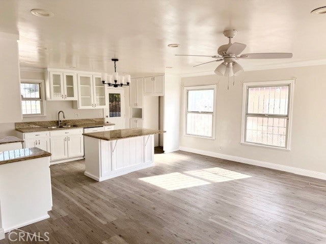 Charming 3 bedroom 1 bath home. Remodeled and ready to move in. Beautiful white kitchen with large island and granite countertops, open to the living room. One master bedroom and two secondary bedrooms. Tiled bathroom with shower in tub. Vinyl flooring, recessed lighting, crown molding, ceiling fans and double-paned windows throughout. Dishwasher and range hood included. Washer and dryer connections. Front yard and two assigned parking spaces in front of the house. Property is a duplex, no access to garage, no access to back yard. Must see!
