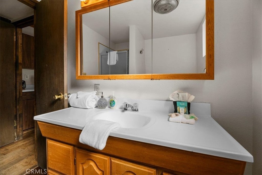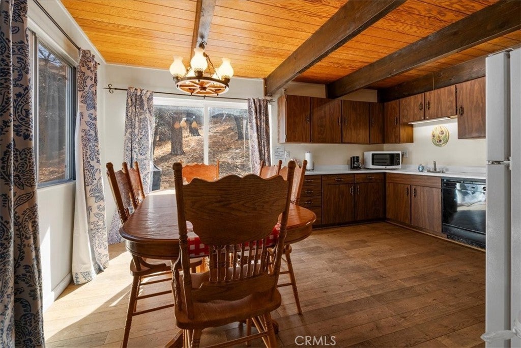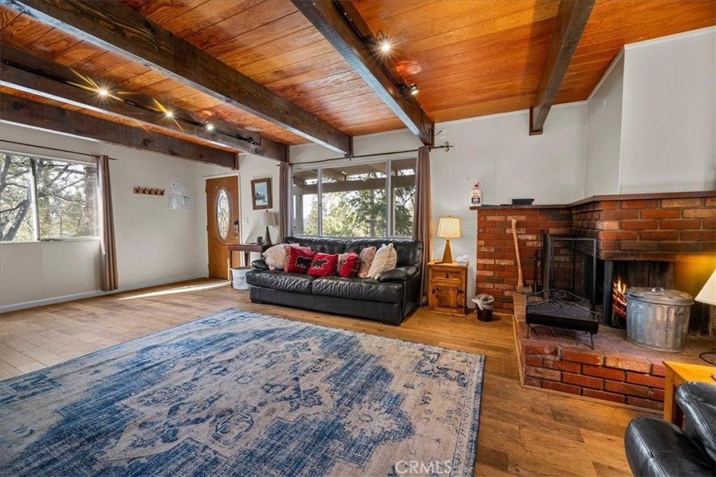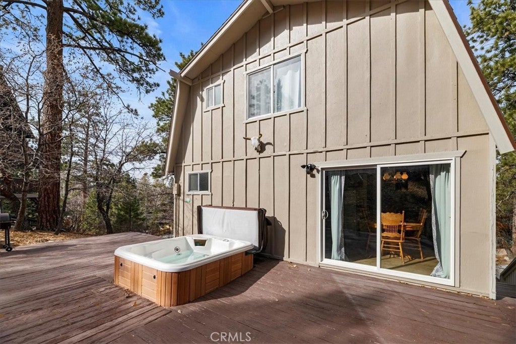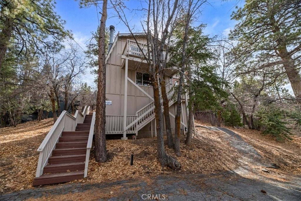 Location, Location, Location....Experience the best of mountain living in this charming cabin, offering two fantastic ways to enjoy the outdoors—an expansive rear deck perfect for BBQs and entertaining, and a relaxing outdoor spa under the starlit sky. The 1,320 sq ft home features warm wood floors, a rustic wood-beamed ceiling, and a cozy brick fireplace that sets the tone for a true mountain retreat. With three spacious bedrooms and a bathroom on each level, comfort is key. The front bedrooms open to a balcony with beautiful mountain and tree views, while the rear room is ideal as a bunk-room or kids’ zone. The open kitchen and dining area connect seamlessly, with direct access to the rear deck. Extras include a laundry room with washer/dryer, a pull-through driveway for easy snow removal, and great storage under the home. The large 9,460 sq ft lot adds to the sense of peace and privacy. Located in a hidden gem of Moonridge, you’re just minutes from Bear Mountain Resort, golf, hiking trails, and local attractions. Ideal as a personal getaway or income-generating rental, with many furnishings included—move in and start enjoying Big Bear today!