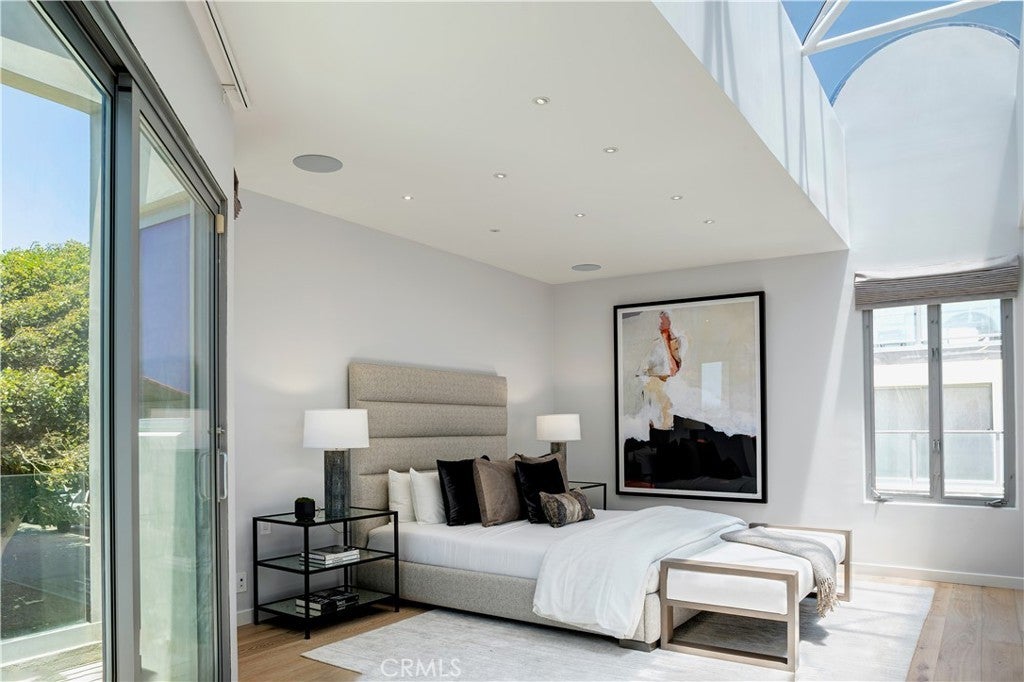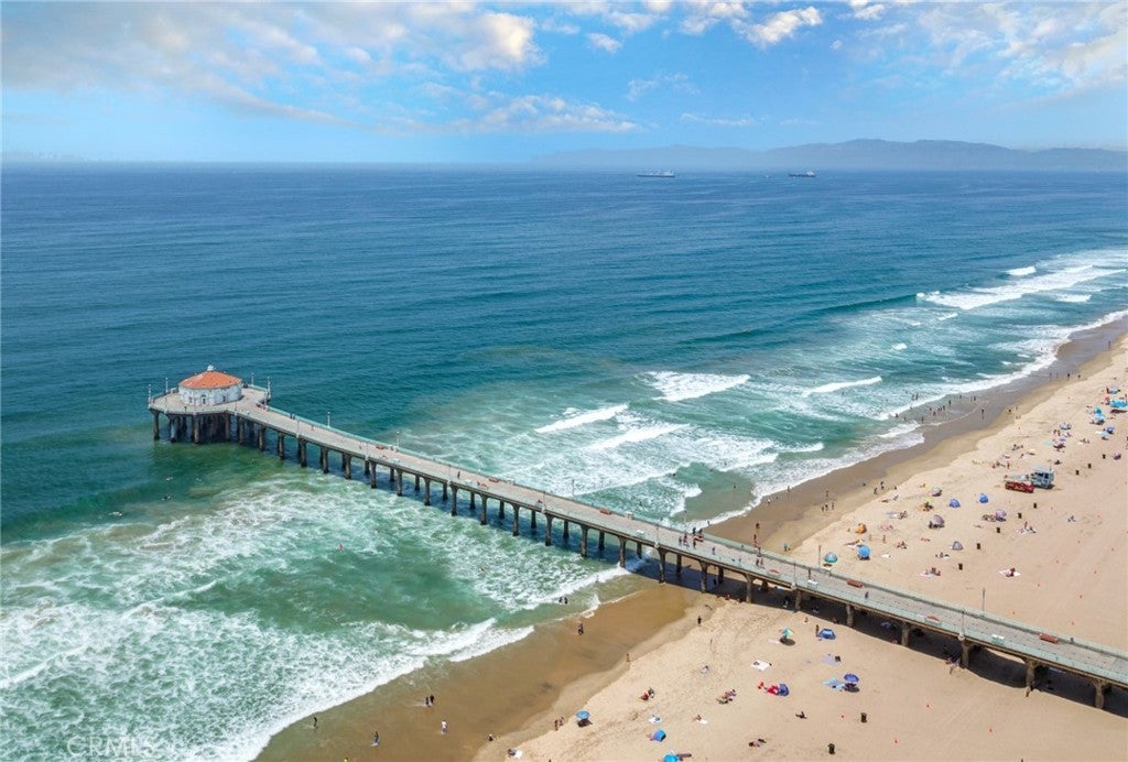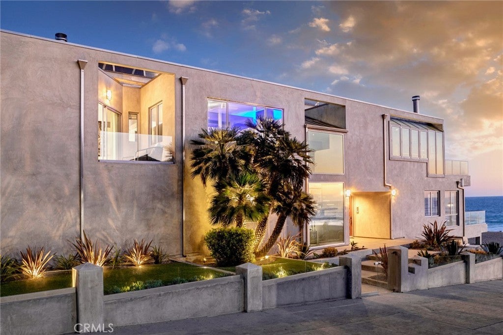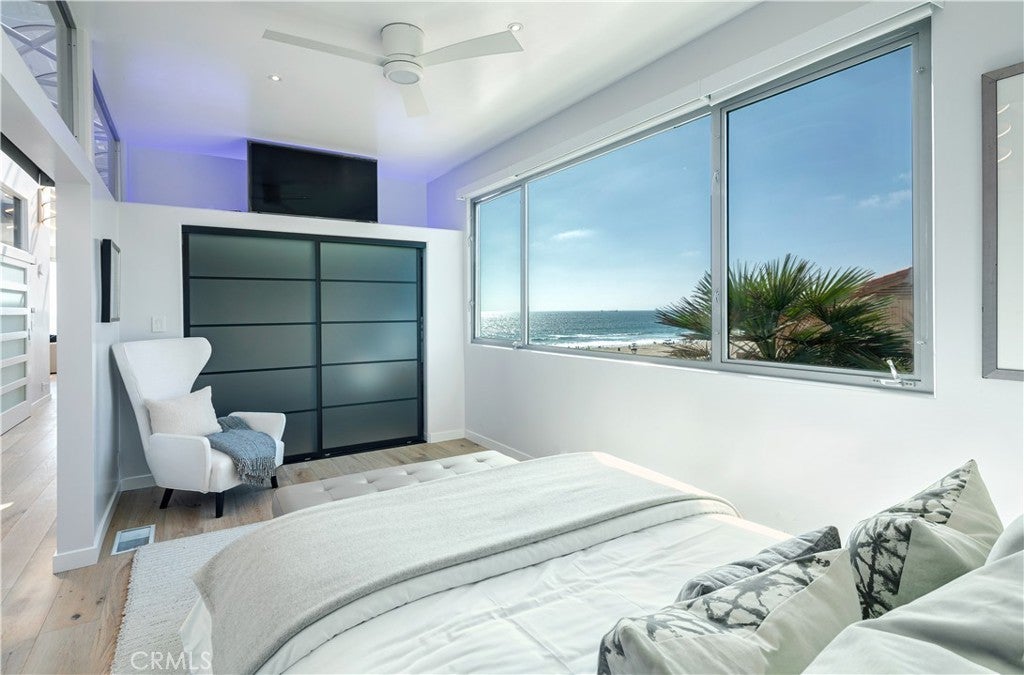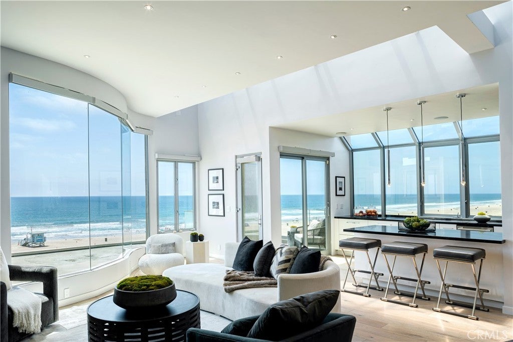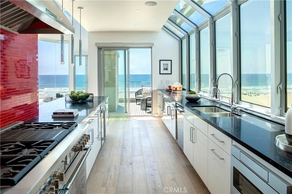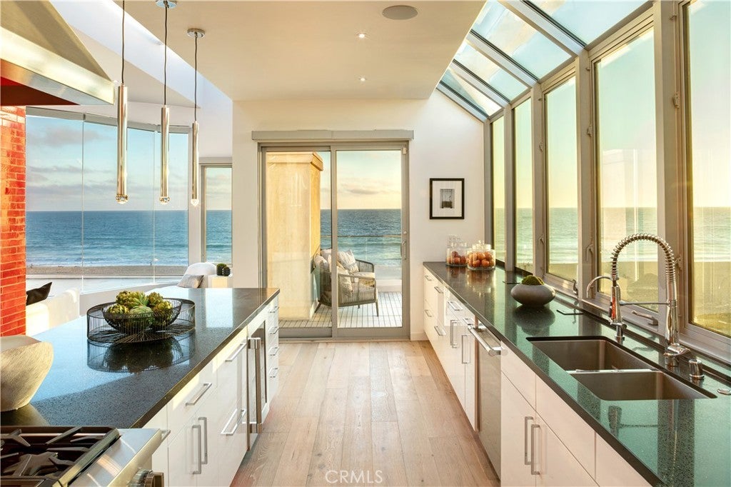 Experience the apex of Strand living at this ocean front Manhattan Beach property. For sale in one of the best spots in town, this striking contemporary penthouse residence, approx 2,740 sq ft, is where you can ponder uplifting panoramas of coastline, ocean and sky from one of 3 private decks, or step outdoors to surf and swim in the waves. This 3-bedroom, 4-bathroom Manhattan Beach Townhome is one of two at this prized corner address, where you enjoy an extra 105 feet of ocean views along the north-facing walk street—a rare property for sale. This Manhattan Beach Strand home was taken down to the studs for a total style and tech refresh. The result is a 2-level designer home where you wake in a fireplace master suite, checking surf from your bedroom patio before stepping into a 73-inch soaking tub or ThermaSol steam shower, with aromatherapy, lighting and sound controlled on iPad or smartphone. So is everything else in this smart home, from security and blinds to temperature, lights and music—even the Thermador oven. Walk down the hall to the sun-splashed living room and kitchen, where stunning ocean views are framed by French white oak floors and porcelain tiles. Enjoy breakfast in a chic kitchen filled with white Italian cabinetry and Thermador appliances before stepping onto the deck to savor Pacific Ocean breezes. The flow of the home is easygoing and sunlit, with an extra bedroom and bathroom on the lower level that’s ideal for guests or use as an office. This Manhattan Beach home caters to a versatile lifestyle, where quiet days can be spent working and enjoying the beach lifestyle, or entertaining friends over vivid sunsets on the deck and favorite vintages in the 450-bottle wine room gilded with Italian glass. At this central location, you can leave your car in the garage and cycle 5 minutes along the Strand to reach Downtown shopping and dining, or stroll 10 minutes to yoga or lunch at a sidewalk cafe in the charming North End.
