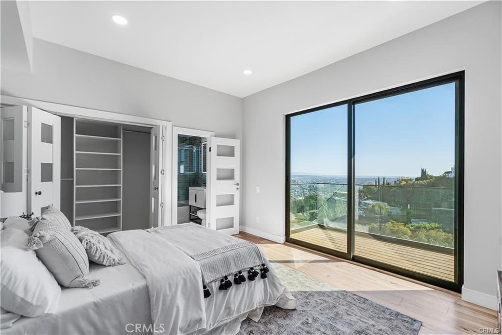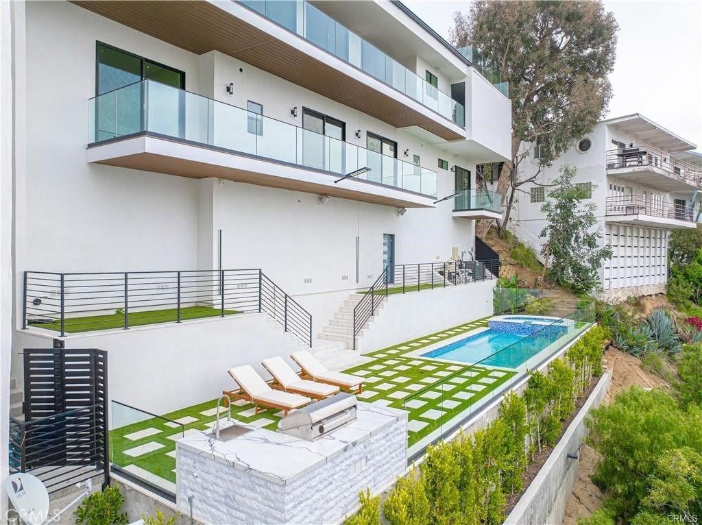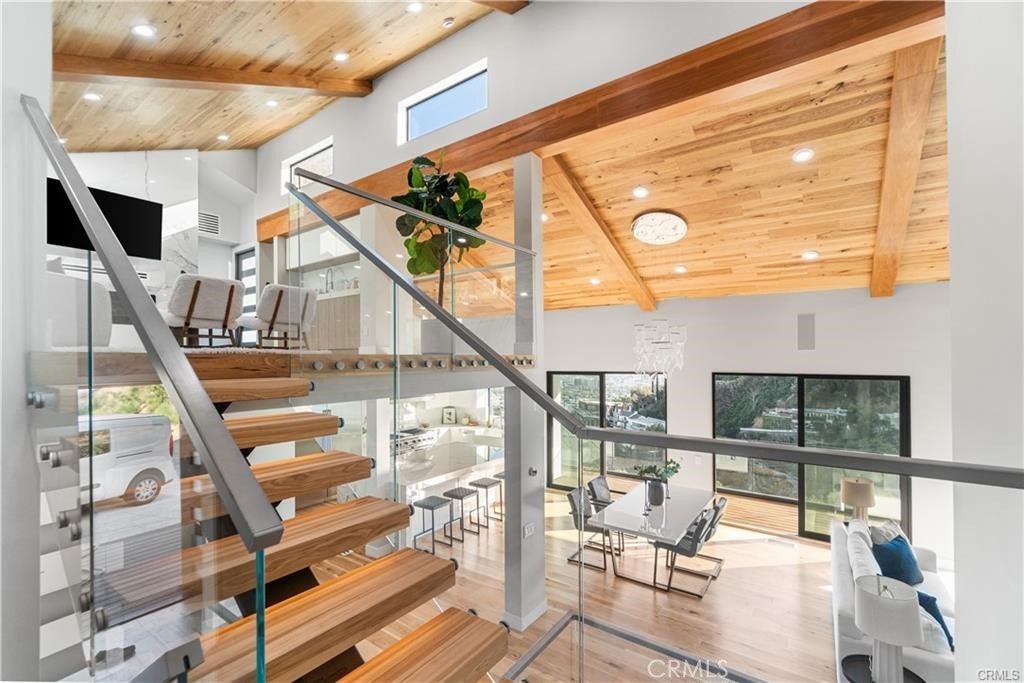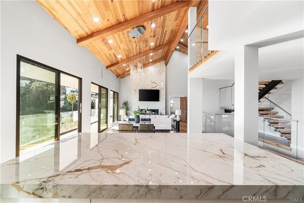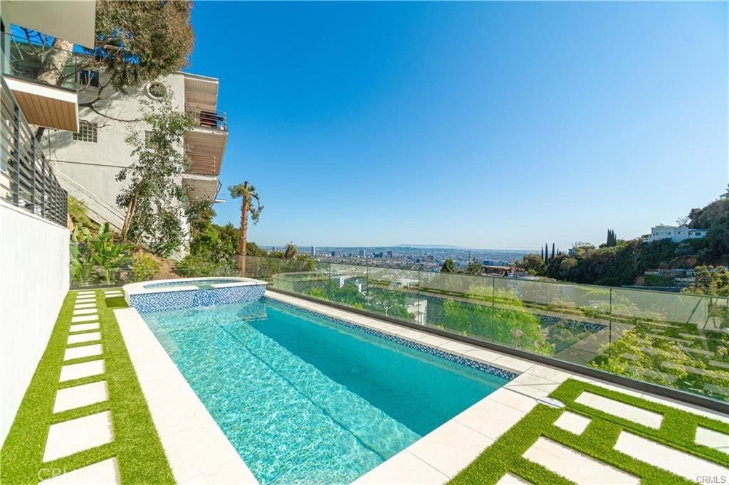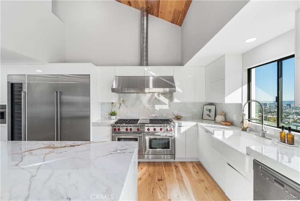 Perched above the legendary Sunset Strip, this 4,266 sq ft modern residence delivers breathtaking ocean views, inspired design, and high-end finishes in one of LA’s most exclusive neighborhoods. This four-level architectural home seamlessly blends modern luxury with smart home innovation, offering the ultimate in elevated indoor-outdoor living. Inside, soaring 21.5-foot ceilings, floating LED-lit stairs, and a solar-powered skylight flood the main living space with natural light and dramatic volume. Hickory Natural hardwood floors run throughout, while oversized porcelain slabs accent three floor-to-ceiling fireplaces, the chef’s kitchen backsplash, island, master bath walls, loft counter, and outdoor BBQ area. Enjoy sweeping ocean views from five of six bedrooms, the family room, chef’s kitchen, rooftop deck, and even the heated saltwater pool. The luxurious primary suite features vaulted ceilings, a fireplace, dual walk-in closets, and dual spa-style baths for a true retreat experience. The lower level hosts four private en-suite bedrooms, each with sliding glass doors opening to expansive rear-facing decks with dramatic southern views—ideal for guests, teens, or multigenerational living. A true entertainer’s dream, the gourmet kitchen is outfitted with Sub-Zero and Wolf appliances, an oversized island, and generous cabinet space. The home is built to entertain—featuring a rooftop deck, theatre, loft, and an outdoor kitchen with built-in BBQ and panoramic views. Designed for effortless indoor-outdoor living, eight Fleetwood sliding doors open to limestone-paved exteriors, a heated saltwater pool and spa with LED lighting, solar landscape lighting, and two NEMA 14-50 EV charging outlets. Seven steel-framed mahogany pivot doors—including the main entry and six bedroom entries—add warmth and elegance to the home’s sleek modern aesthetic. Smart home systems control lighting, fireplaces, pool, irrigation, security, theater, and climate—all from your fingertips. A rare opportunity to own a custom-crafted modern home with luxury finishes, iconic views, and seamless indoor-outdoor flow—minutes from the Sunset Strip, yet a world apart.