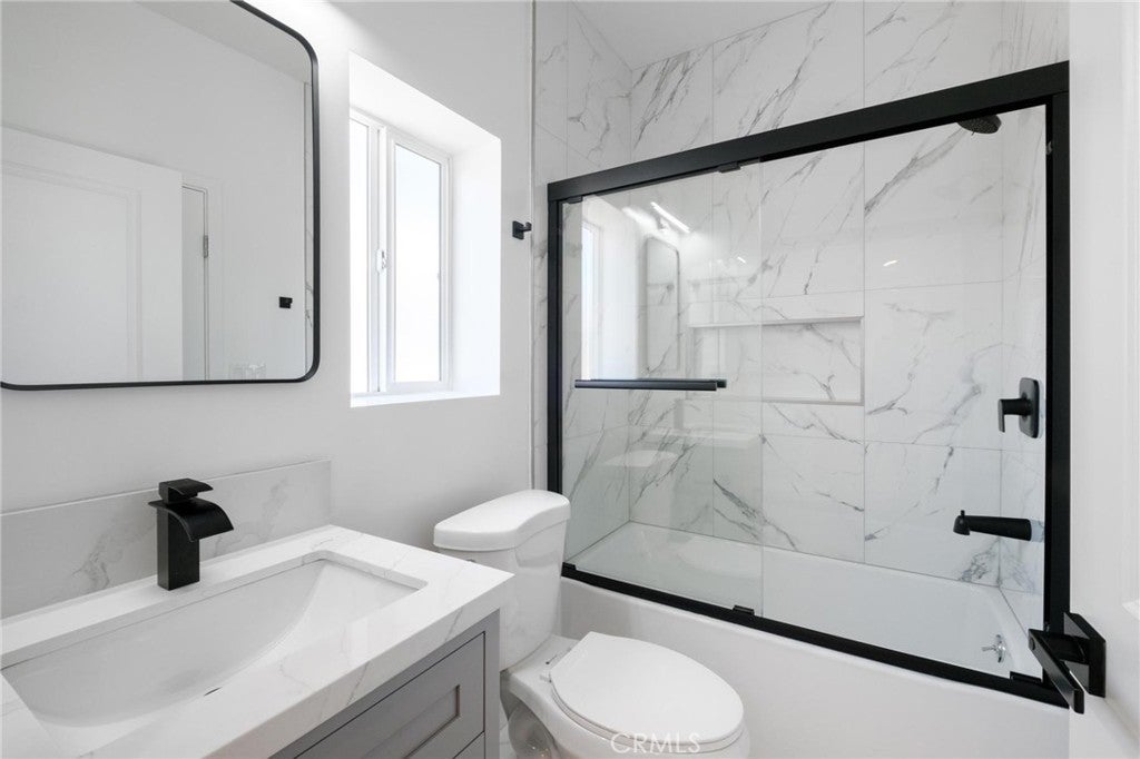 Beautifully remodeled two-bedroom, two bath upper unit in a great area of Van Nuys. The two bedrooms include one primary bed with a private bath and the second bedroom has direct access to the hall bath. Additional features include wood floors throughout, heating and air conditioning, new appliances included, private washer and dryer in the unit, double pane windows for comfort and quiet and one parking space.