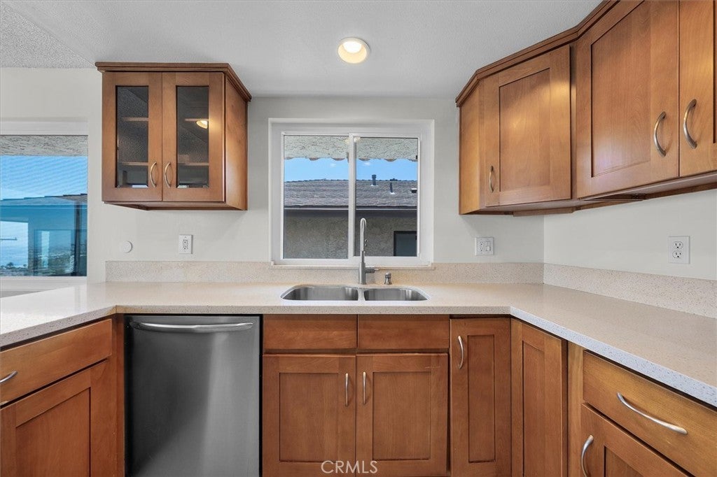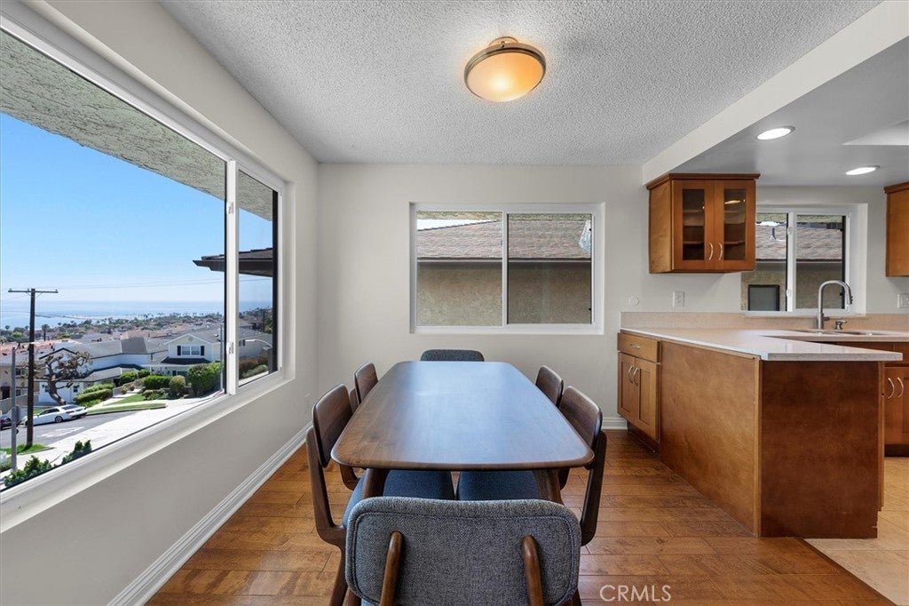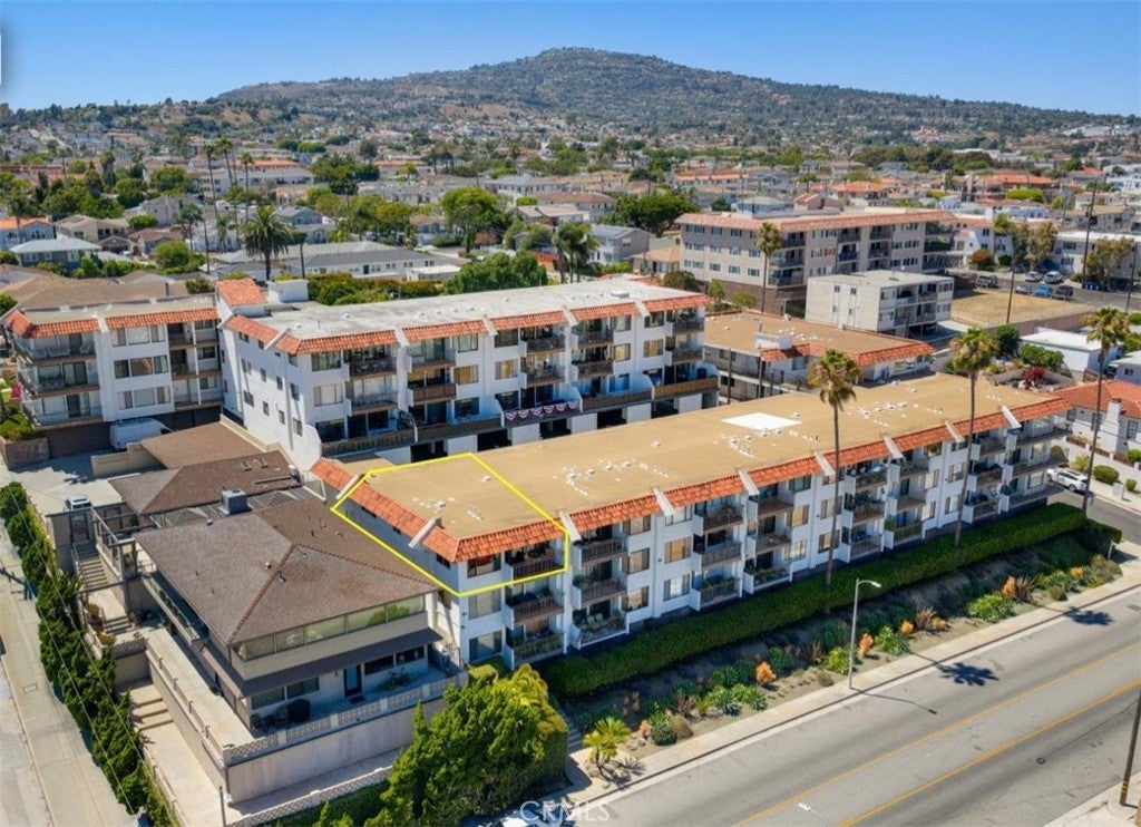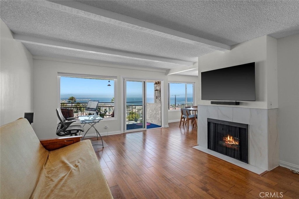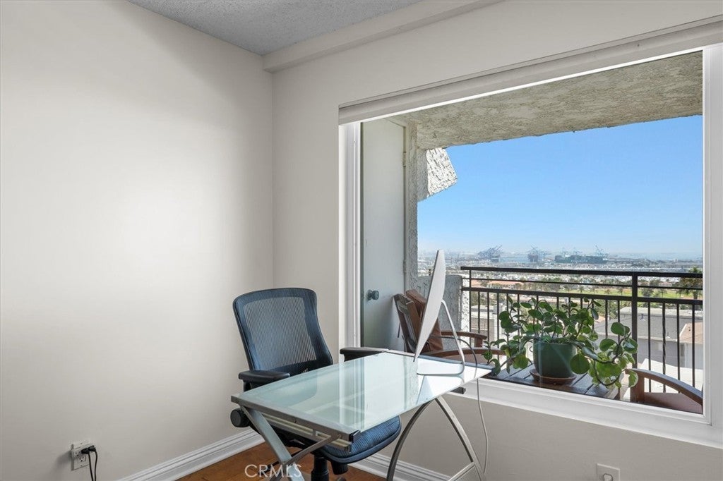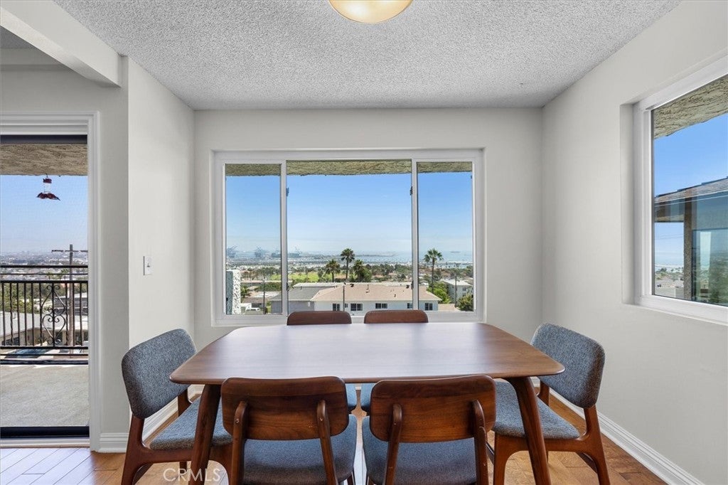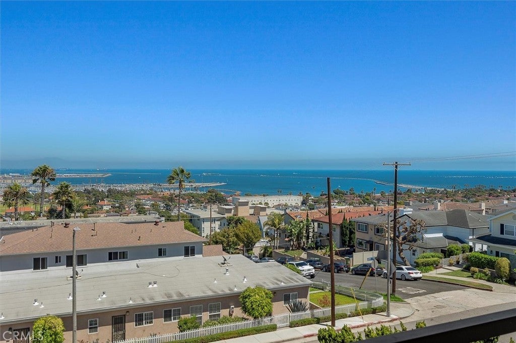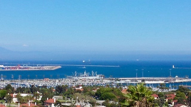 Unobstructed, panoramic views of the ocean, harbor and mountains from this front buildings corner penthouse end unit. Rarely available top floor 2bed, 2 bath in Bay View Terraces in the Palisades of San Pedro. One shared wall. Remodeled kitchen with custom cabinets, quartz countertops, stainless steel appliances, recessed lighting, tile flooring. Upgraded energy efficient double pane windows that will keep you cool in the summer, warm in the winter and whisper quiet when closed. Spacious primary bedroom with en suite bath, frameless glass shower and modern finishes. Second bedroom is generous in size. Beautiful engineered hardwoods, tile, vinyl (guest bath). Freshly painted. In unit laundry with Speed Queen washer and dryer. The unit comes with 2 side by side parking spaces and overhead storage. Complex amenities include: pool, spa, gym, free high speed internet (1gig!), beautiful grounds. Conveniently located near Cabrillo Beach Point Fermin, Korean Friendship Bell and the new multi million dollar development West Harbor. Don’t miss this rare opportunity for a view that will bring you decades of peace and relaxation as you gaze over the ocean.