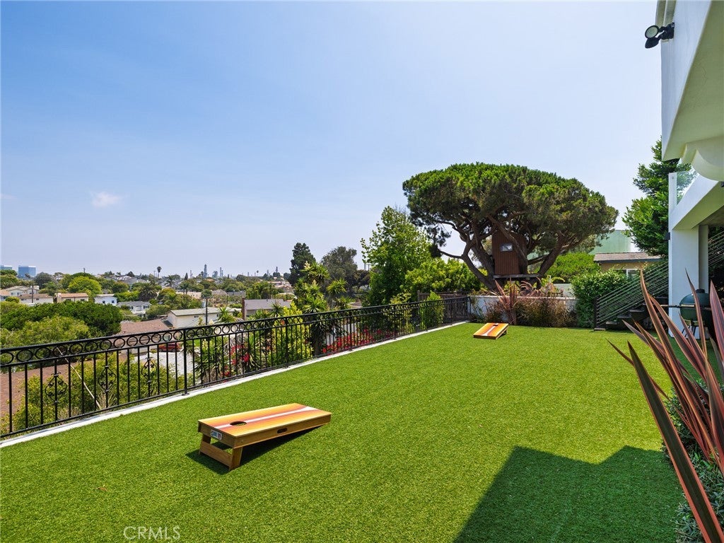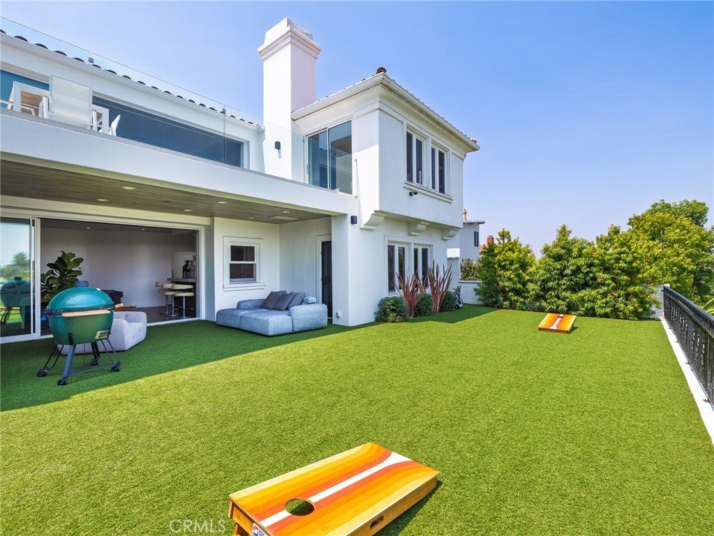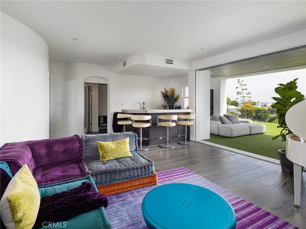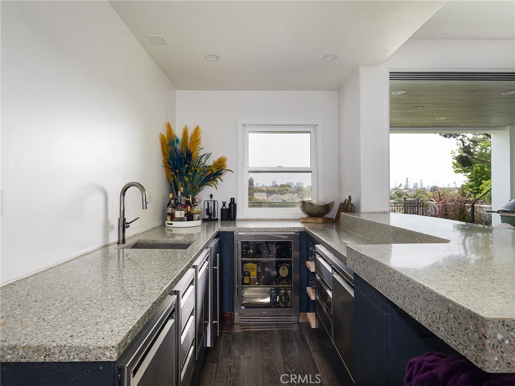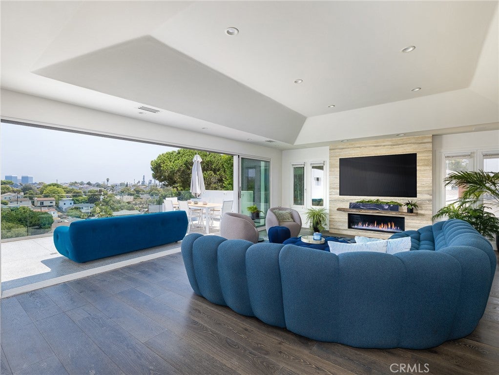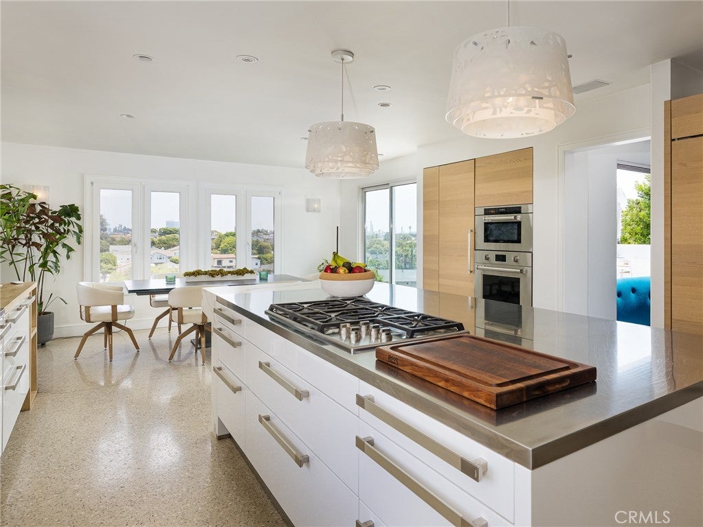 Perched on one of El Segundo’s most elevated and sought-after streets, this fully updated Mediterranean luxury estate sits at the end of a quiet cul-de-sac, offering unobstructed, breathtaking views of the city skyline. With over 4,500 square feet of refined living space, this home was thoughtfully designed for both elegant living and effortless entertaining. Upon entry, you're greeted by a seamless blend of indoor and outdoor living. Both levels feature 16-foot stacking glass multi-slide doors, creating a smooth connection between the sunlit interiors and expansive outdoor terraces. The result is a true entertainer’s dream, where panoramic views and sophisticated finishes set the tone. The first floor offers a media and entertainment space unlike any other, complete with a 97” Samsung TV, embedded Bowers & Wilkins speakers, a handcrafted terrazzo glass bar, sleek fireplace, wet bar, and custom feature wall. Slide open the aforementioned doors to reveal a beautifully remodeled backyard perfect for entertaining. This level also includes a large primary suite with a fully updated bath, a second spa-like bathroom with sauna situated between two spacious bedrooms, and a conveniently located laundry room. Upstairs, the gourmet kitchen—crafted by Euroconcepts of Beverly Hills—features Italian Arclinea custom cabinetry, Sub-Zero refrigeration, Wolf appliances, an espresso bar, floating hood, and sweeping neighborhood and park views. The open-concept layout flows into the stylish living room, anchored by a modern fireplace and opening to an expansive deck—ideal for indoor-outdoor gatherings. The second-floor primary suite is a sanctuary of its own, boasting high-end finishes, a huge walk-in closet, a dedicated laundry area, and an updated bathroom with separate tub and shower. Two additional office spaces and another upgraded full bath complete the upper level. Additional highlights include: central AC throughout, a private elevator, an oversized driveway fitting multiple cars, and two separate garages offering a total of 3 garage spaces A rare offering with commanding views, cutting-edge design, and exceptional functionality—this estate is a must-see for buyers seeking luxury living in El Segundo.