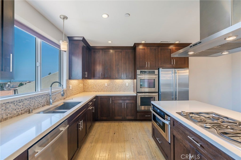 LUXURIOUS-CONTEMPORARY TOWNHOUSE W/ AMAZING PANORAMIC OCEAN VIEWS, HIGH-END AMENITIES & 2-CAR GARAGE CLOSE TO SHOPPING & 6 BLOCKS TO BEACH. ZONED FOR TOP SCHOOL DISTRICT (Pre K – 12). Luxury Townhouse with Panoramic Ocean Views – Available August 2025. This 3 bedroom, 2.5 bathroom home offers approx. 1,900 sq. ft. of living space plus an additional 300 sq. ft. ocean-view patio. Includes a two-car garage with ample storage, guest carport and plentiful street parking. The upper-level great room features a skylight, creating a bright and airy living space, while the living room includes a fireplace and French doors that open to a balcony with unobstructed views stretching from the Palos Verdes peninsula to Malibu. The modern open-concept kitchen boasts quartz countertops and high-end Jenn Air stainless steel appliances including a five-burner gas stove, with an adjacent dining area perfect for entertaining. All bedrooms are on the same floor; the primary suite features ocean views, a walk-in closet, and a luxurious bath with Kohler fixtures and a hydro-jet tub. Secondary bedrooms have mirrored closets with built-in organizers, and the second bedroom also offers ocean views. Wide-plank hardwood floors highlight common areas, with carpet in bedrooms and tile in bathrooms. A laundry closet on the second floor includes full-sized LG washer and gas dryer, and a tankless water heater adds efficiency. Technology and extras include two wall-mounted 42" flat-screen TVs in guest rooms, wiring for surround sound, satellite/cable and ADT, plus intercom and camera readiness. Well-maintained common grounds feature attractive landscaping. Ideally located just six blocks from the beach (less than an eight-minute walk) and about three miles from the 405 freeway, this home is also zoned for highly rated schools (Pre-K through 12) and is a short drive to shopping and dining. Small pets may be considered with an additional price premium to rent. This townhouse offers modern amenities, stunning ocean vistas, and convenient access to both the beach and major freeways—it’s a must-see to fully appreciate the quality and comfort it provides. $100 monthly premium to be added to the listing price if the owner approves a small dog pet application. Available for lease until until May 2027 (negotiable) with annual lease extensions only.
